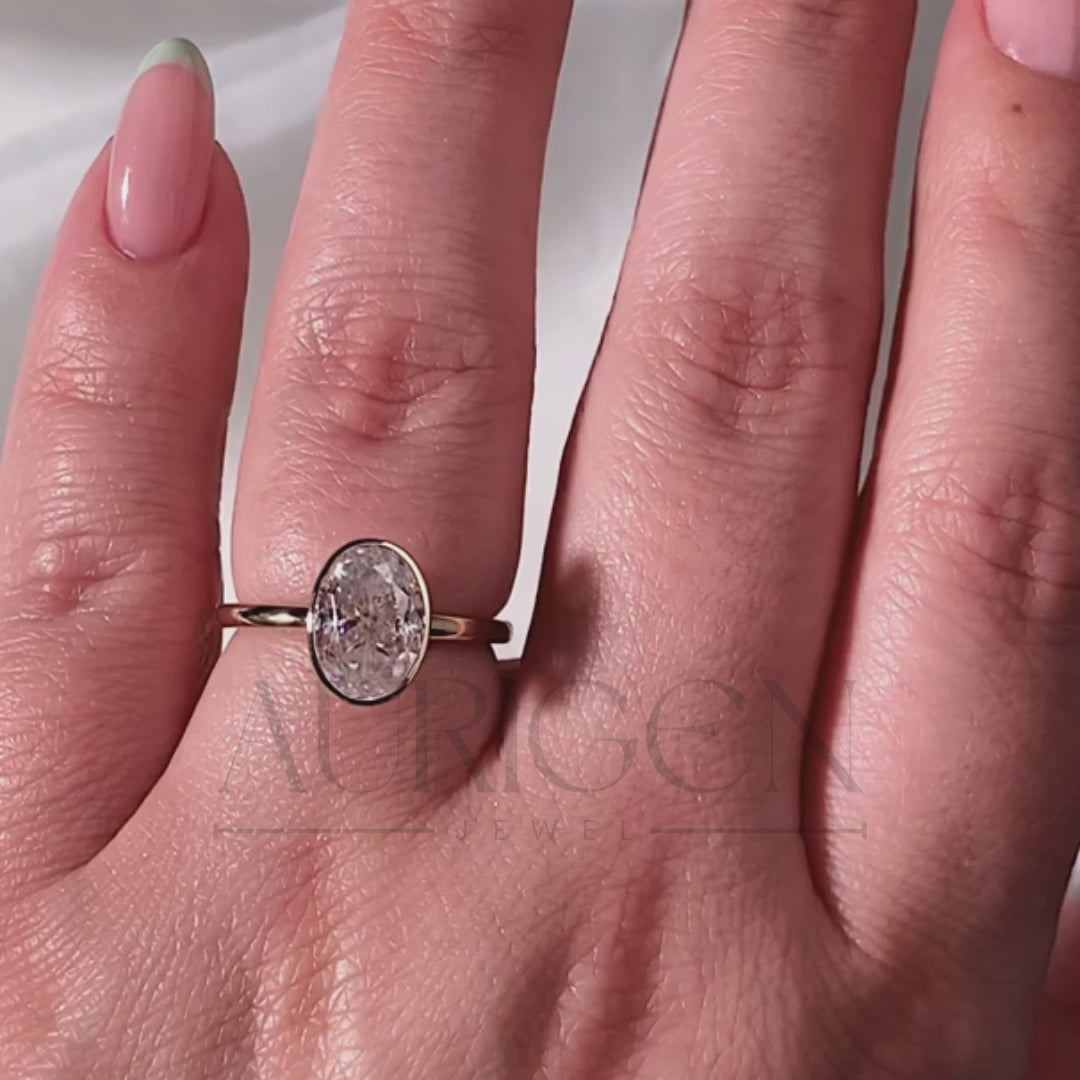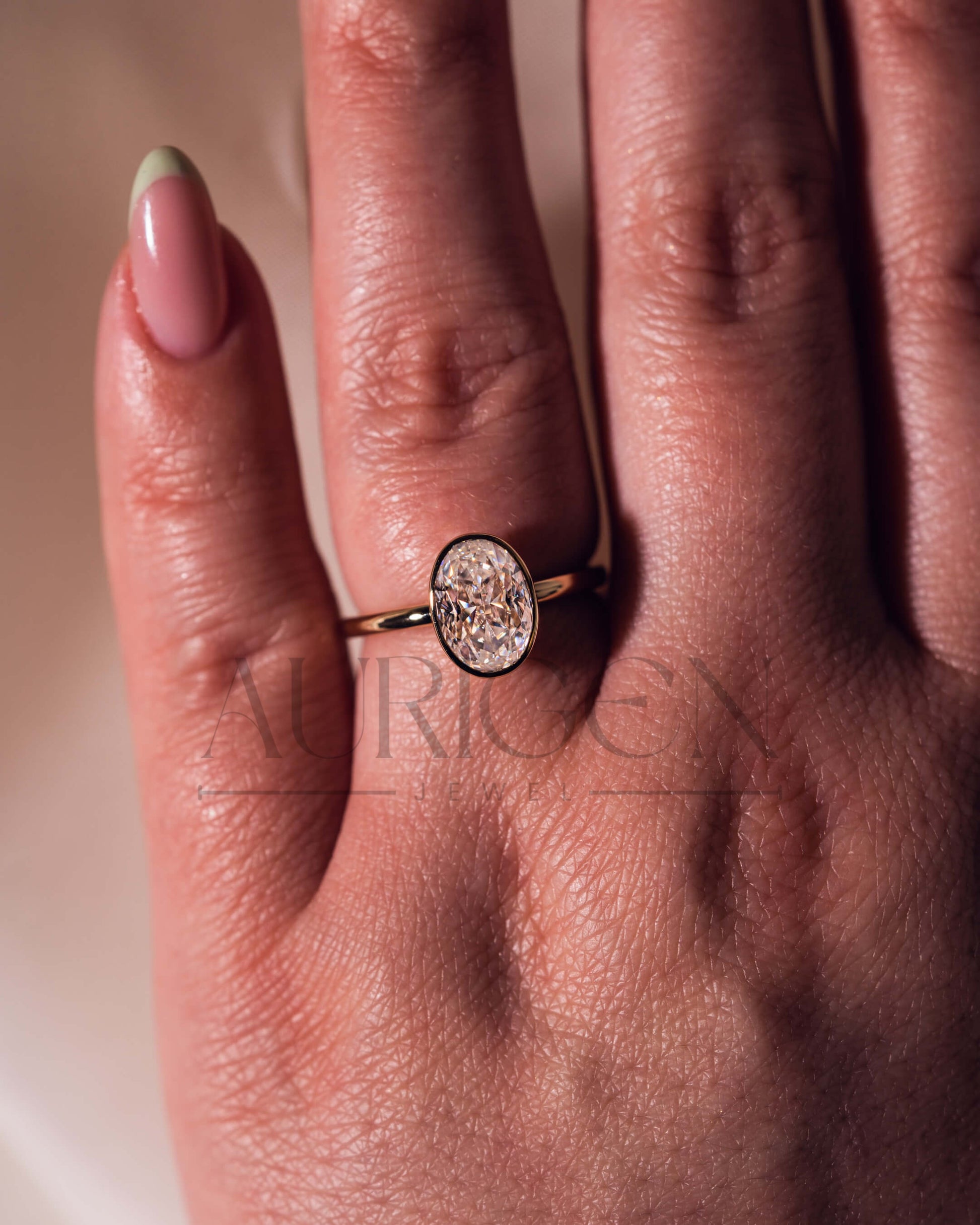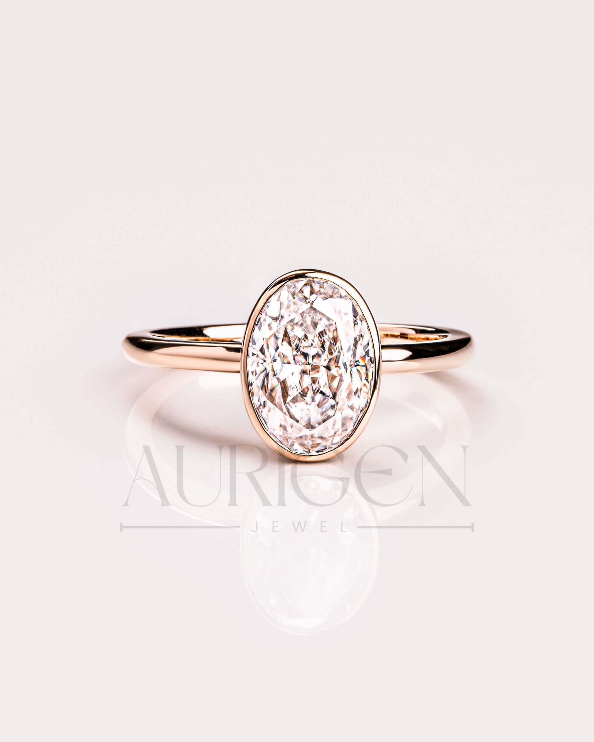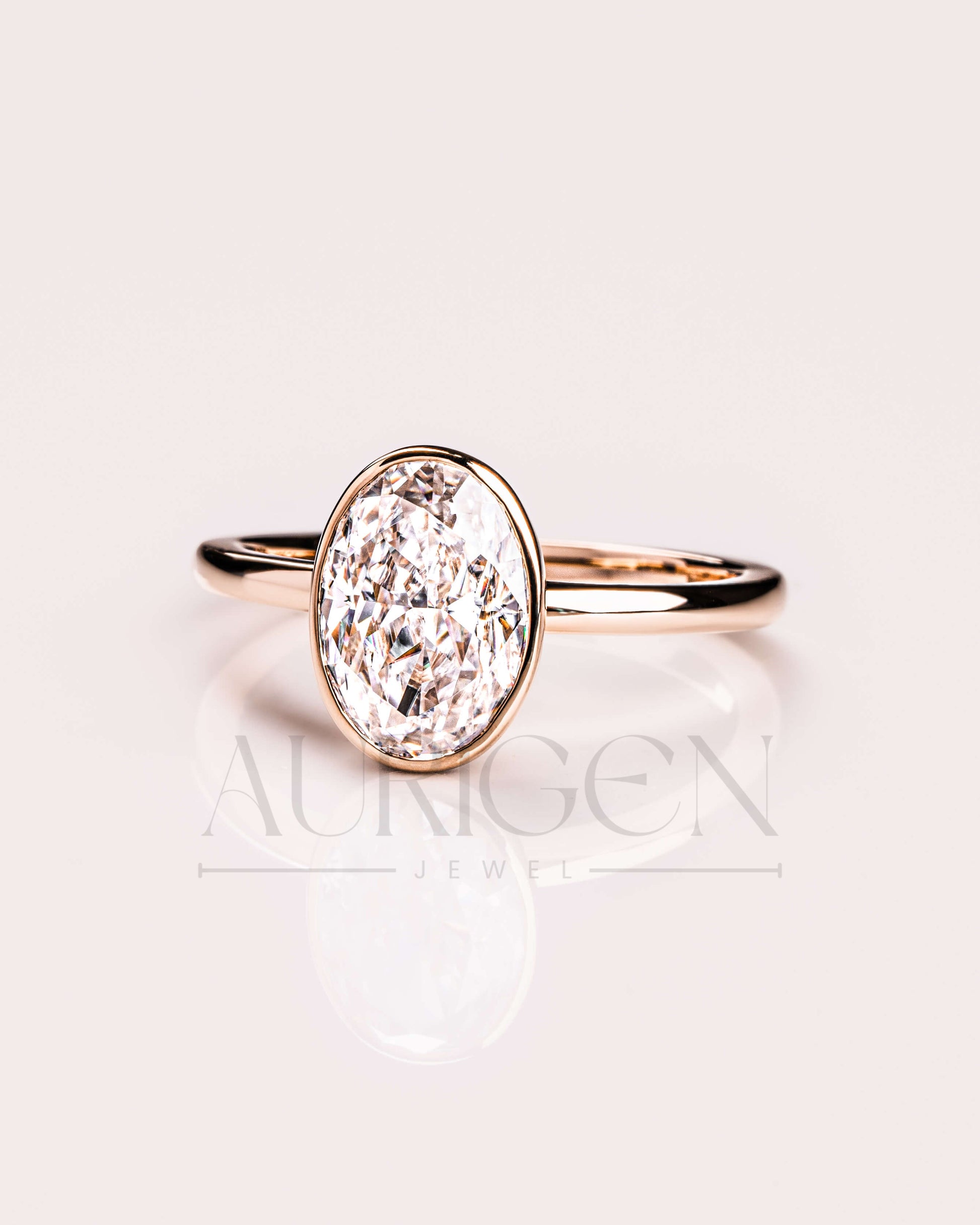 14k Solid Gold Oval Moissanite and Leb Grown Bezel Set Engagement Ring
