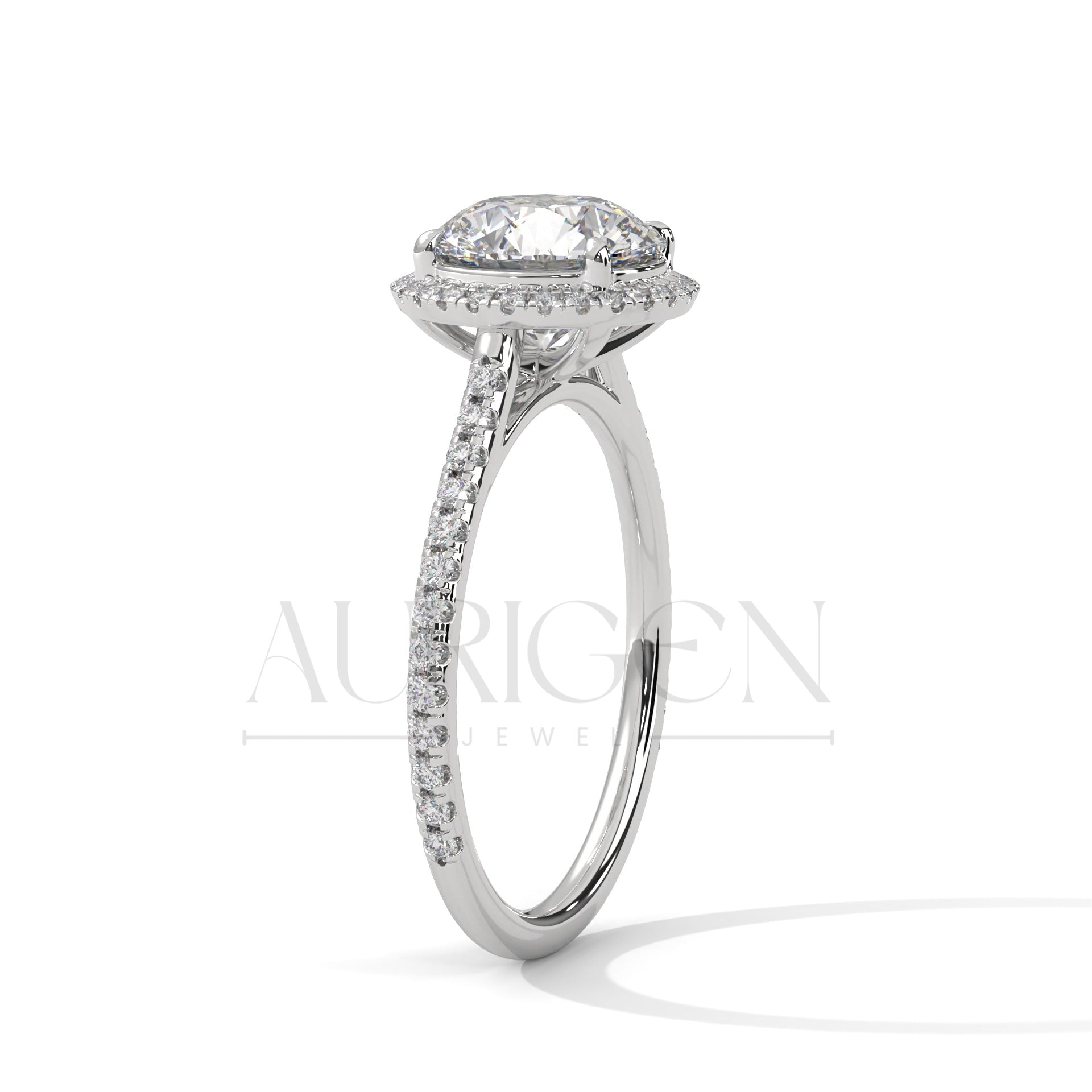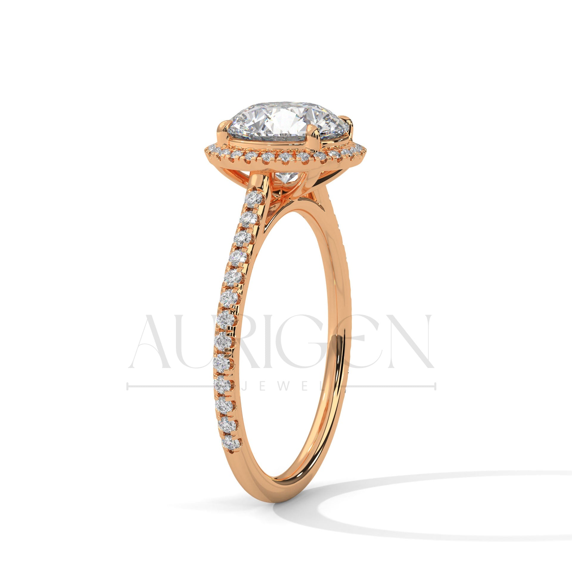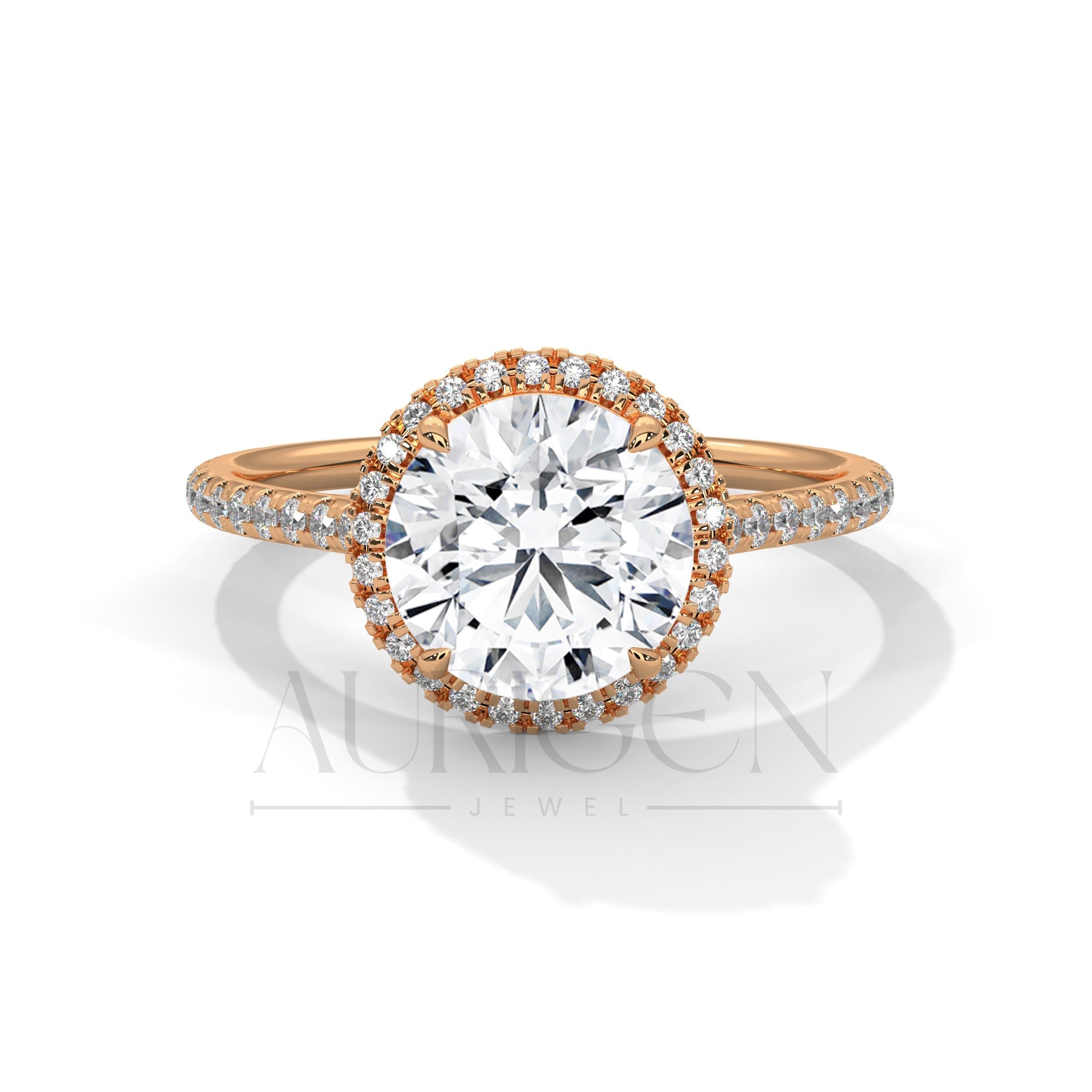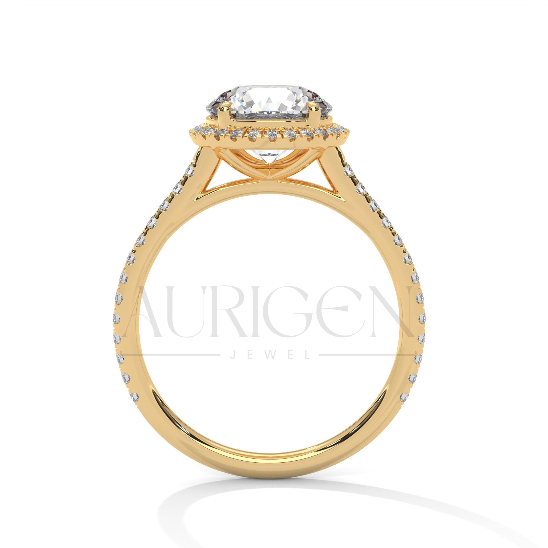 14K Solid Gold Round Brilliant Cut Diamond Ring with Halo and Pave Setting