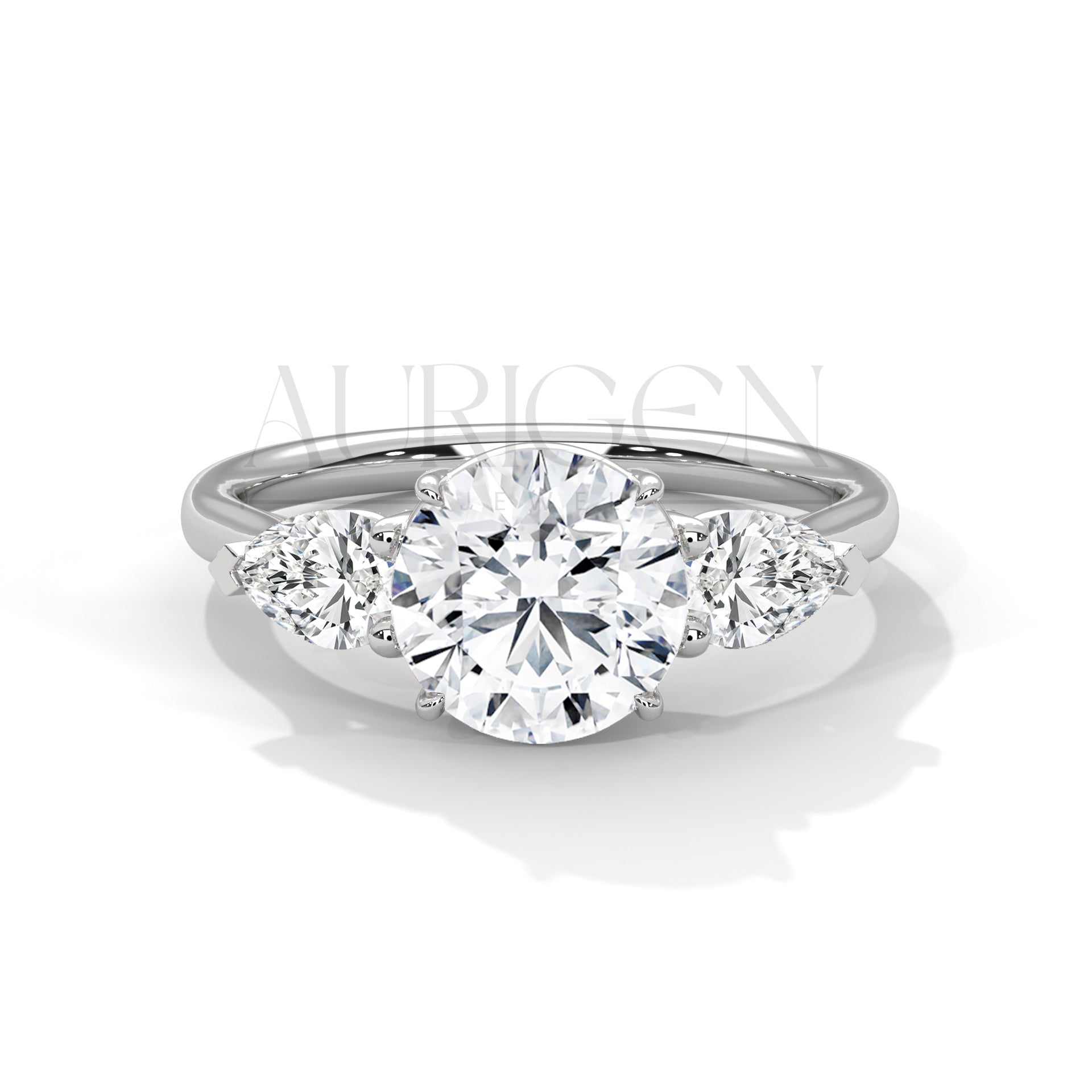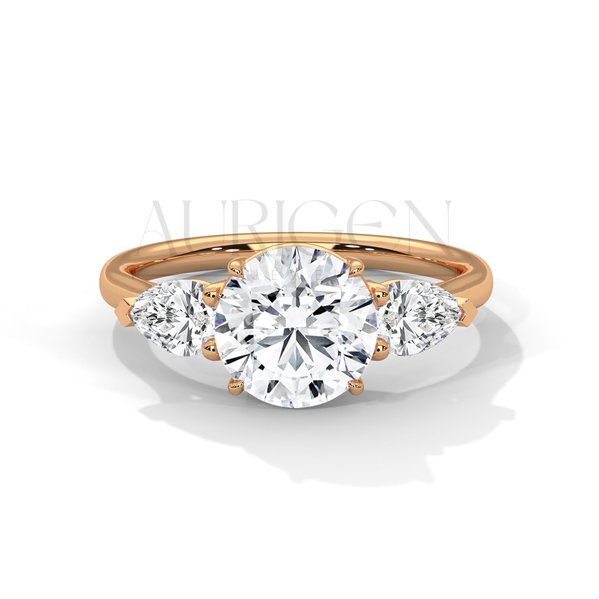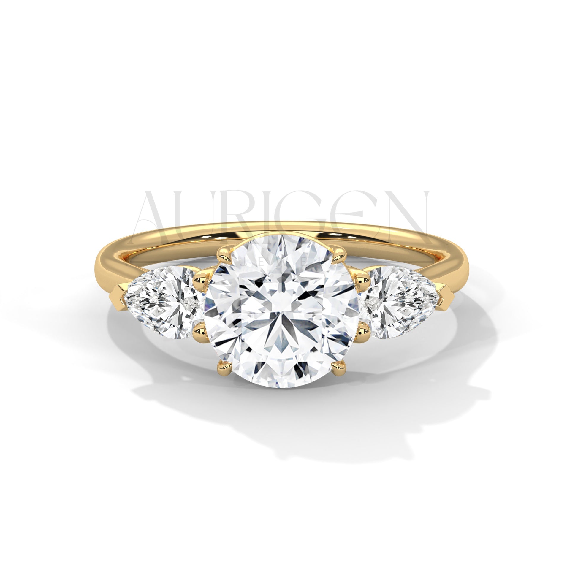14K Solid Gold Three Stone Round Diamond Engagement Ring with Pear Side Stones