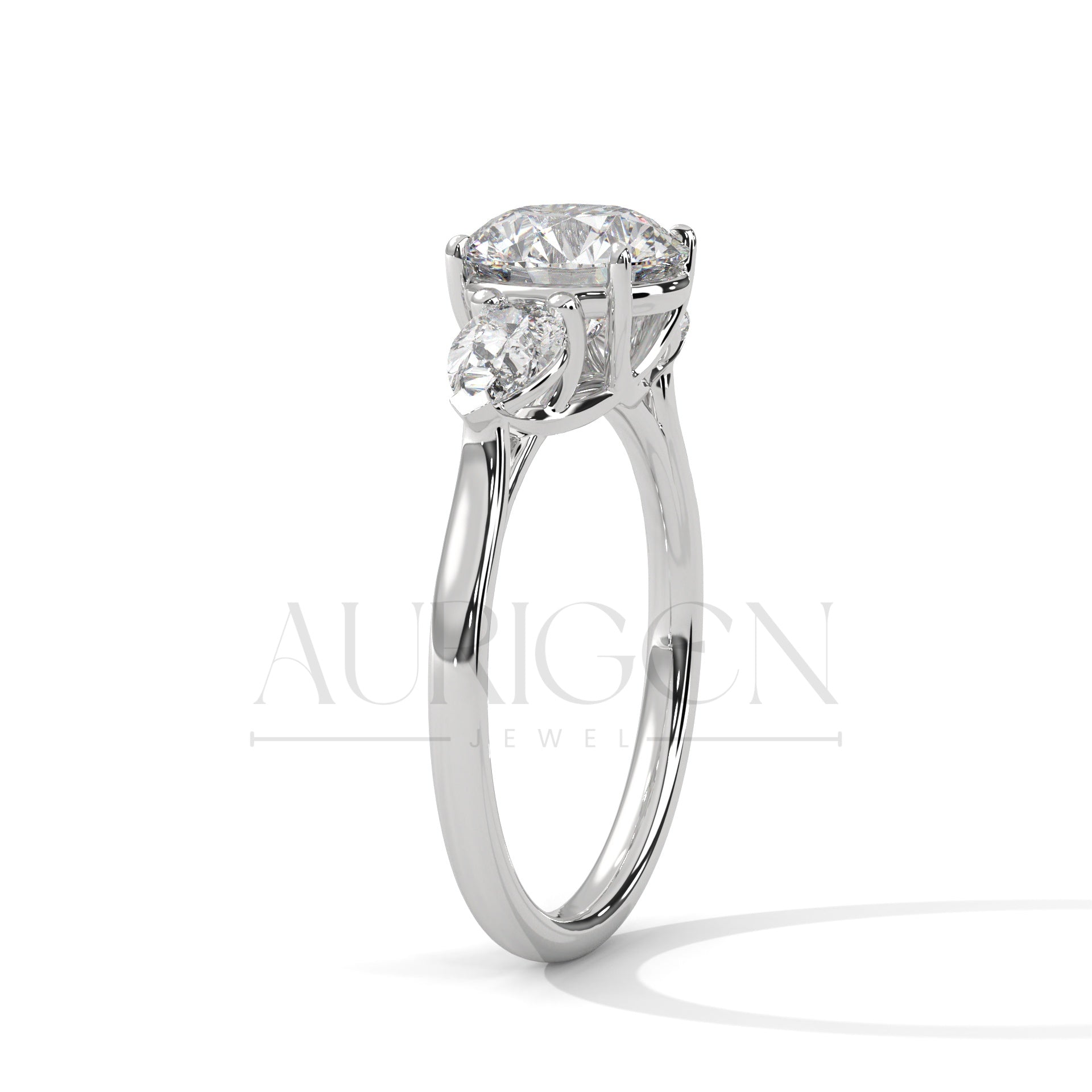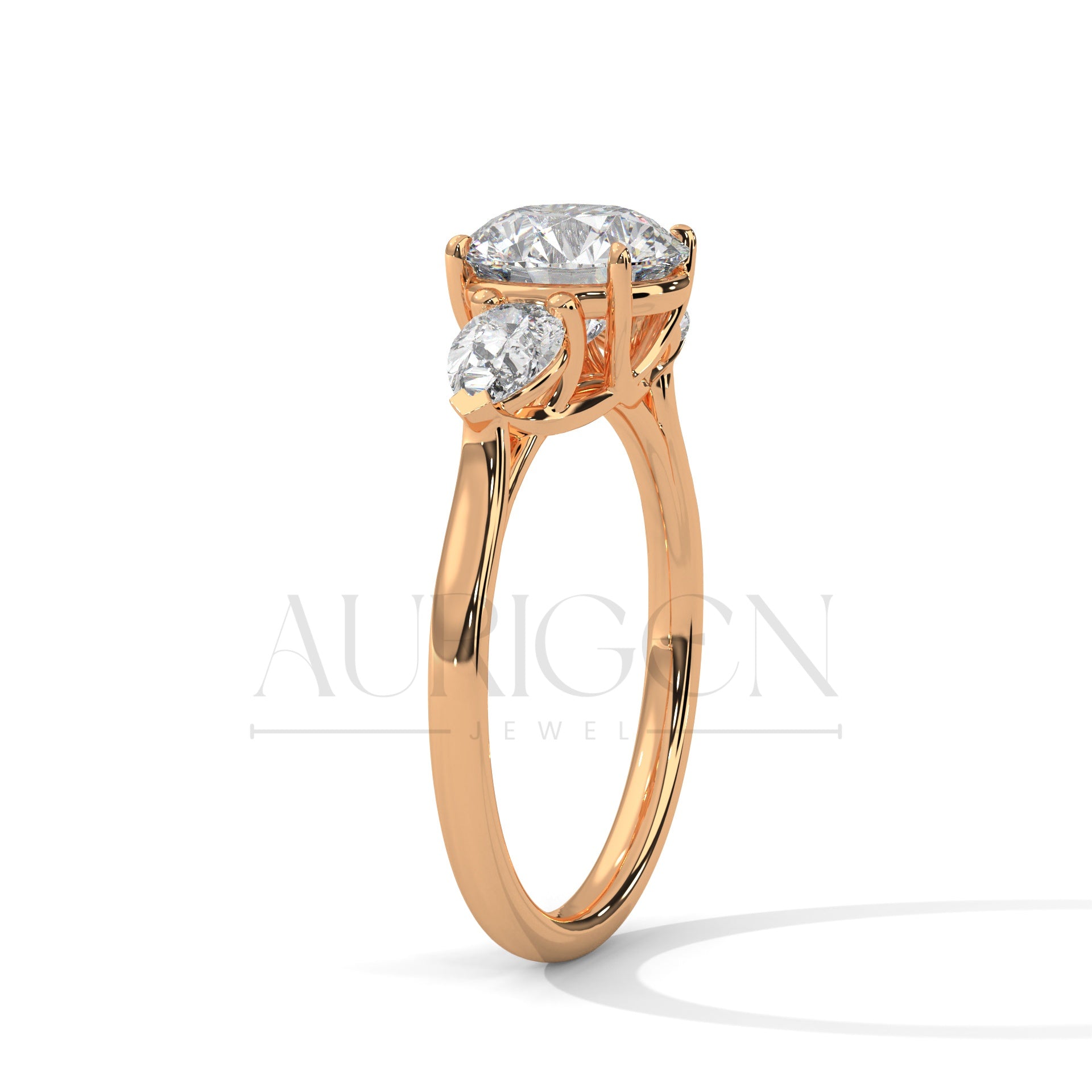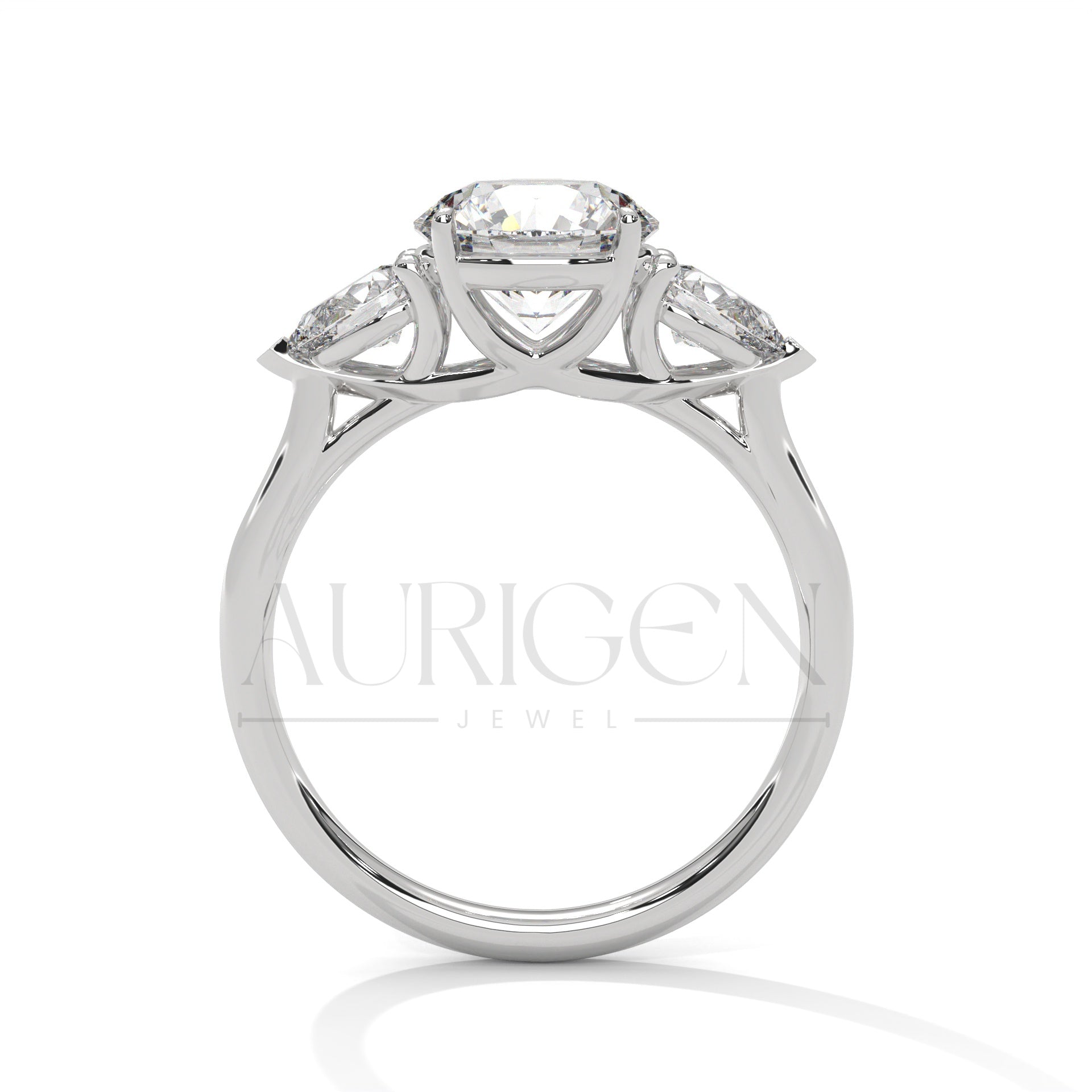 14K Solid Gold Three Stone Round Diamond Engagement Ring with Pear Side Stones
