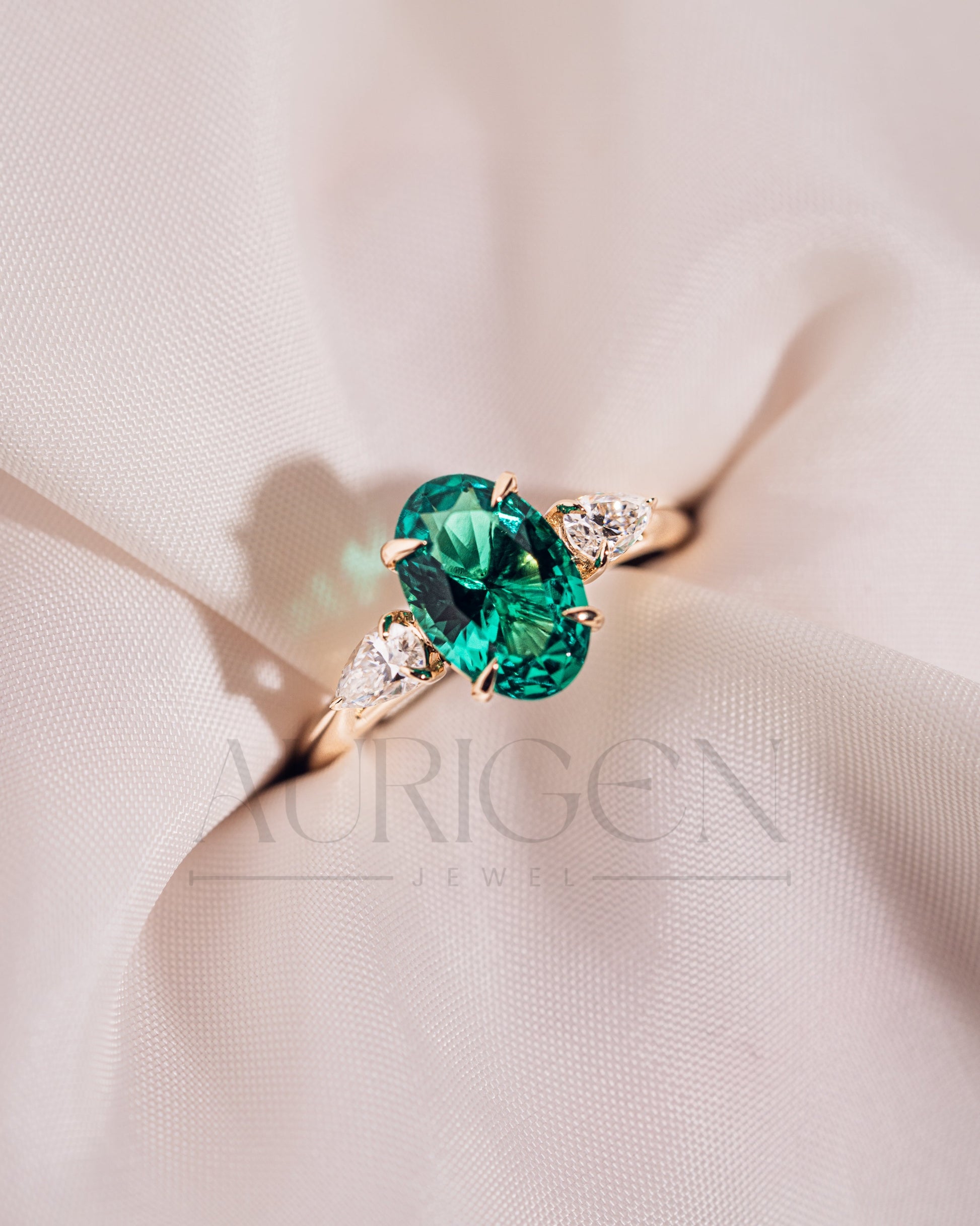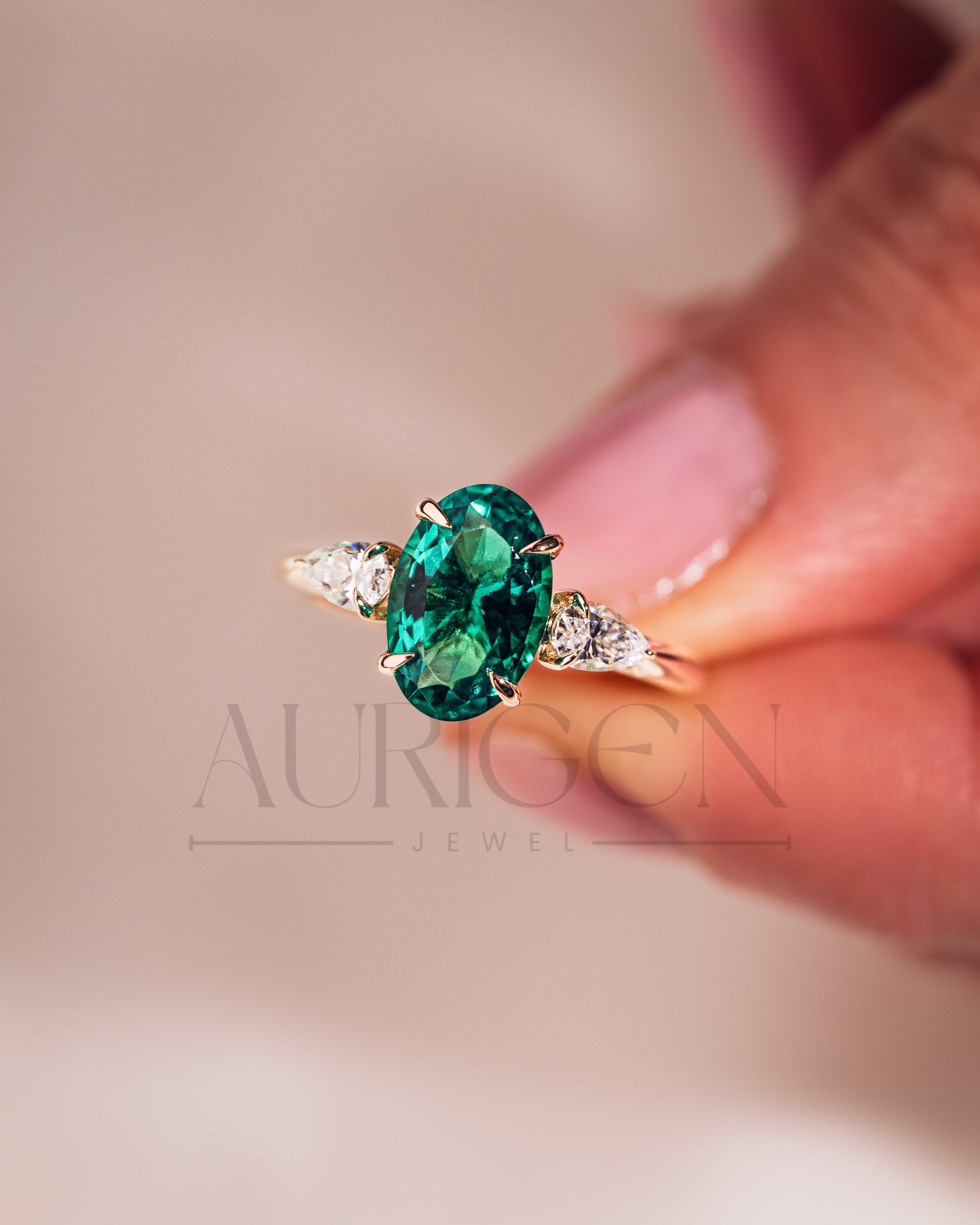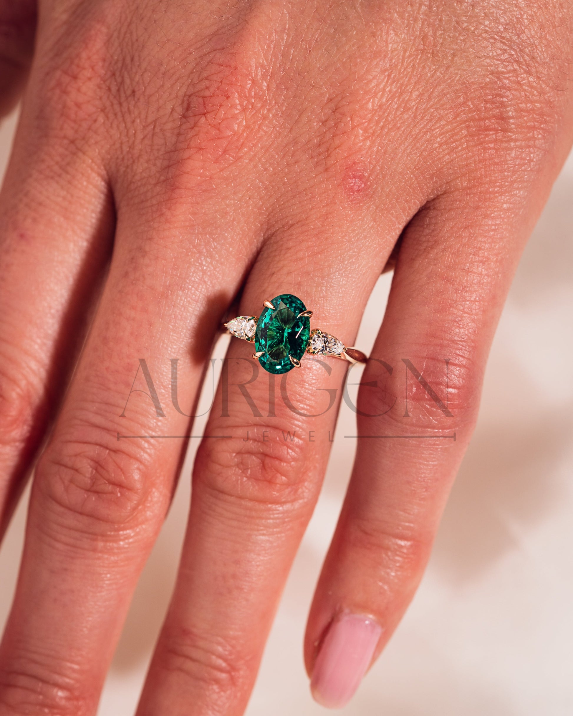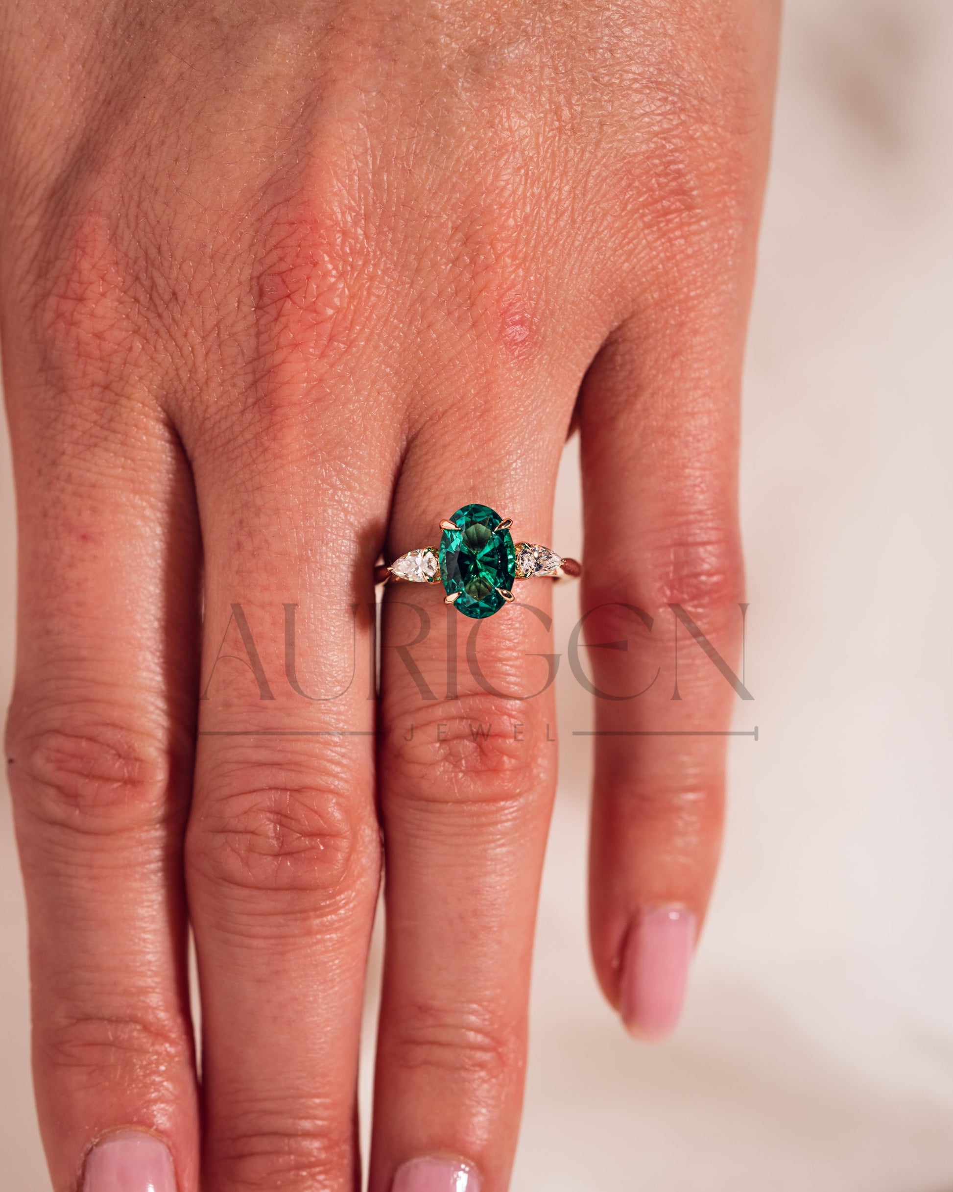 Three Stone Green Oval Cut Moissanite & Lab Grown Diamond Ring