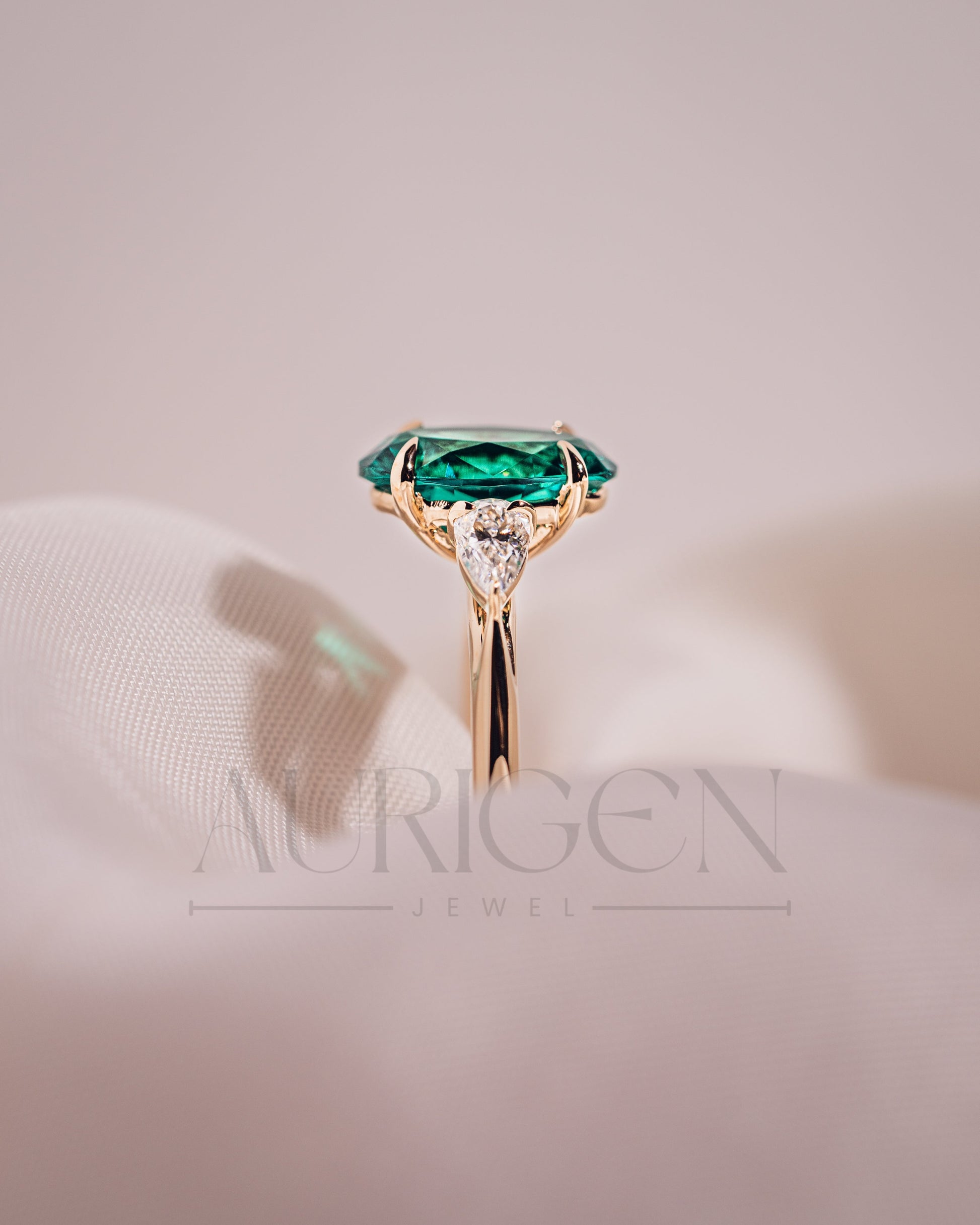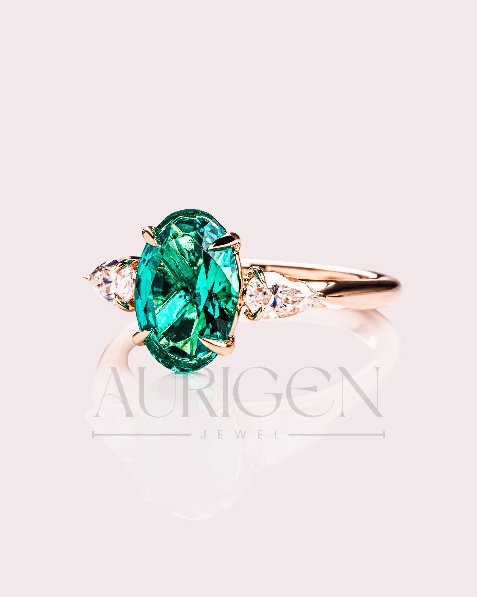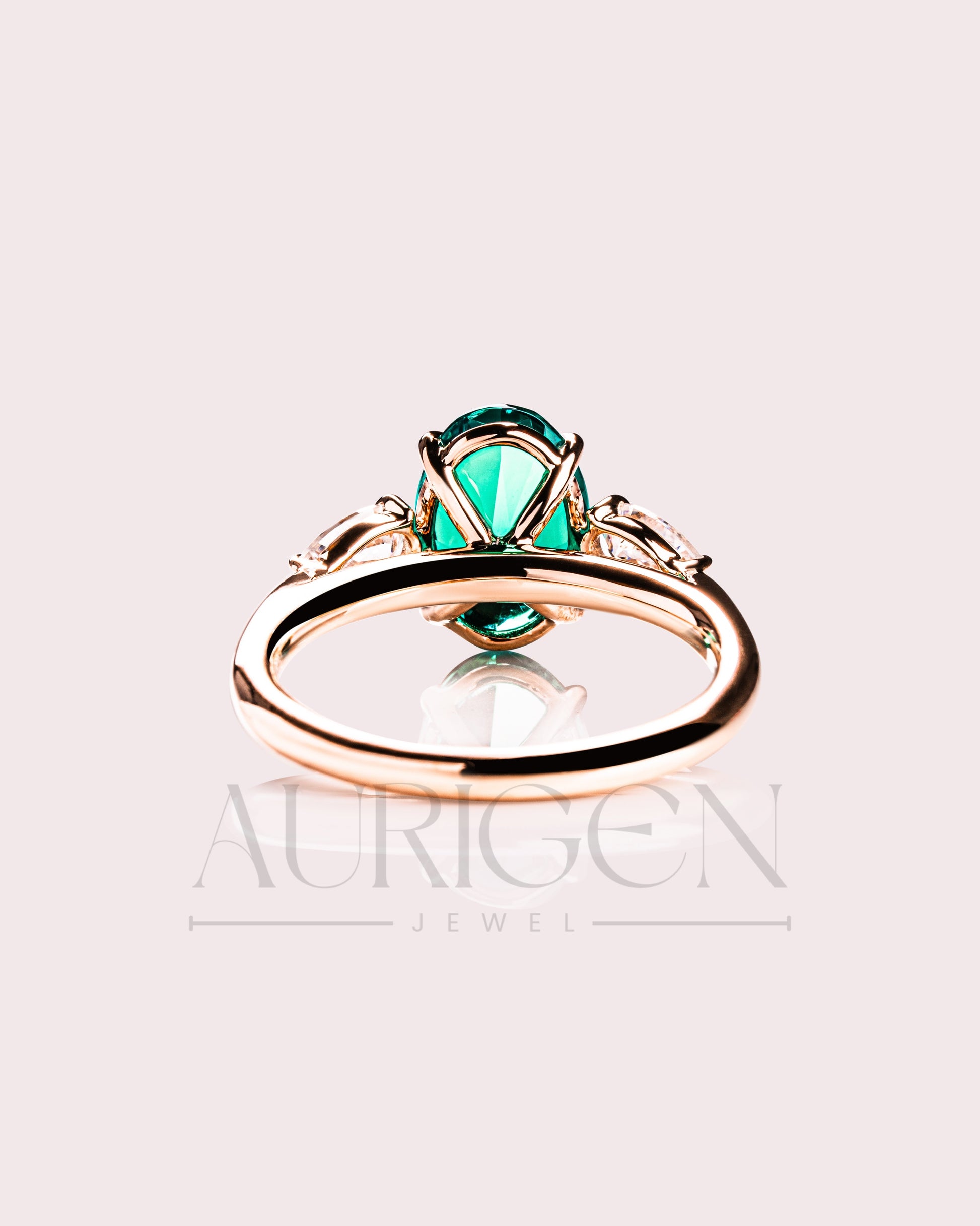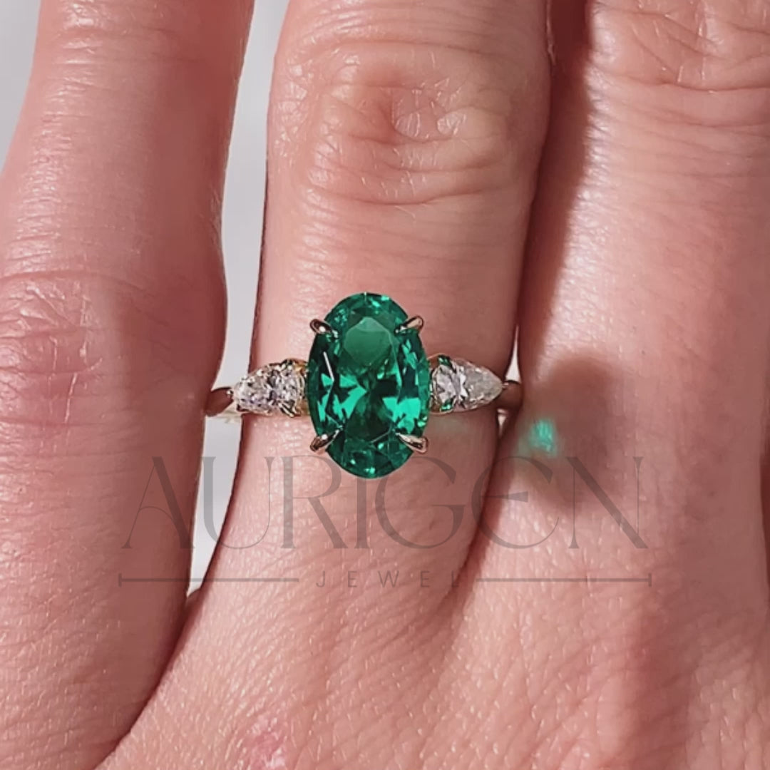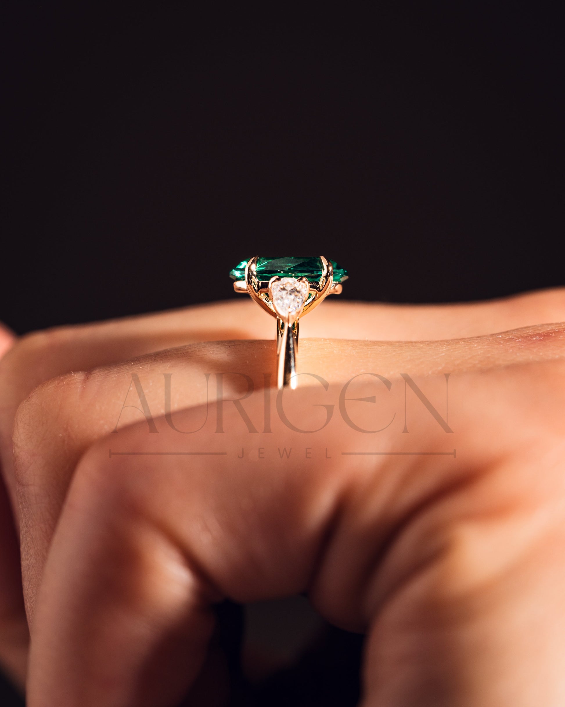 Three Stone Green Oval Cut Moissanite & Lab Grown Diamond Ring