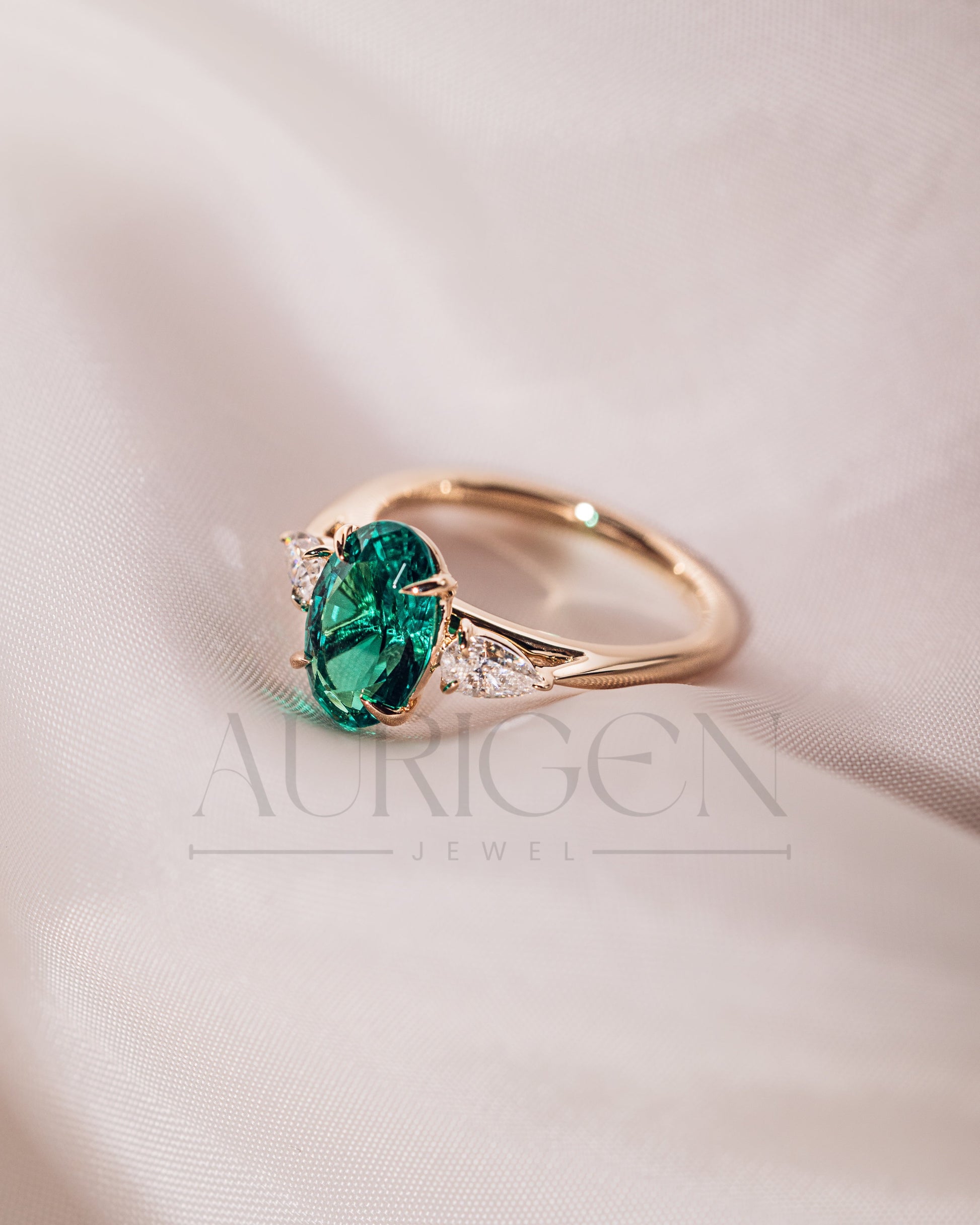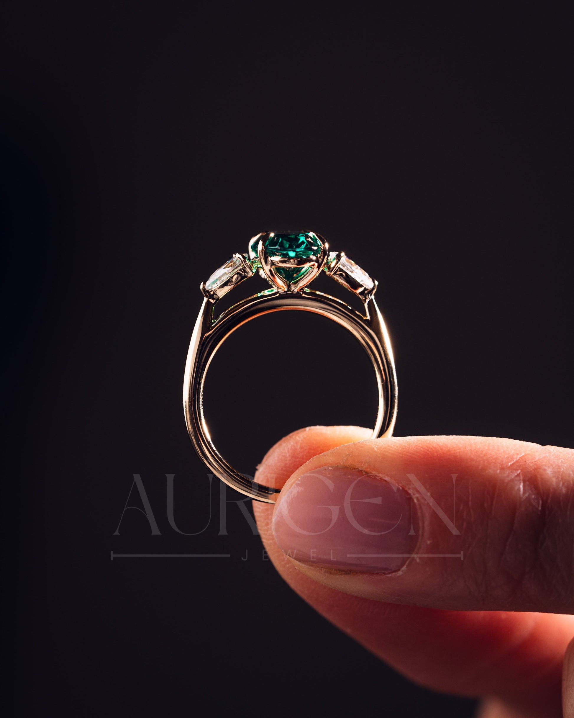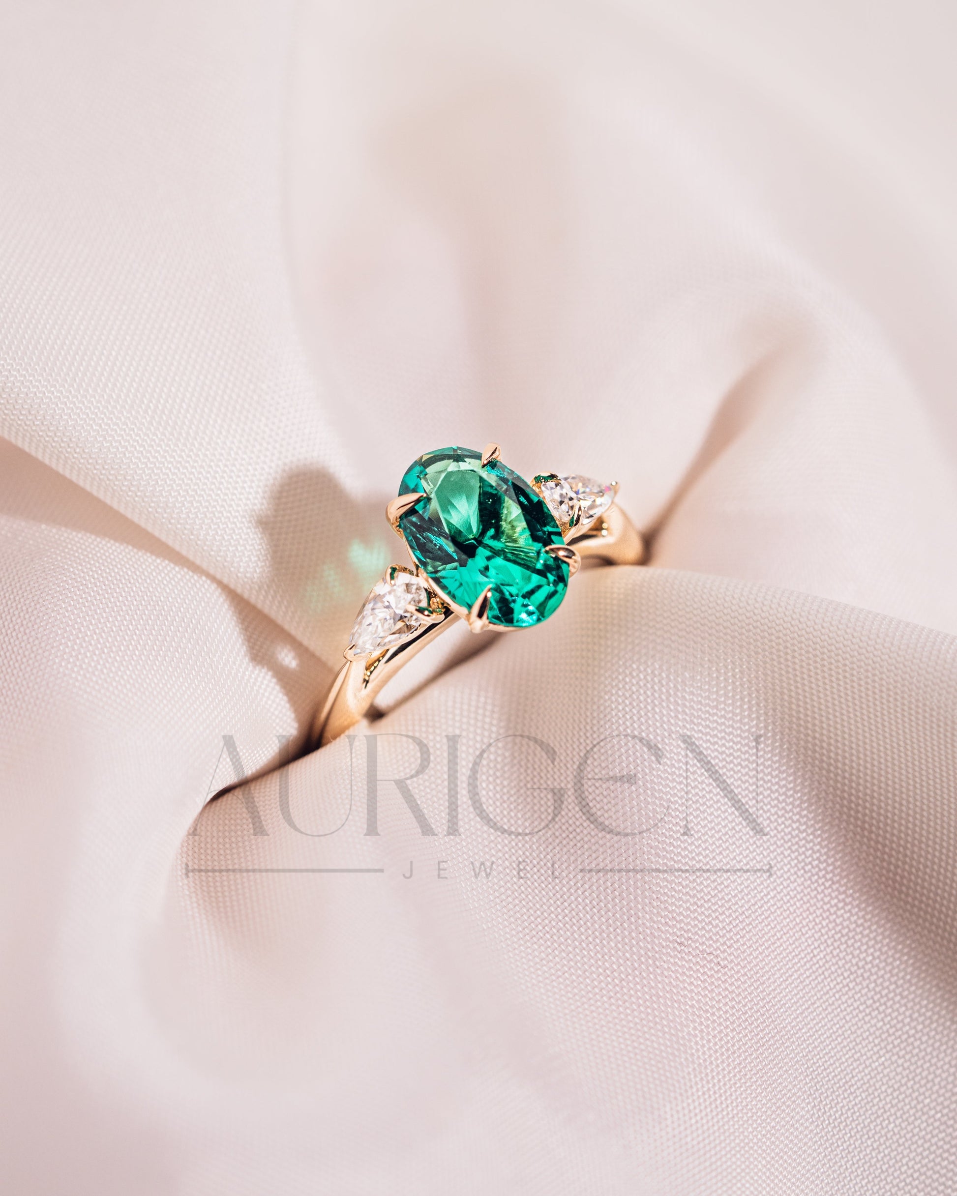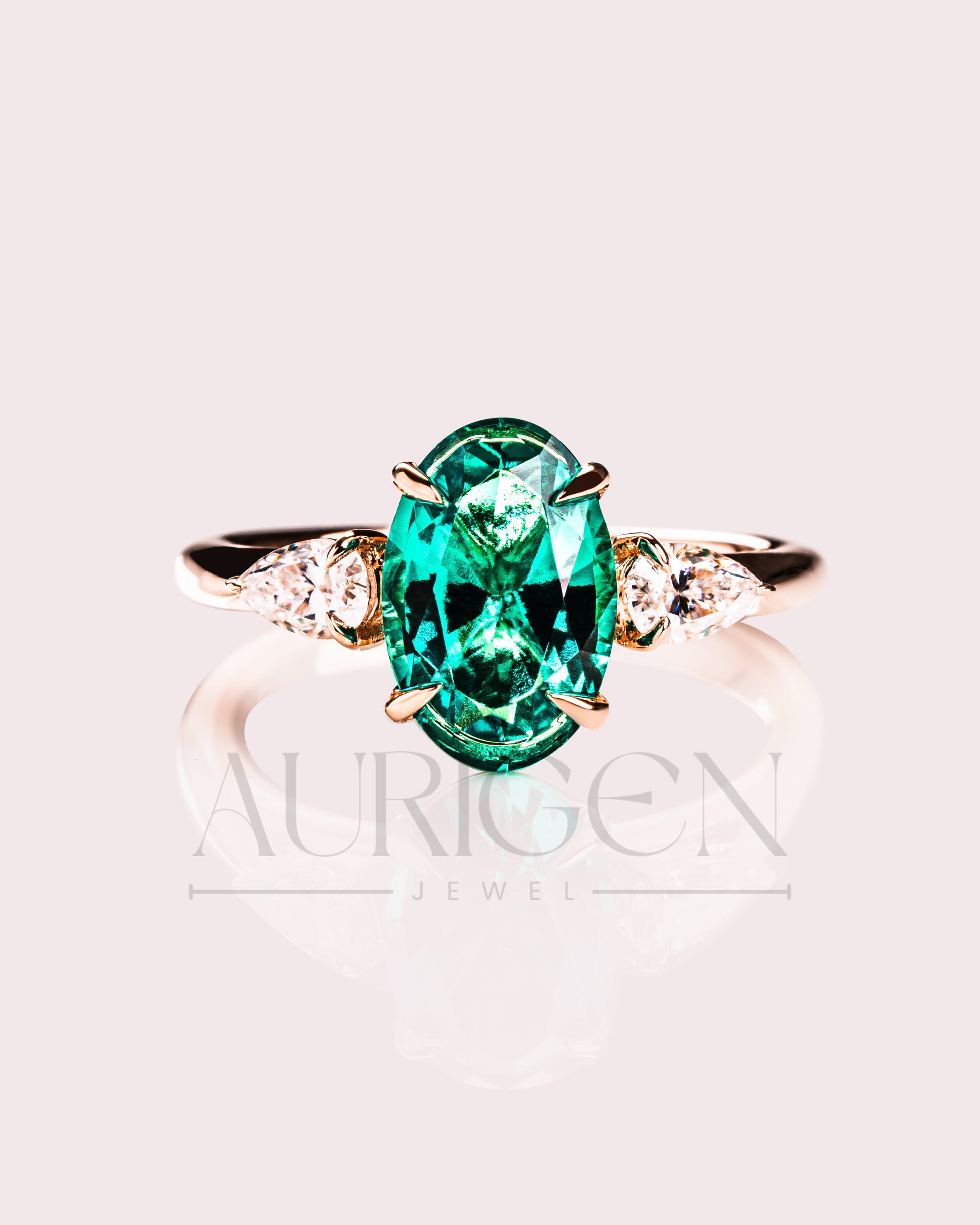 Three Stone Green Oval Cut Moissanite & Lab Grown Diamond Ring