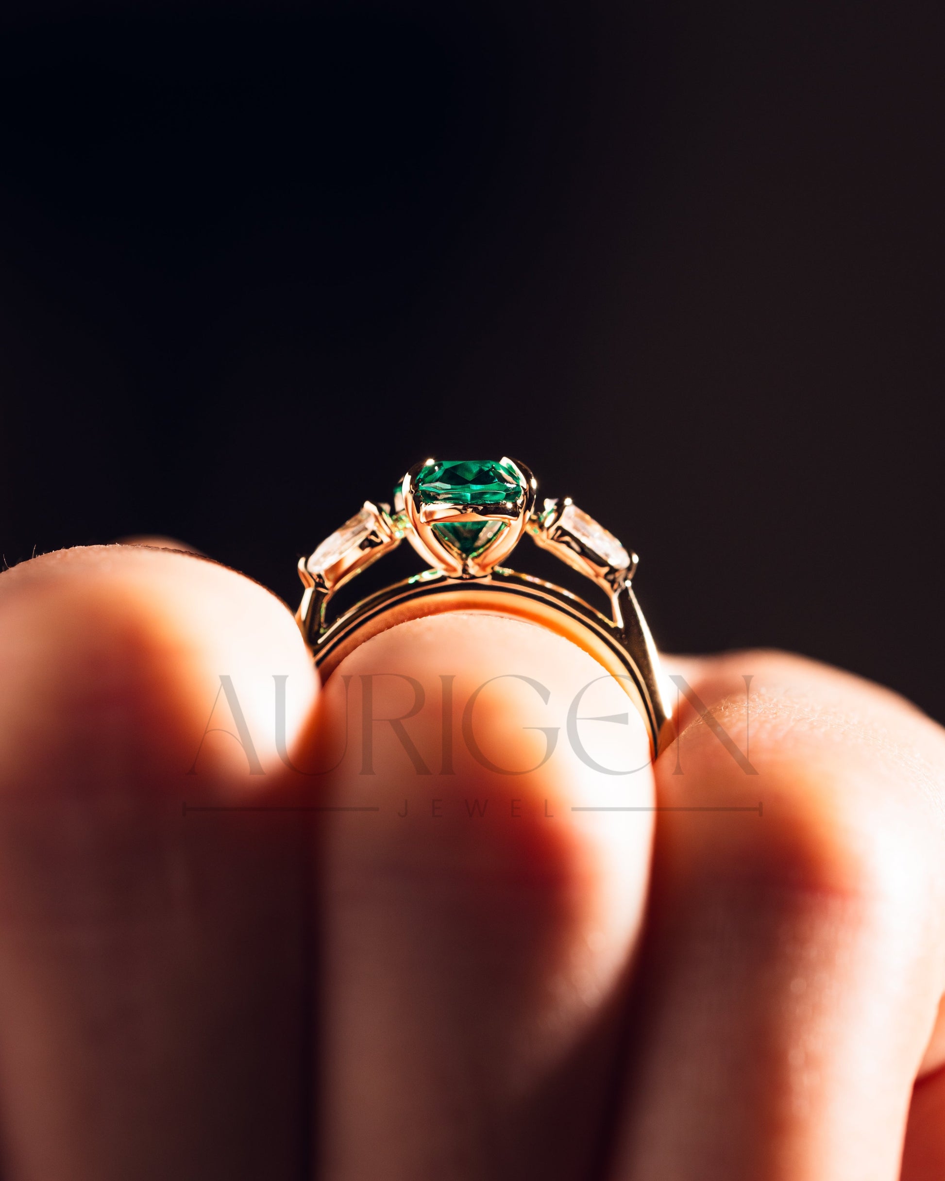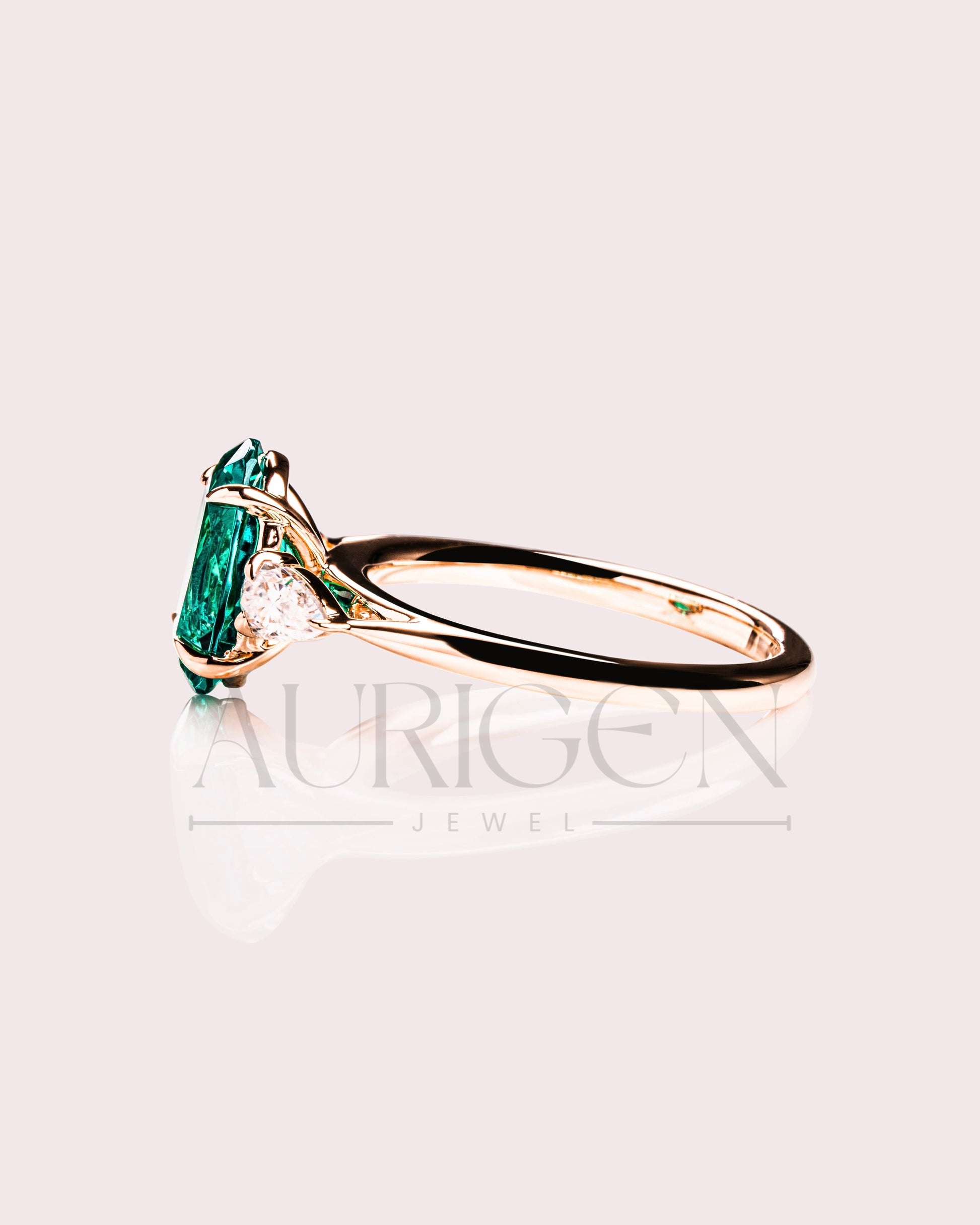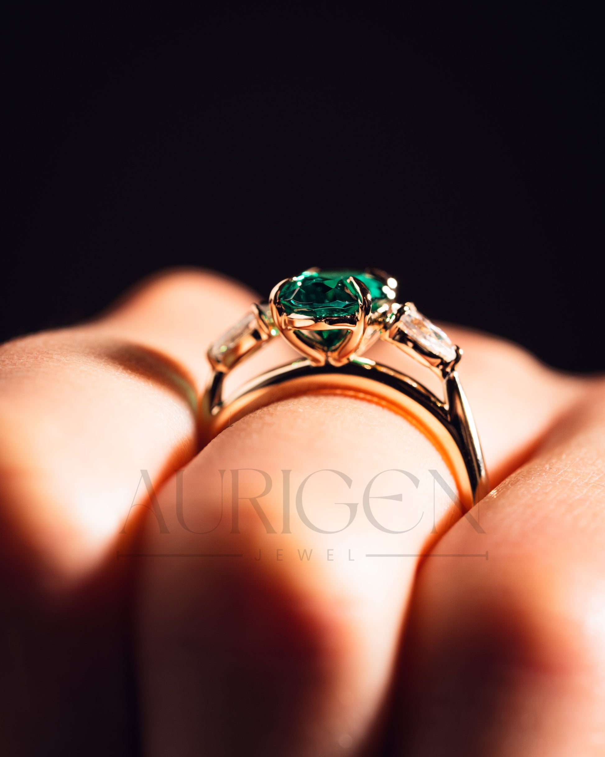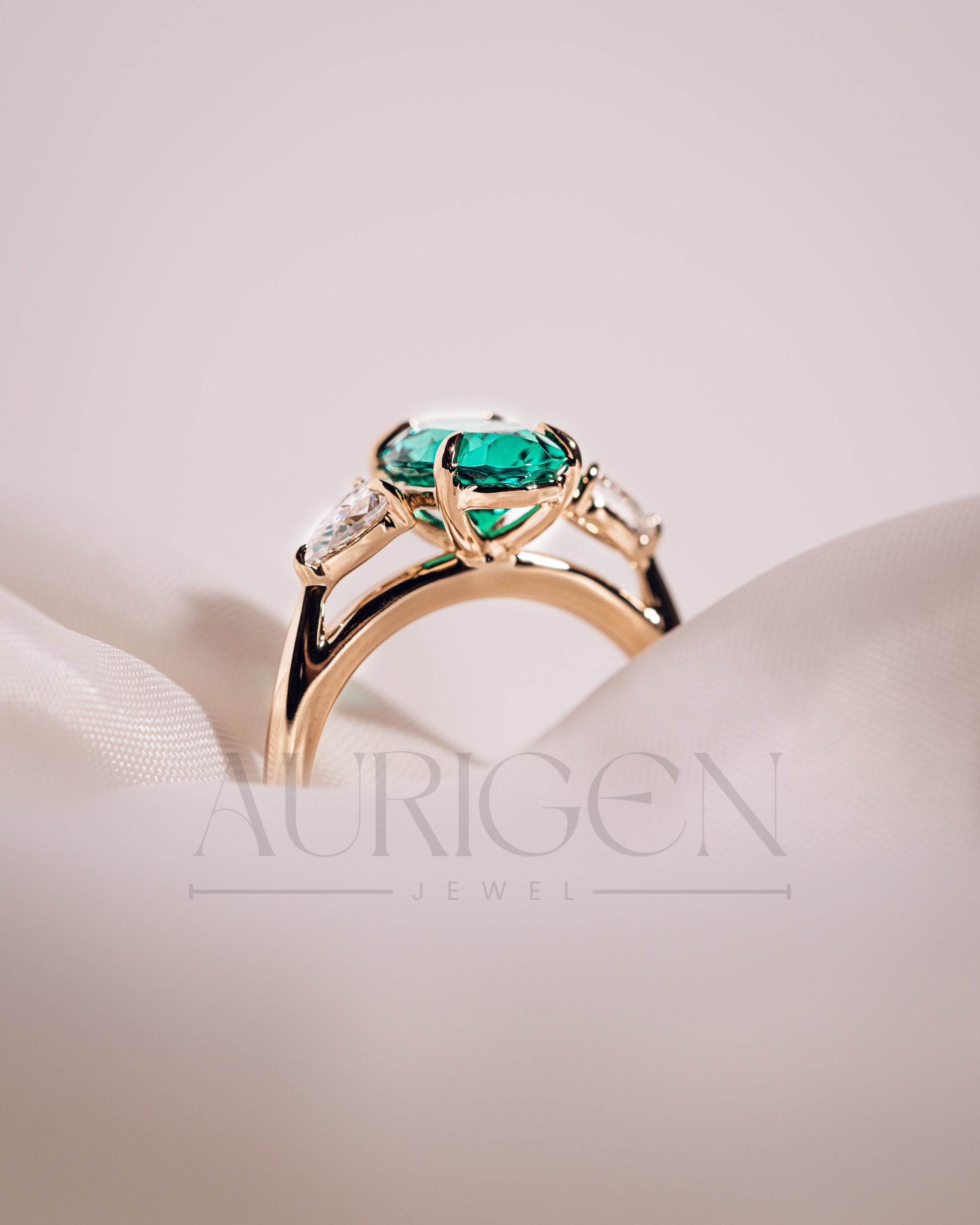 Three Stone Green Oval Cut Moissanite & Lab Grown Diamond Ring
