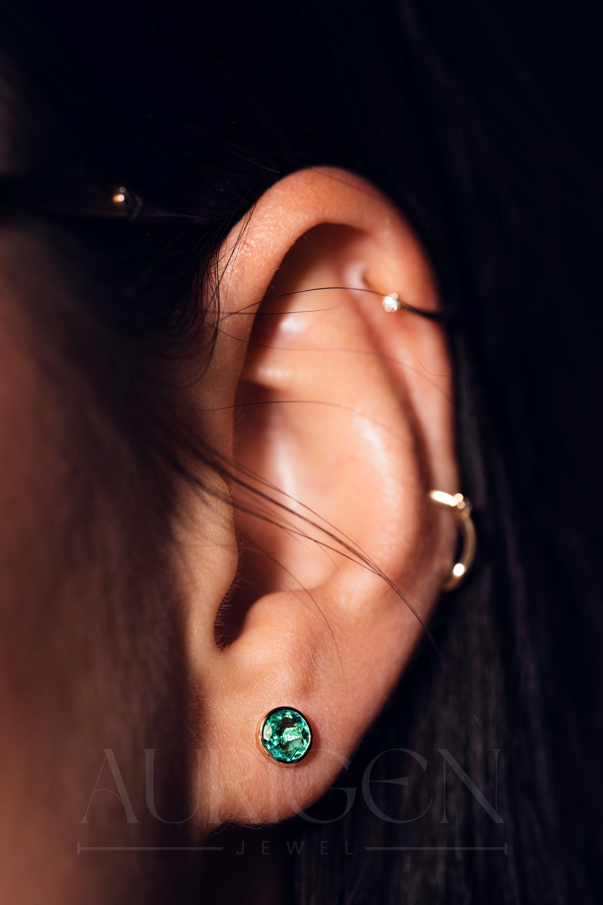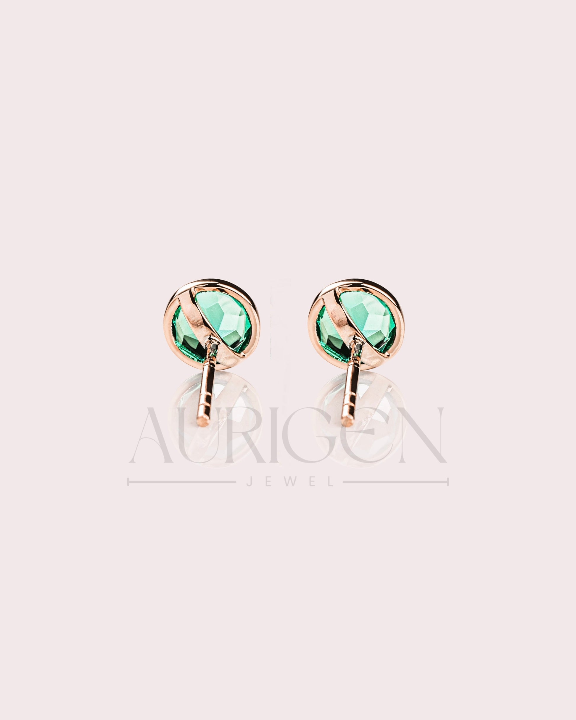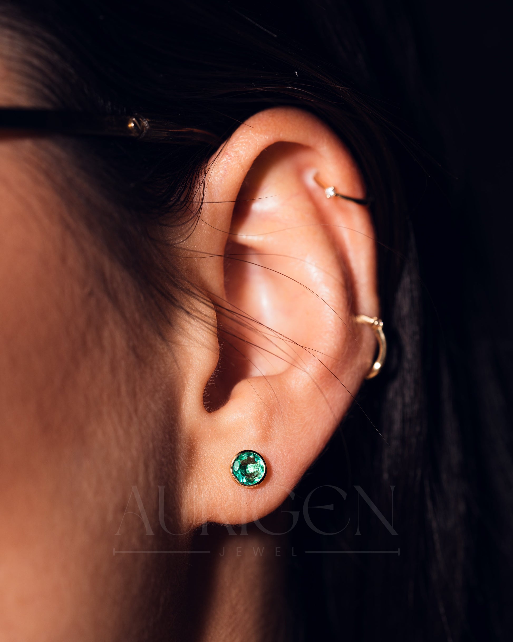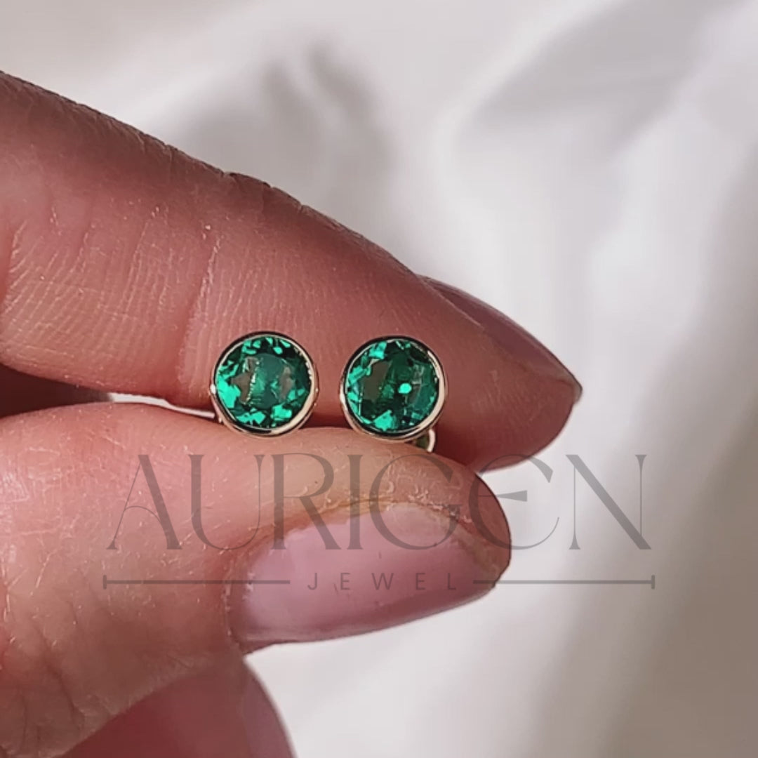 Unique Bezel Setting Stud Earrings - Green Round Cut Moissanite and Lab Grown Diamond