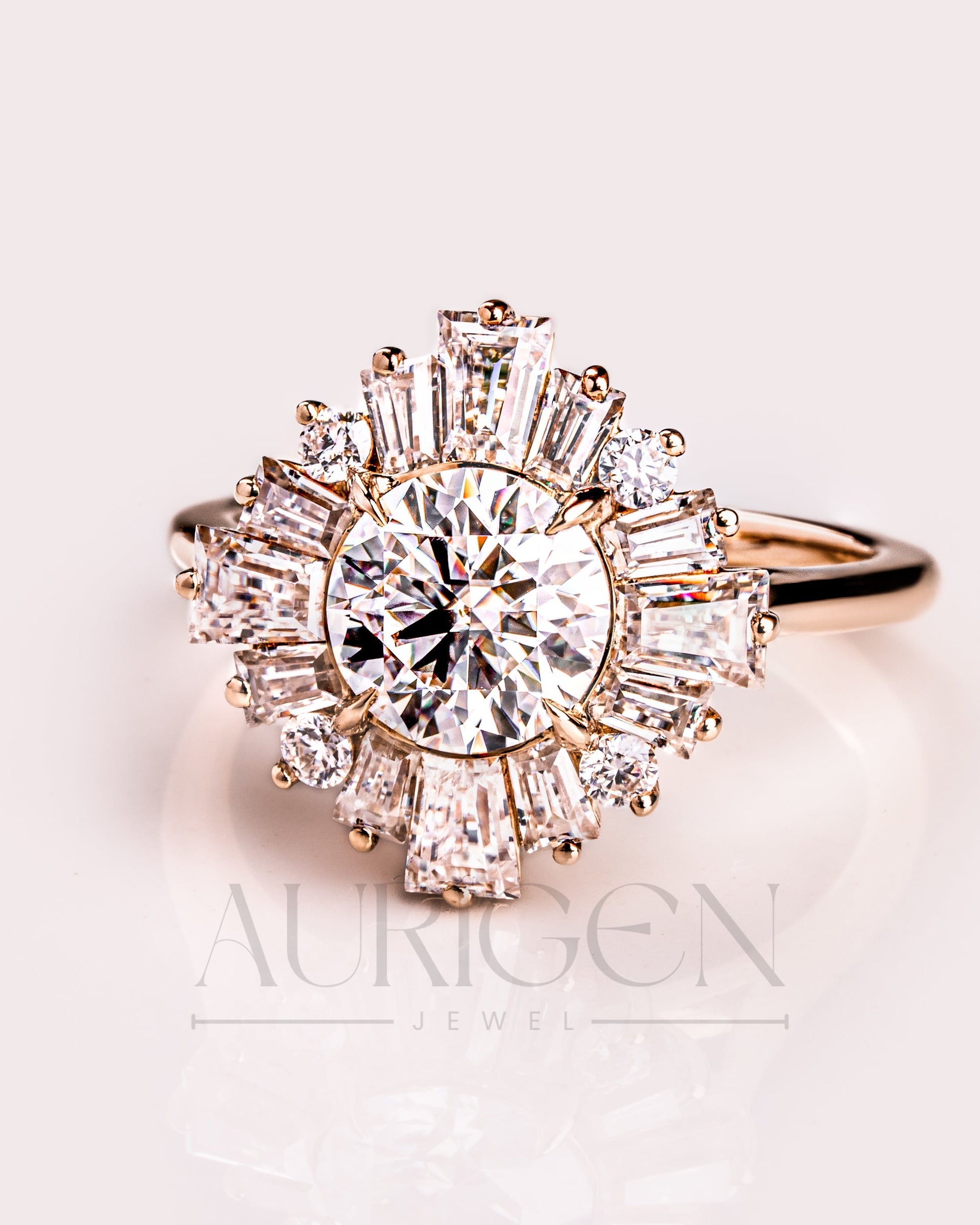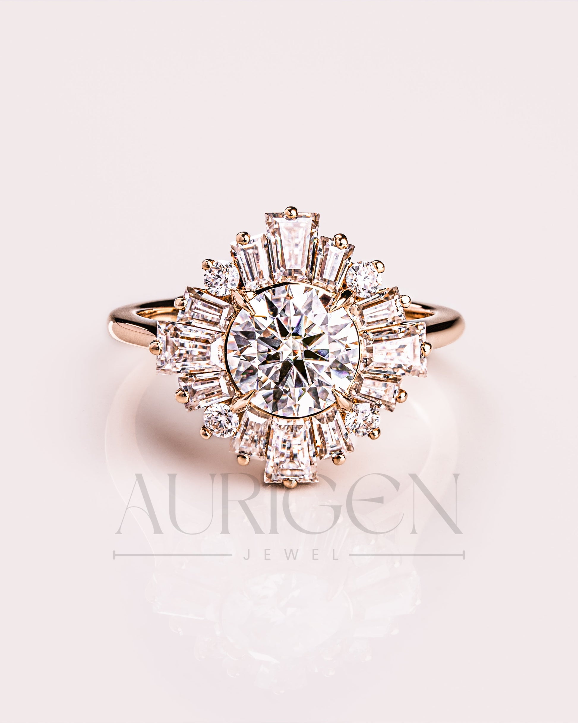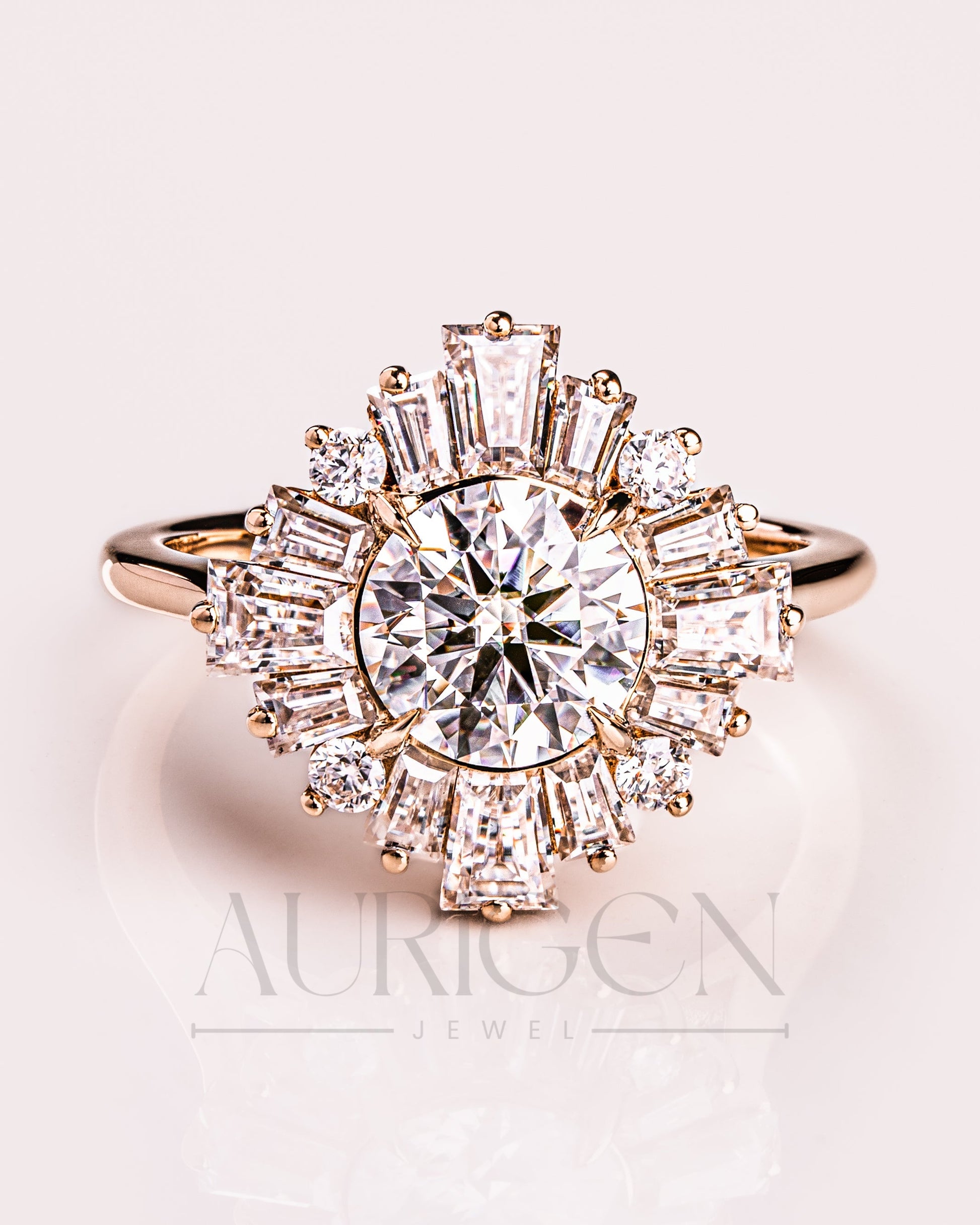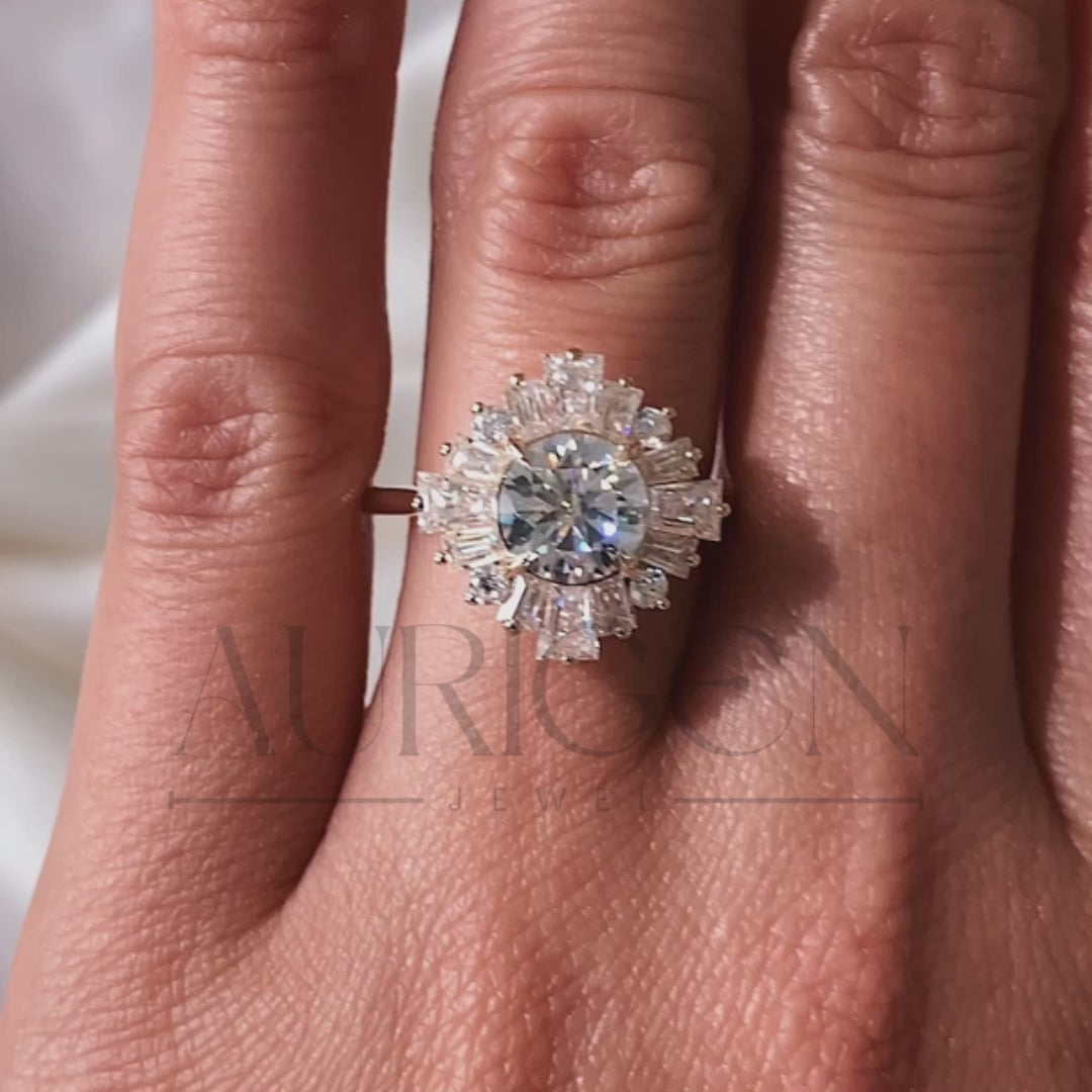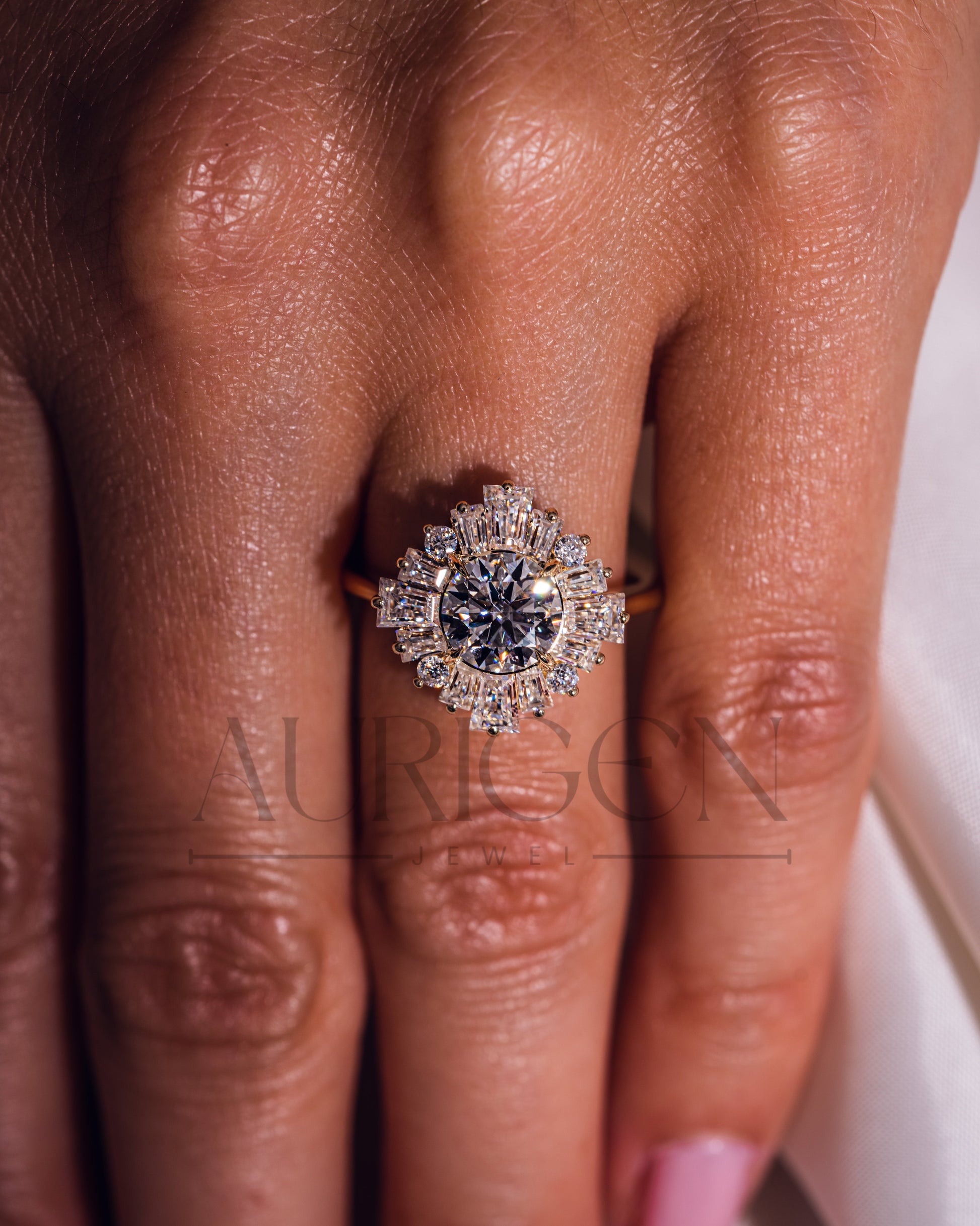 Vintage-Inspired Round Cut Moissanite & Lab Grown Diamond Sunburst Halo Ring