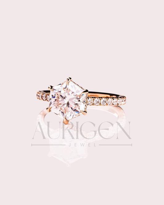 Stunning Hexagon Cut Moissanite and Lab Grown Diamond Engagement Ring in Solid Gold