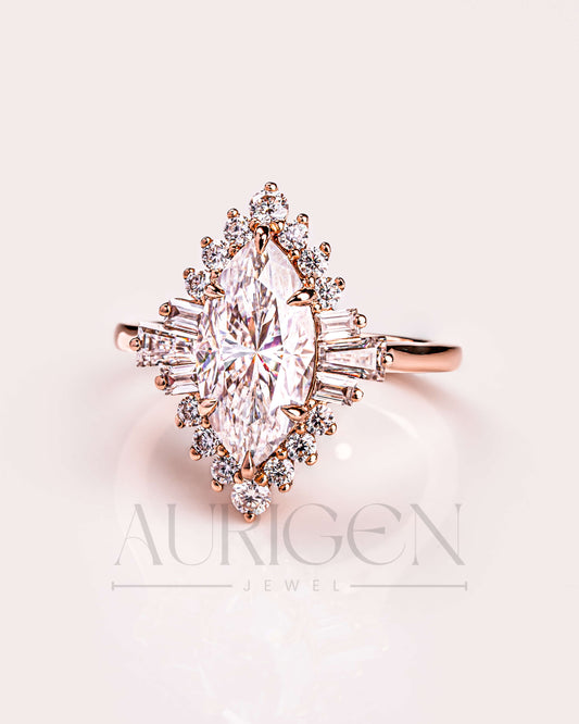 Starburst Halo Marquise Cut Engagement Ring - 14K Solid Gold