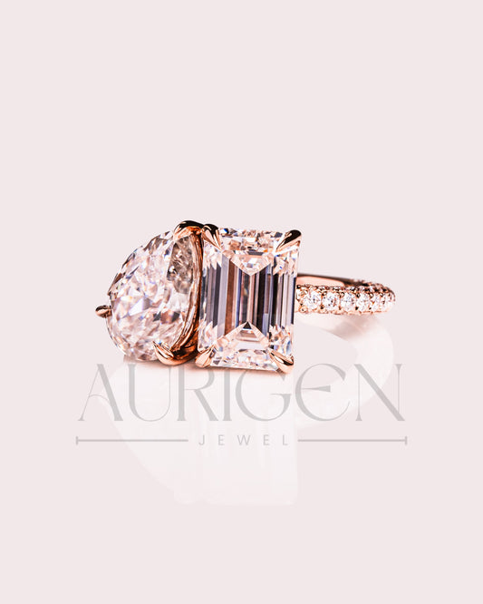 Unique Toi et Moi Engagement Ring with Pear & Emerald Moissanite and Leb 18K Rose Gold Ring