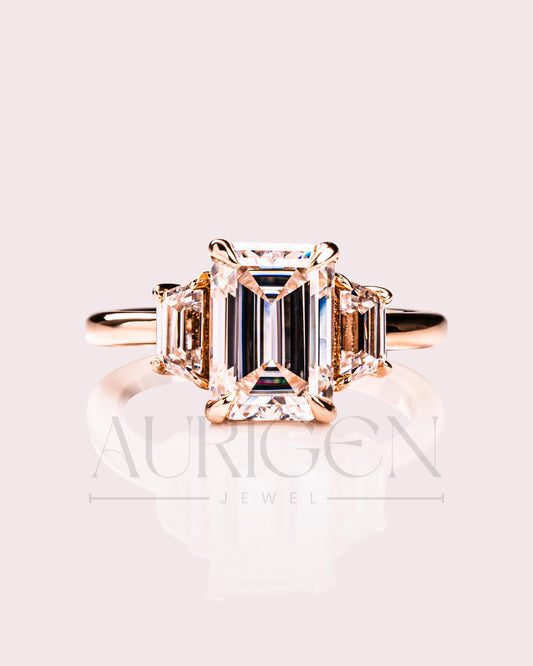 Unique Emerald Cut with Trapezoid Side Stones Moissanite and Leb Grown Engagement Ring 14k Yellow Gold
