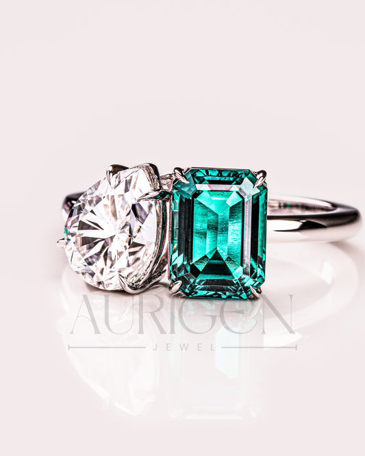 Two Stone Emerald and Oval Cut Moissanite and Lab Grown Diamond Ring