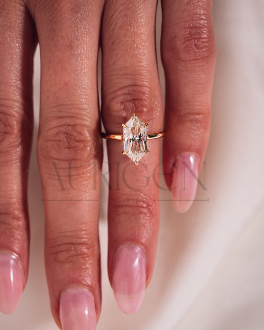 6-Prong Set Elongated Hexagon Moissanite & Leb Engagement Ring Hidden Halo 18K Rose Gold
