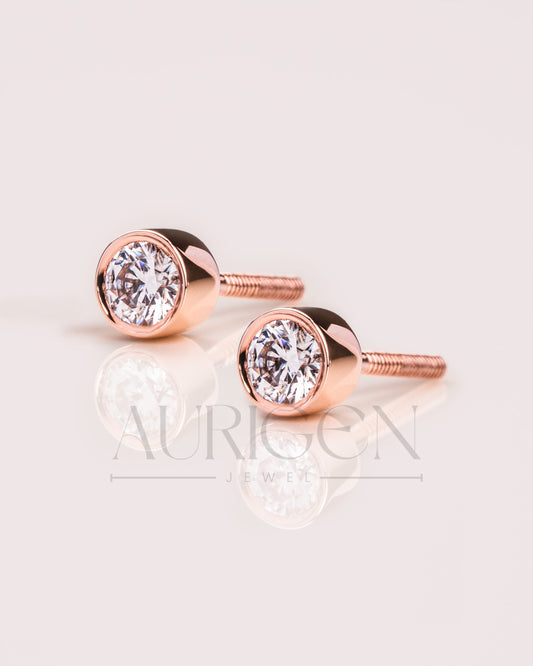 Dainty 14k Rose Gold Round Cut Bezel Diamond Stud Earrings