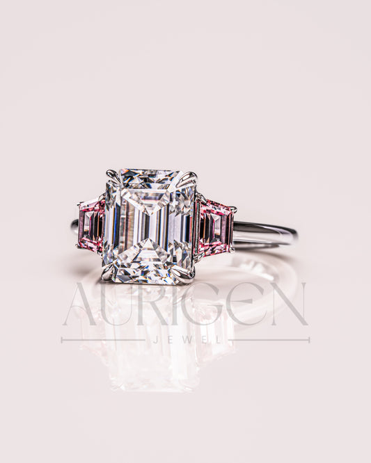 Emerald Cut with Pink Trapezoid Side Stones Engagement Ring in 14k White Gold