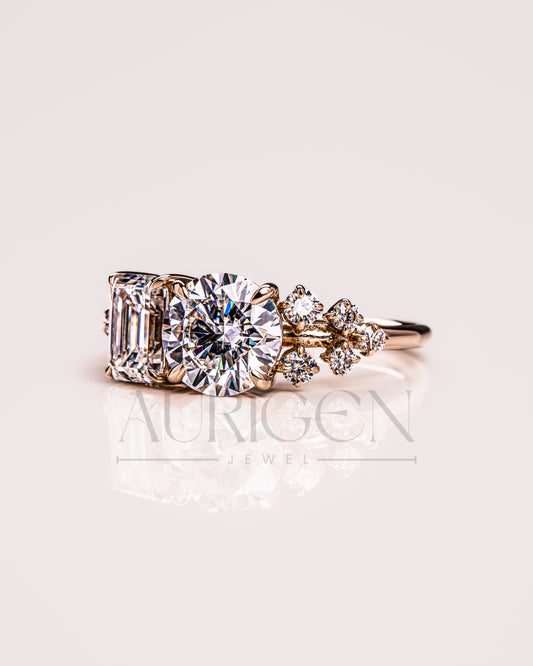 Round and Emerald Cut Moissanite & Lab Grown Diamond Cluster Ring in 14K Solid Gold