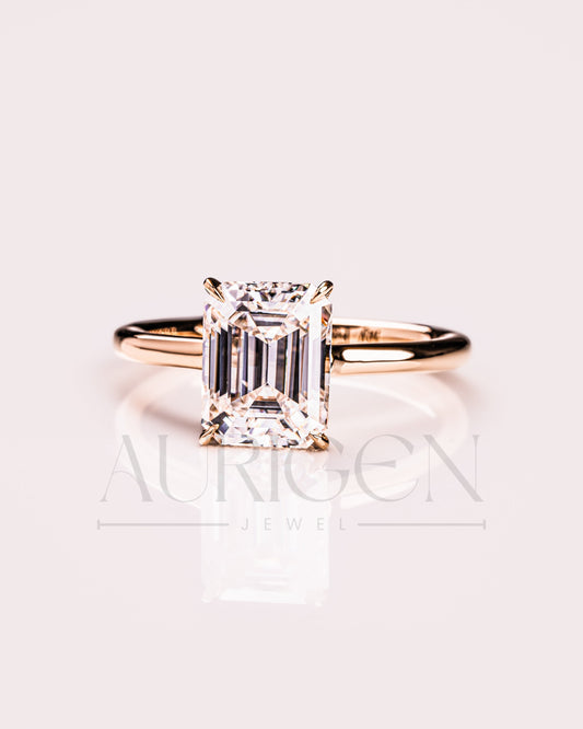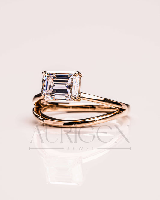 East-West Emerald Cut Solitaire Ring in Solid Gold Ring-Moissanite and Lab Grown Diamond