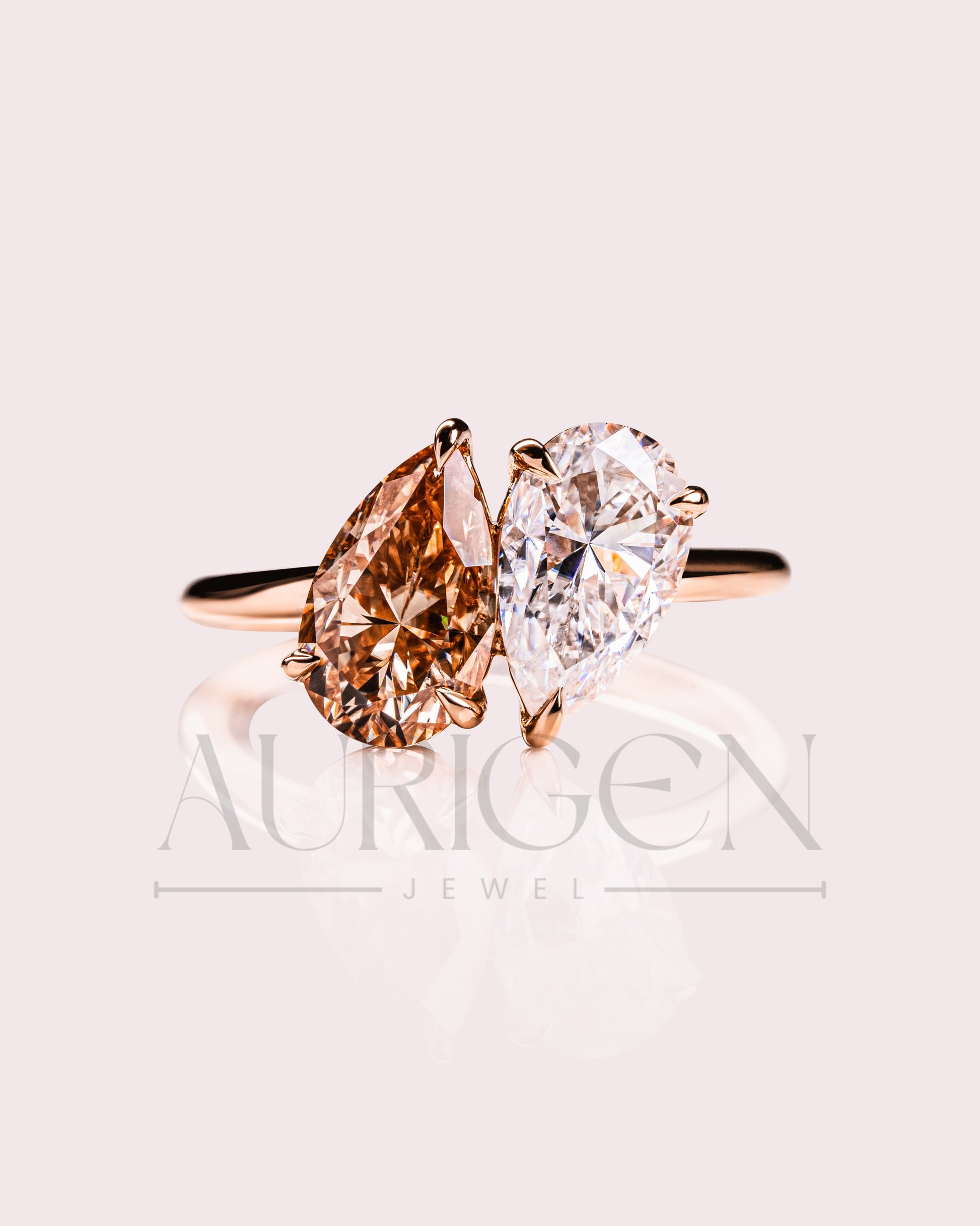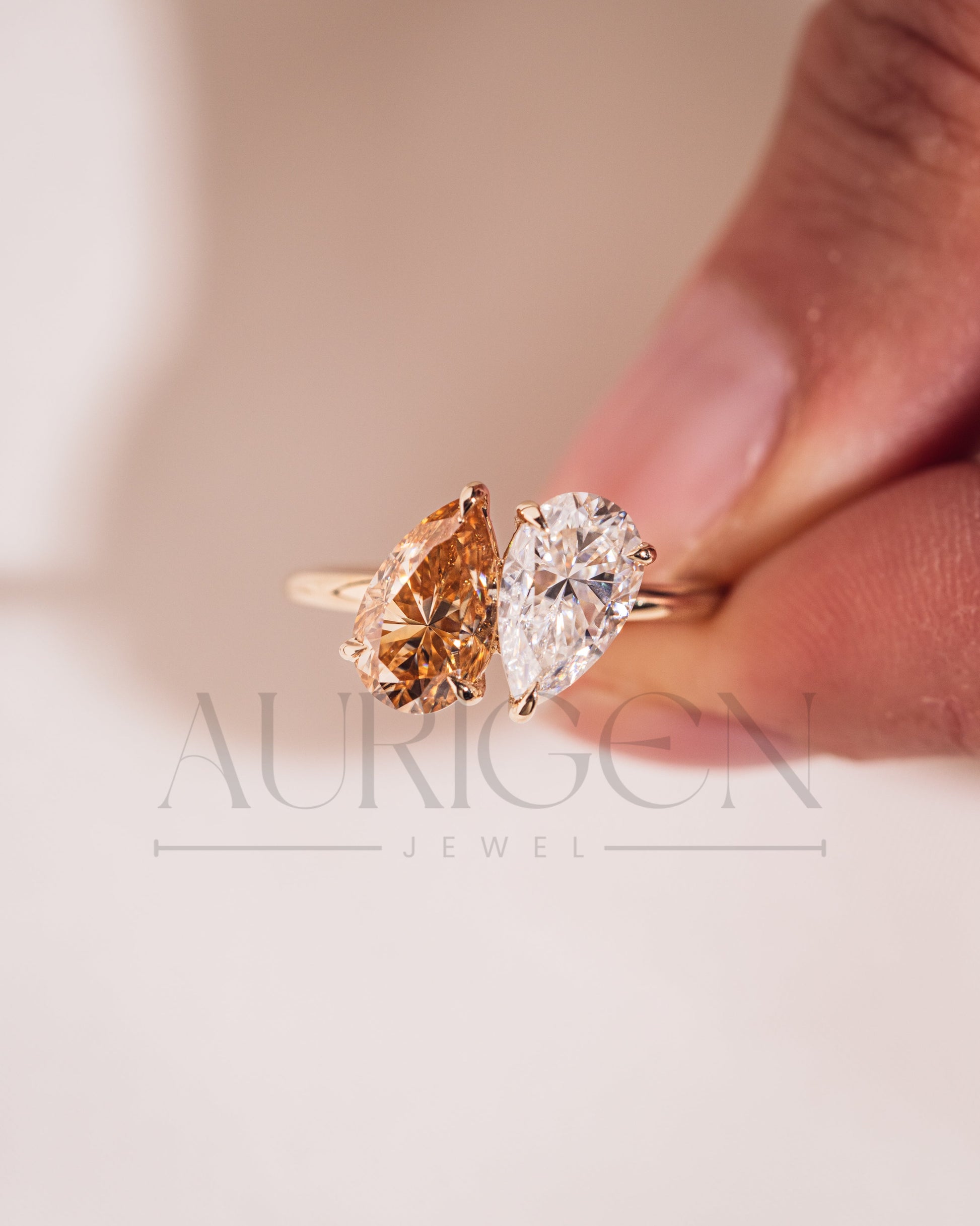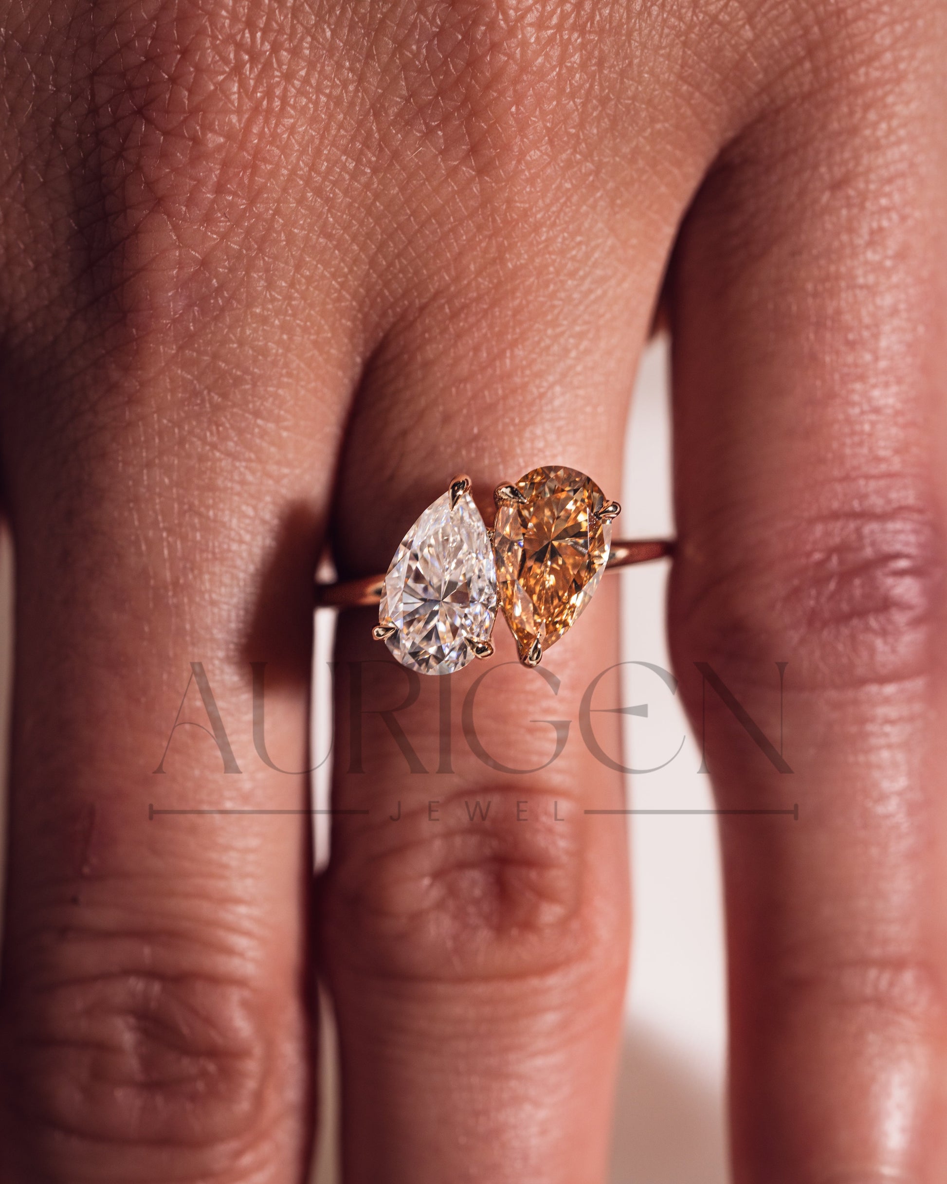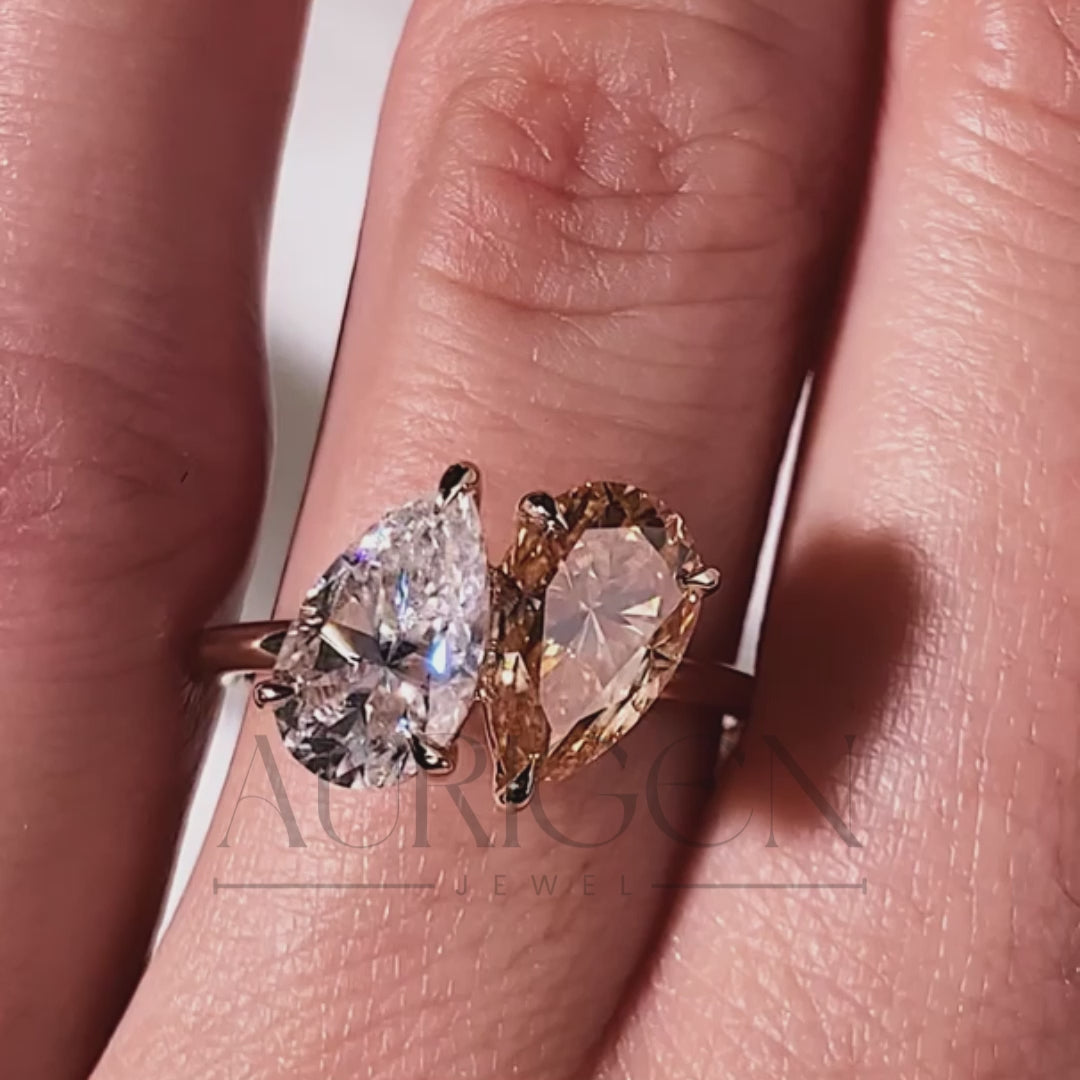 14k Solid Gold Two-Stone Pear Cut Lab Grown and Moissanite Diamond Engagement Ring