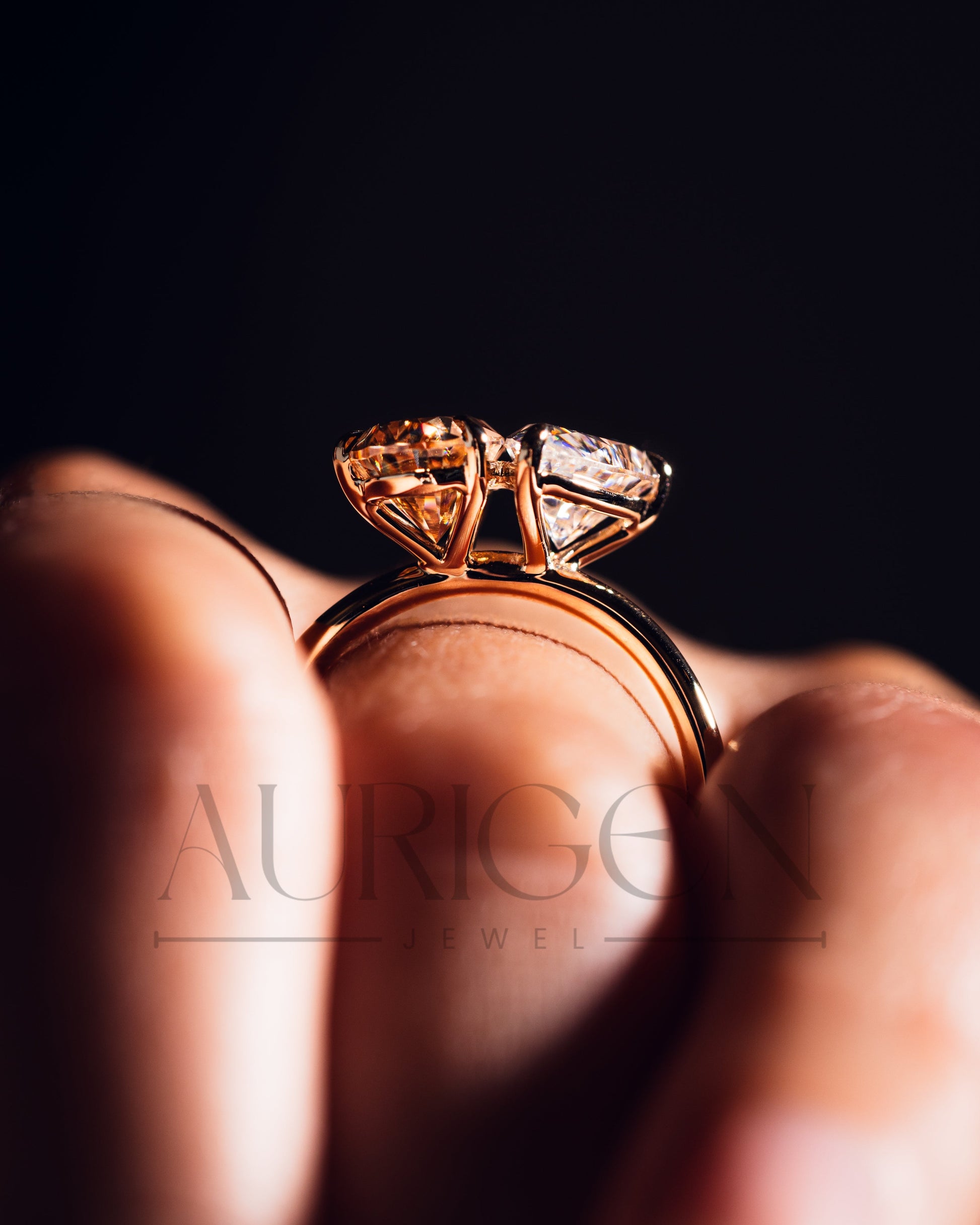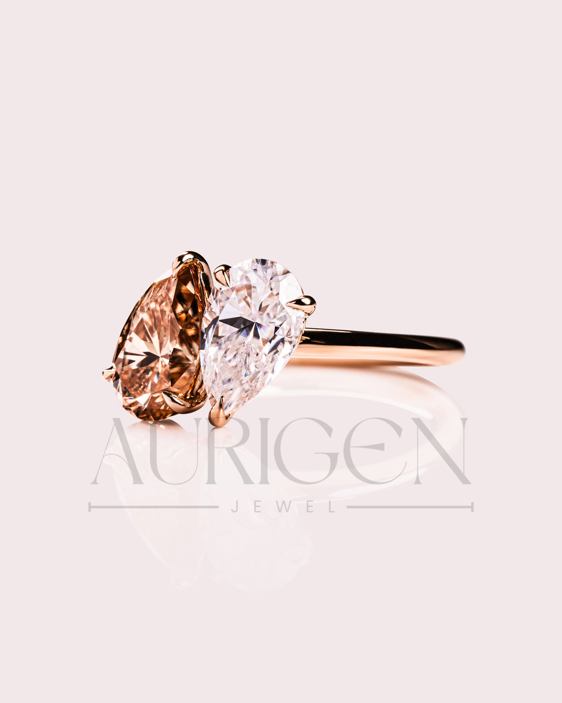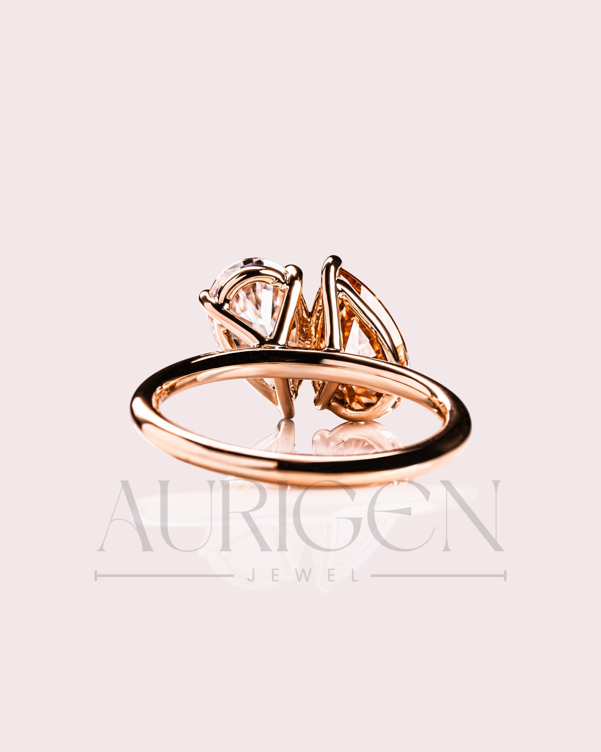 14k Solid Gold Two-Stone Pear Cut Lab Grown and Moissanite Diamond Engagement Ring