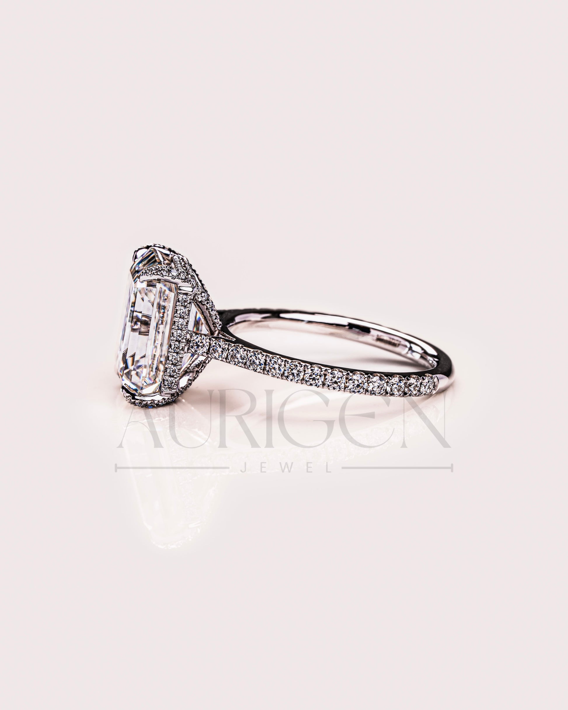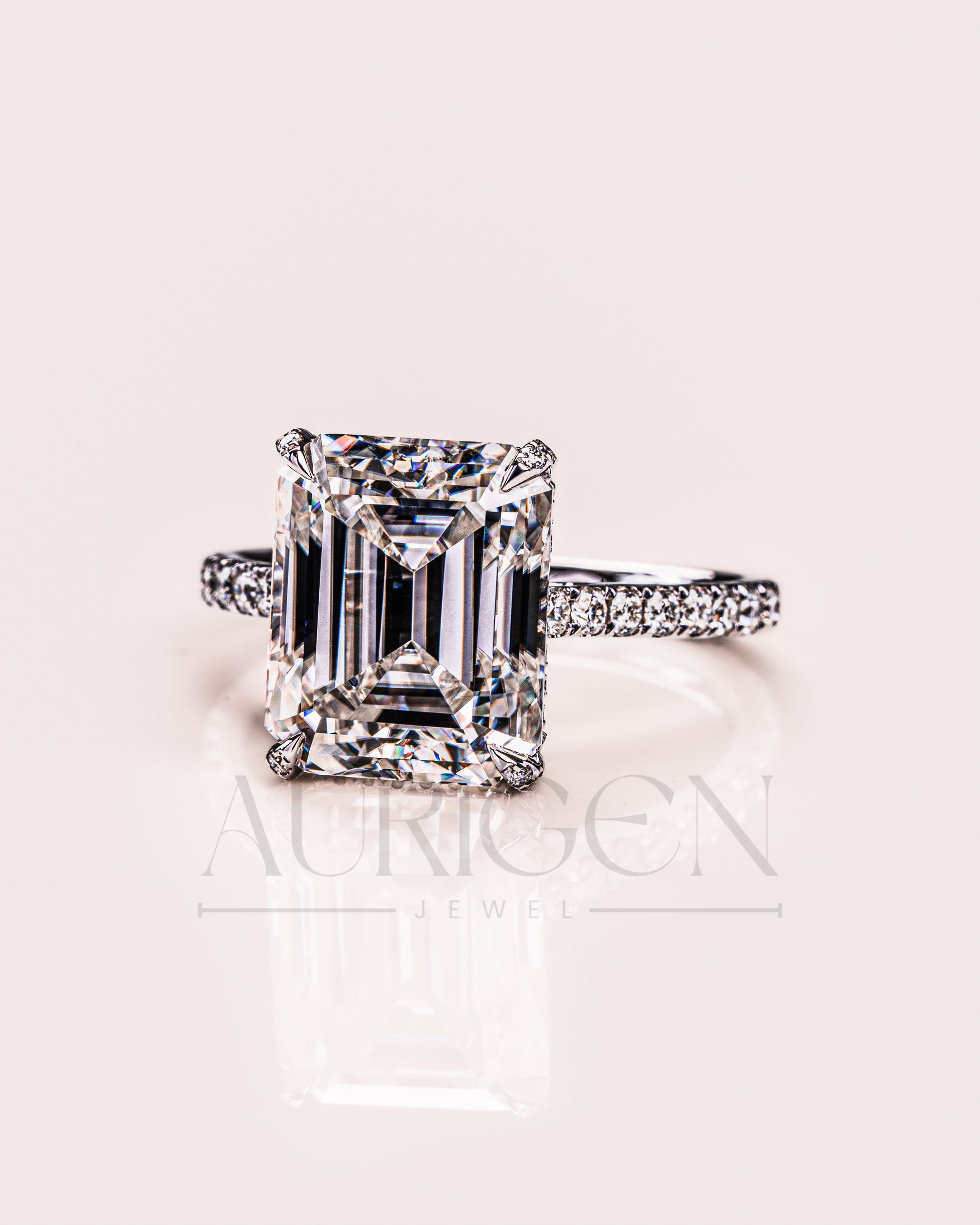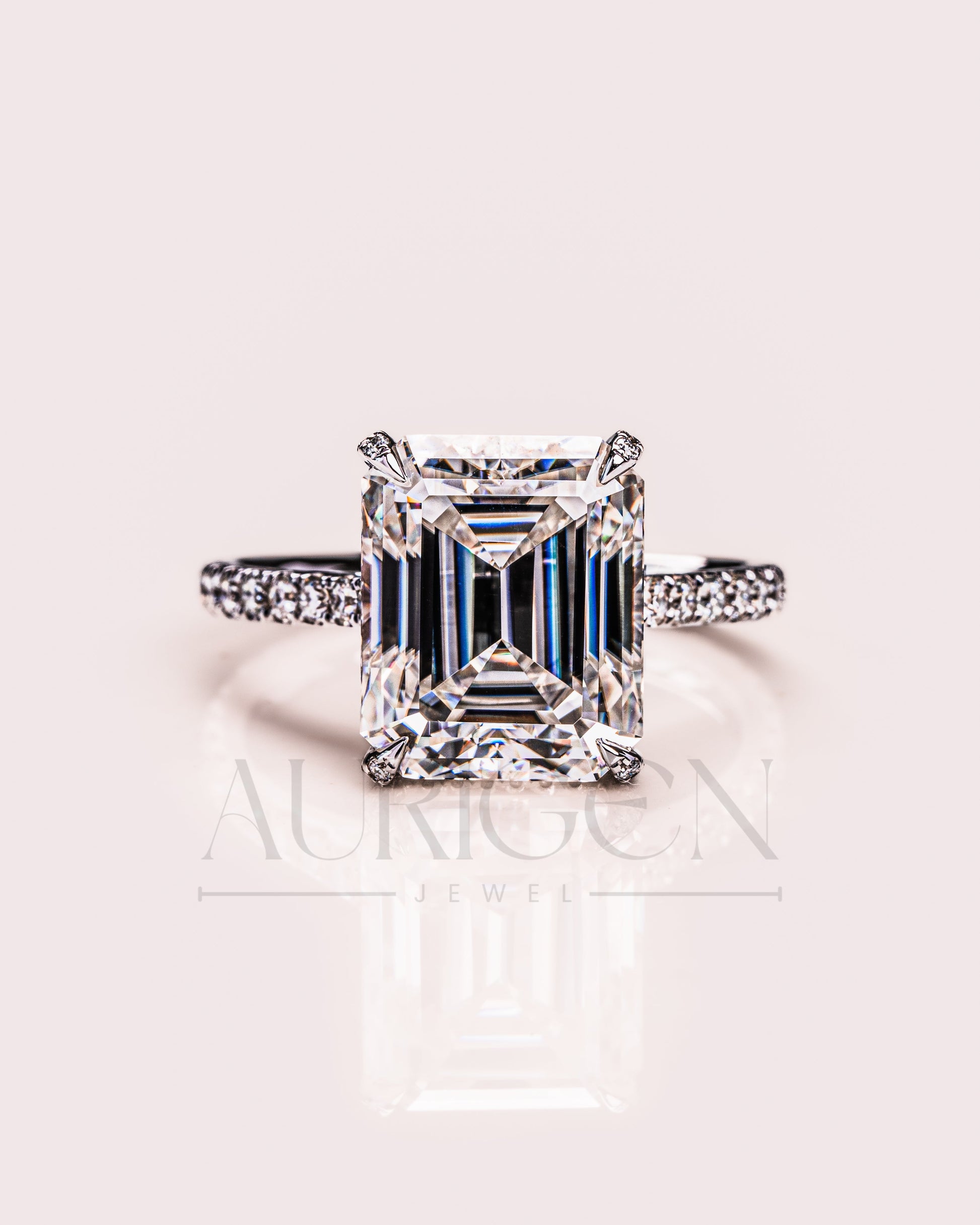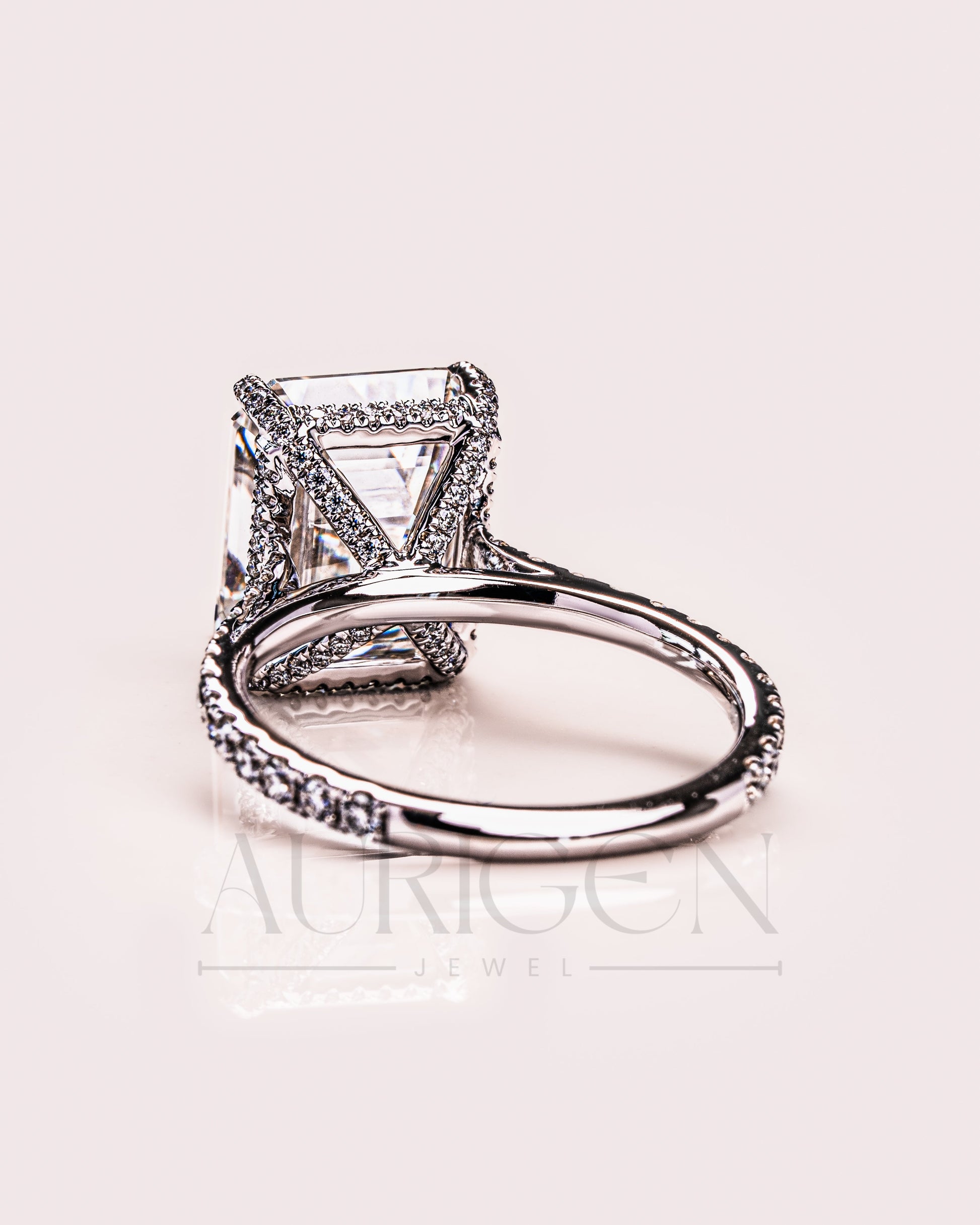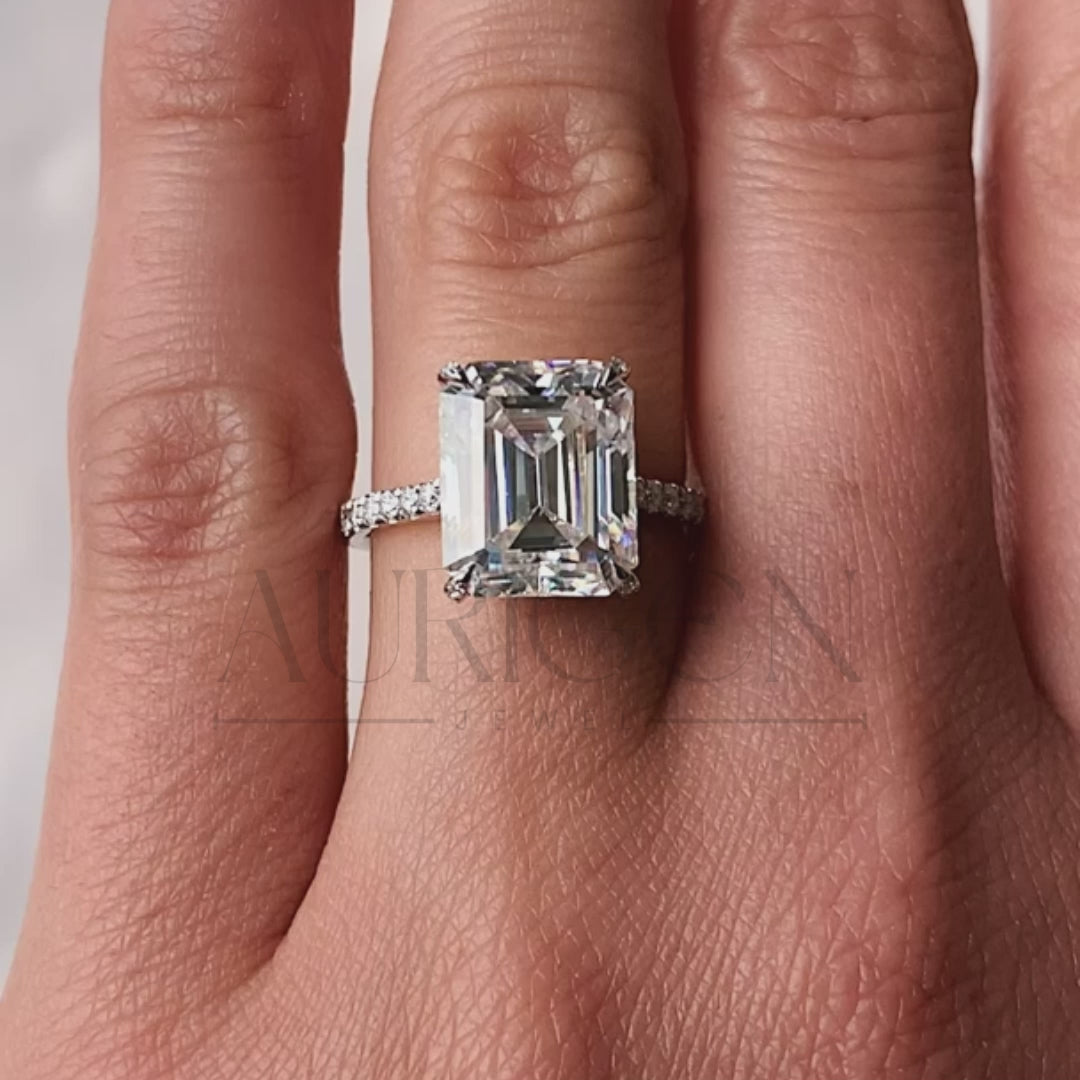 14k White Gold Emerald Cut Moissanite and Leb Engagement Ring Hidden With pave Diamond Ring