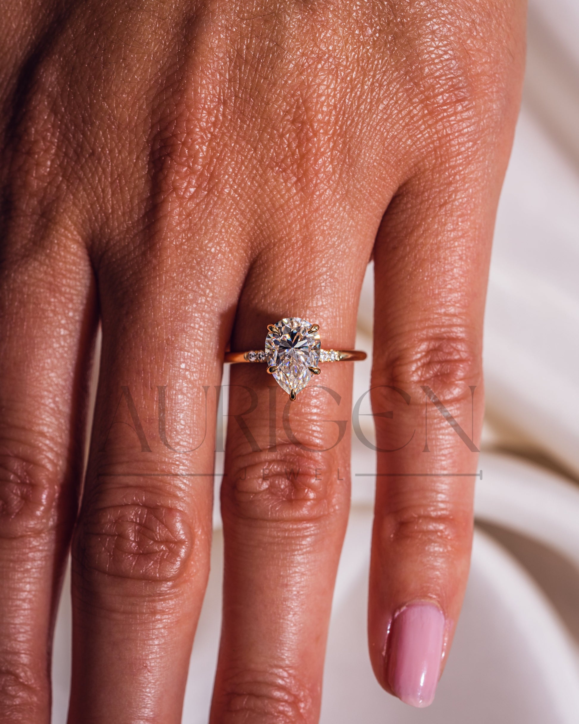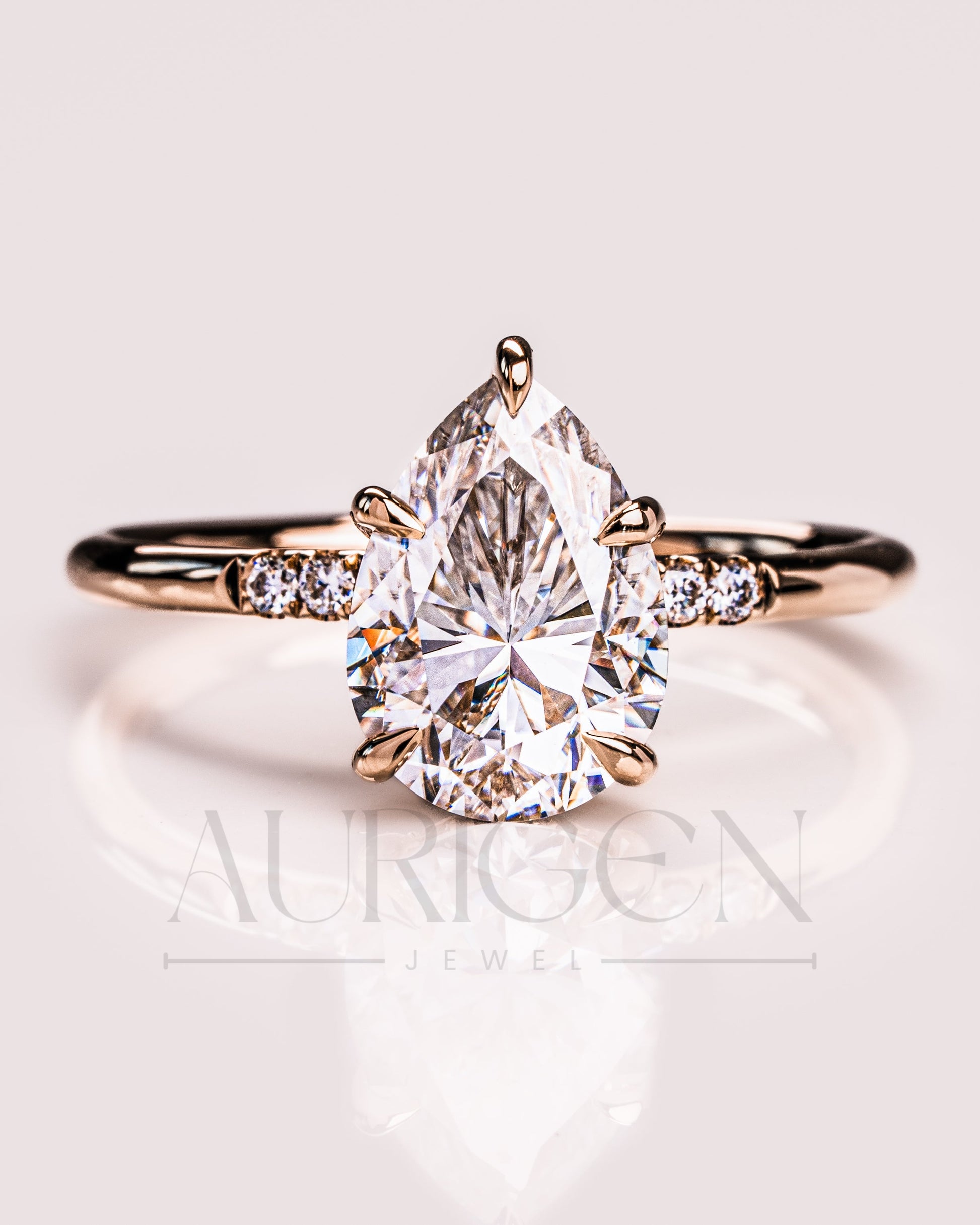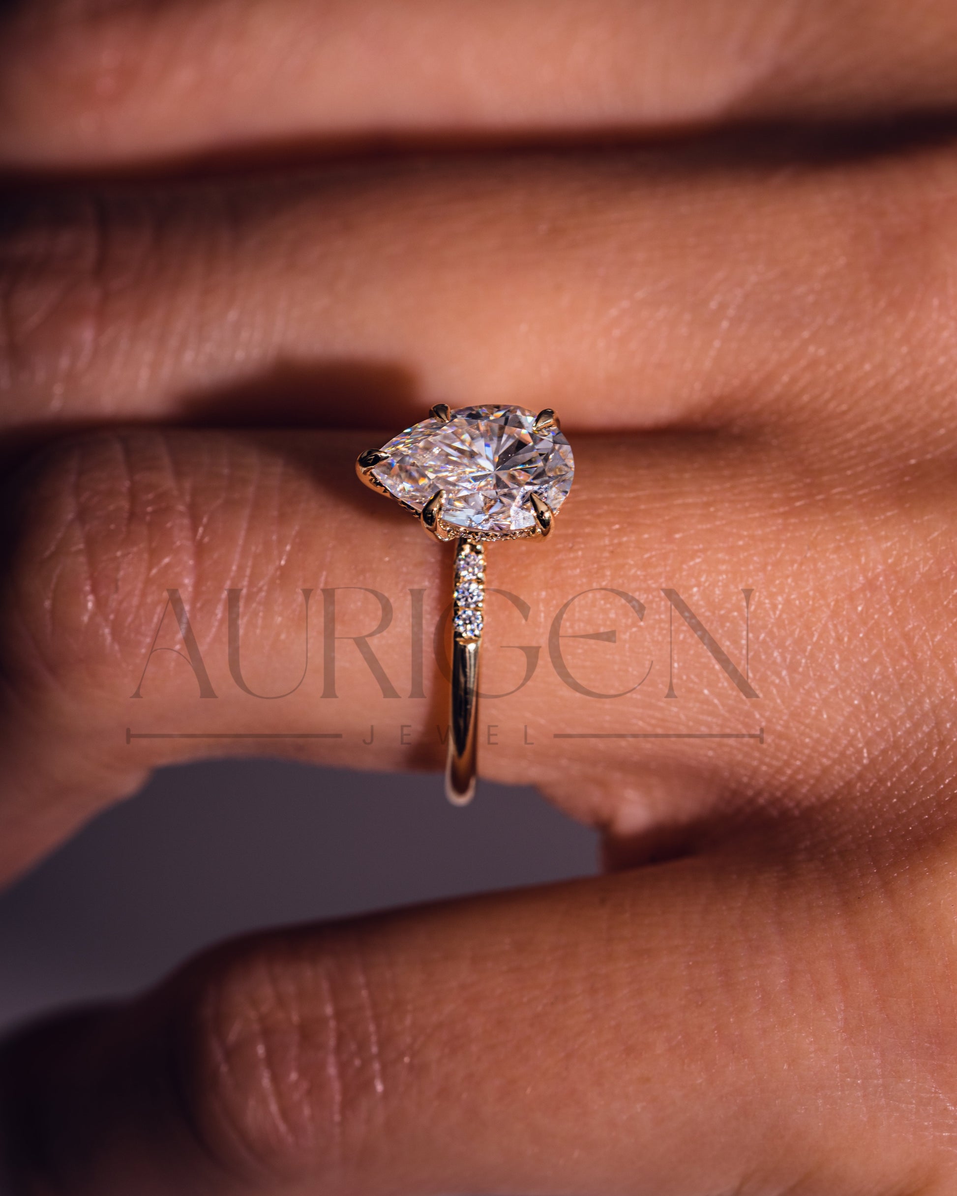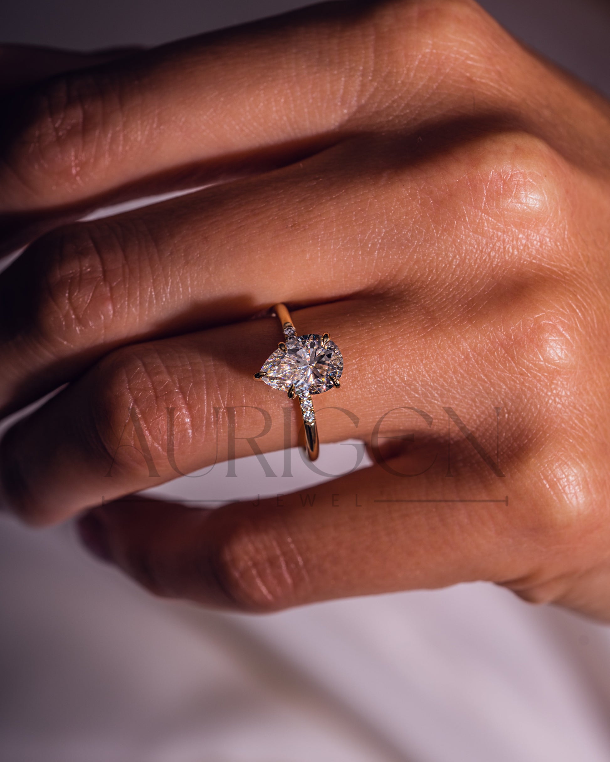 2.5 Ct Pear 5-Prong Moissanite and Leb Diamond Ring Hidden Halo With Side Diamond Ring