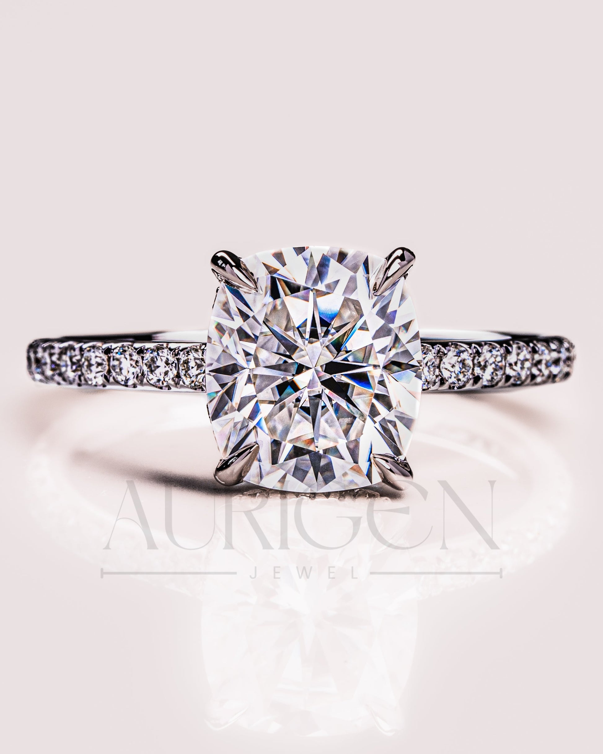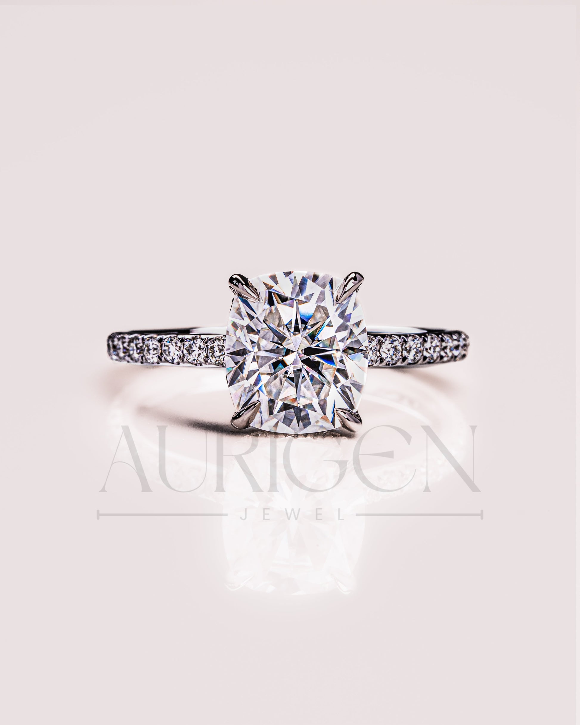 4-Prong Cushion Brilliant Moissanite & Leb Diamond Ring Halo With Pave Setting Solid Gold Ring