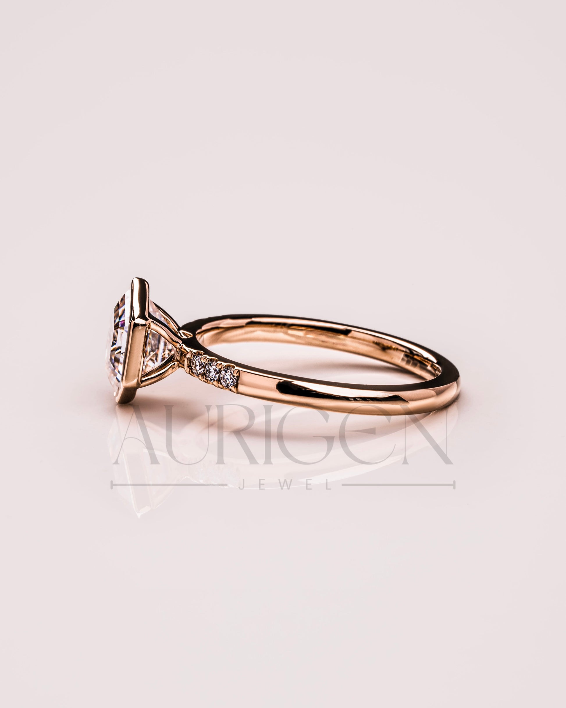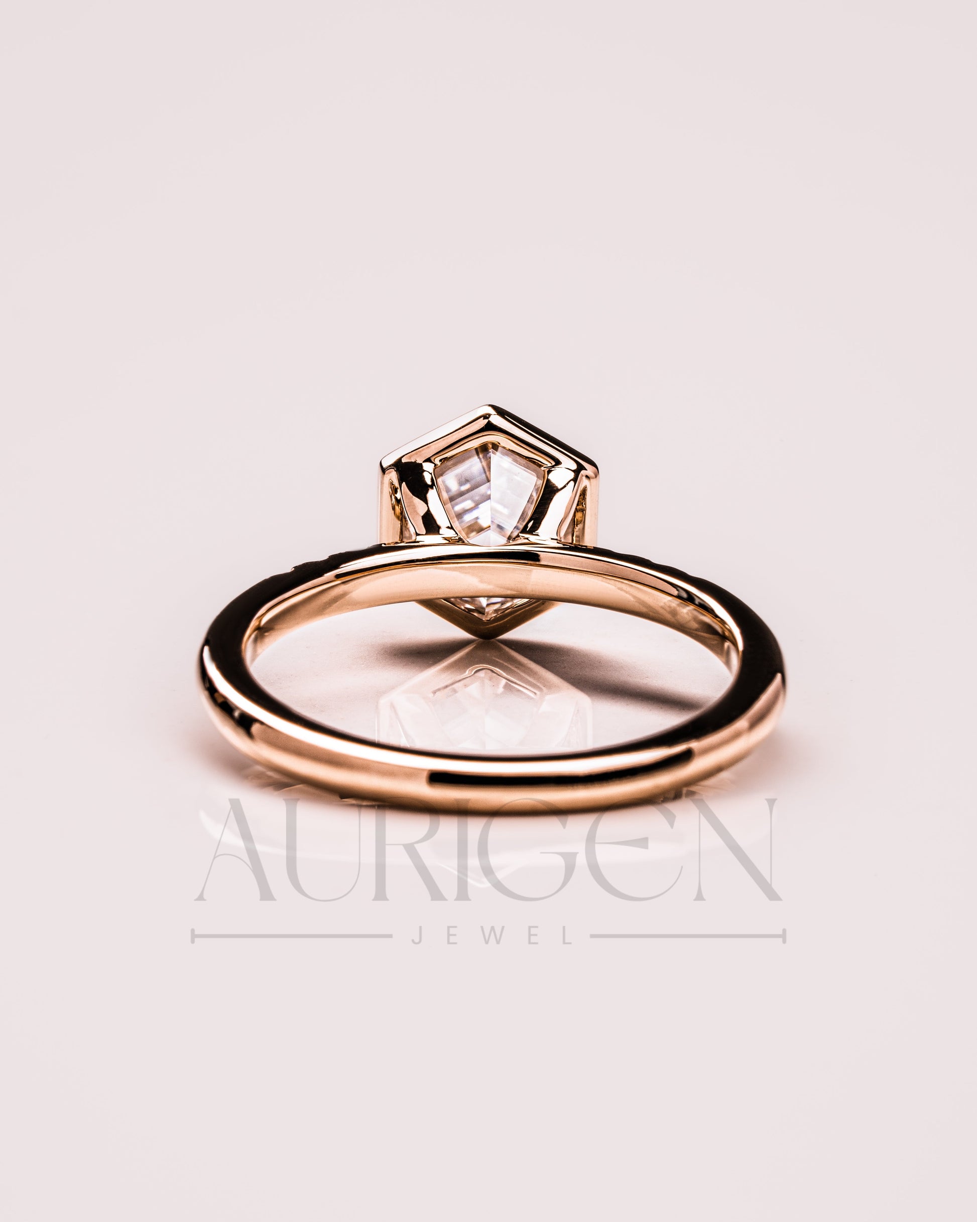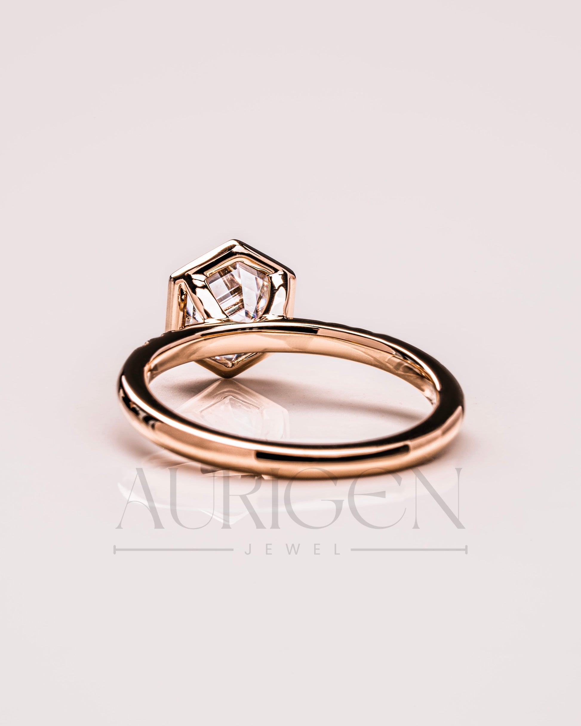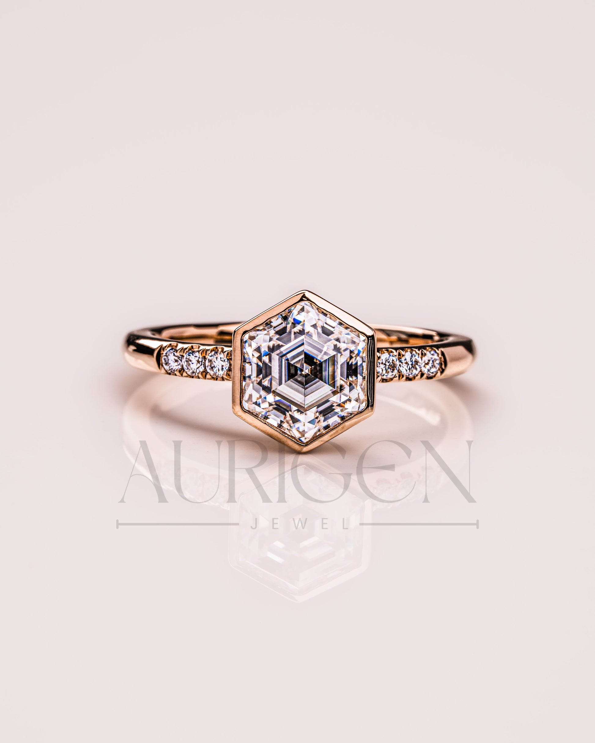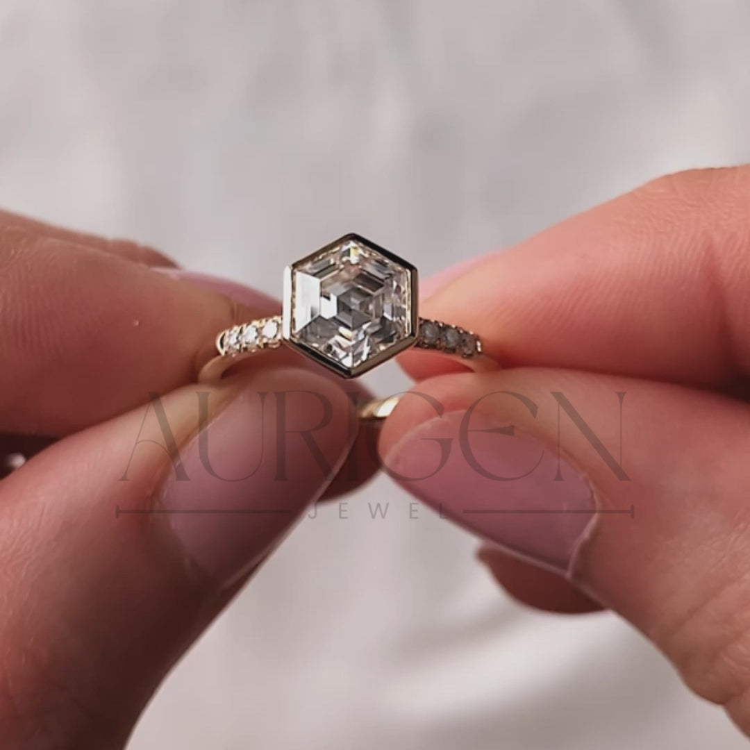 Bezel Setting Hexagon Cut Moissanite and Lab Grown Diamond Ring in 14K Rose Gold