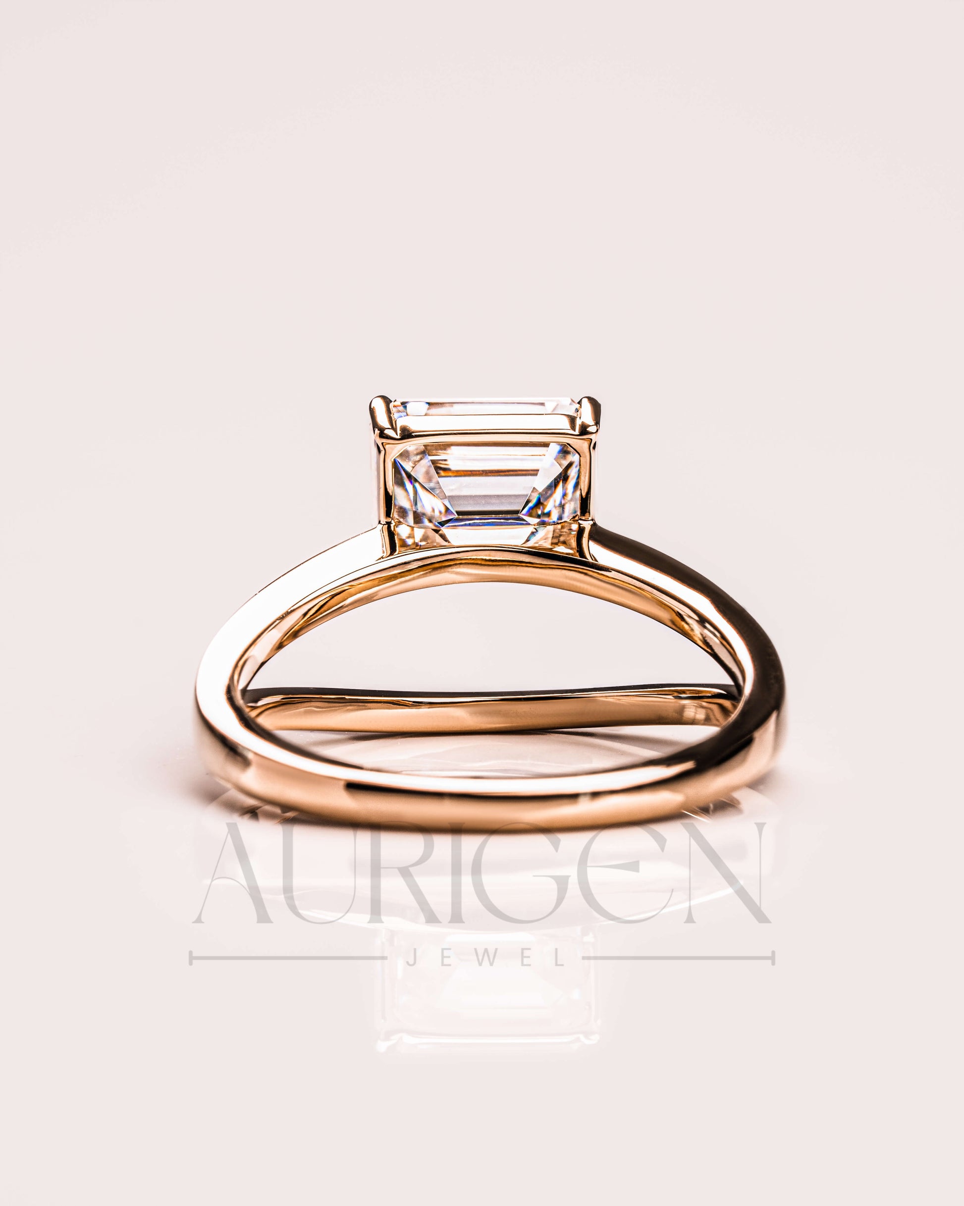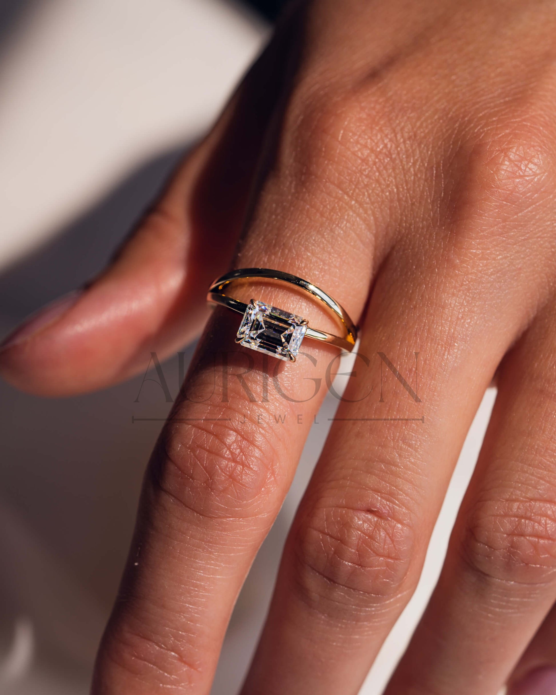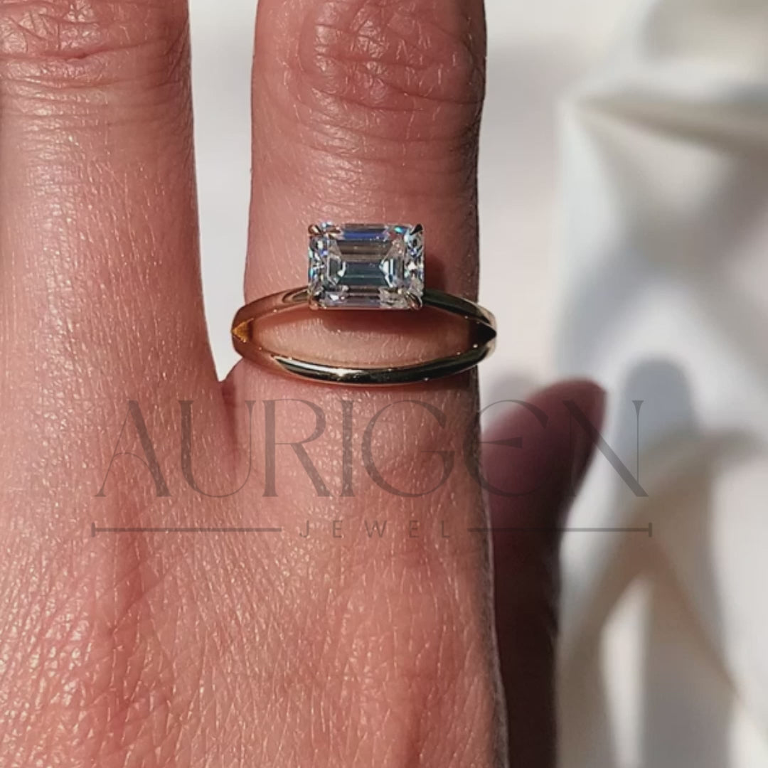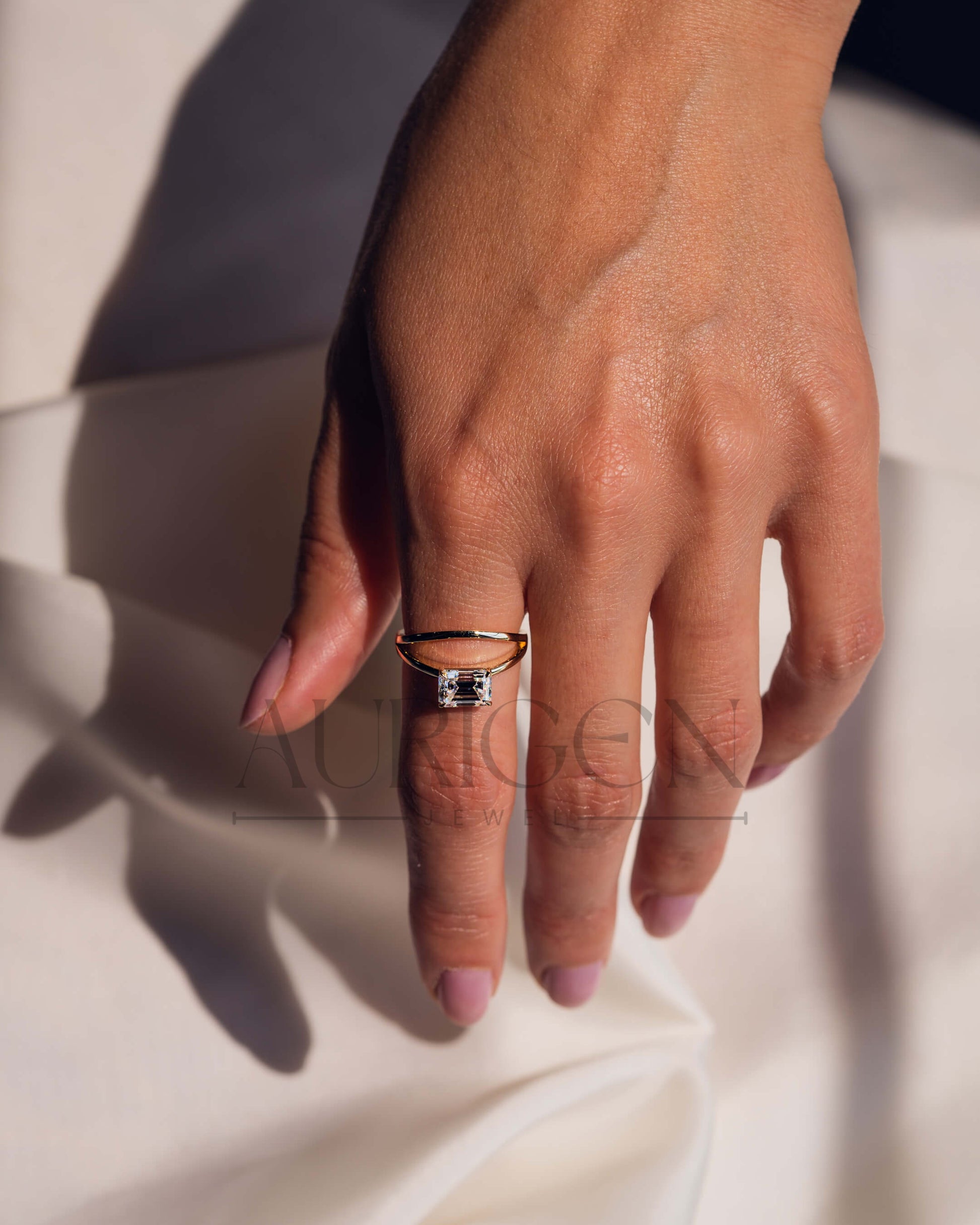 East-West Emerald Cut Solitaire Ring in Solid Gold Ring-Moissanite and Lab Grown Diamond