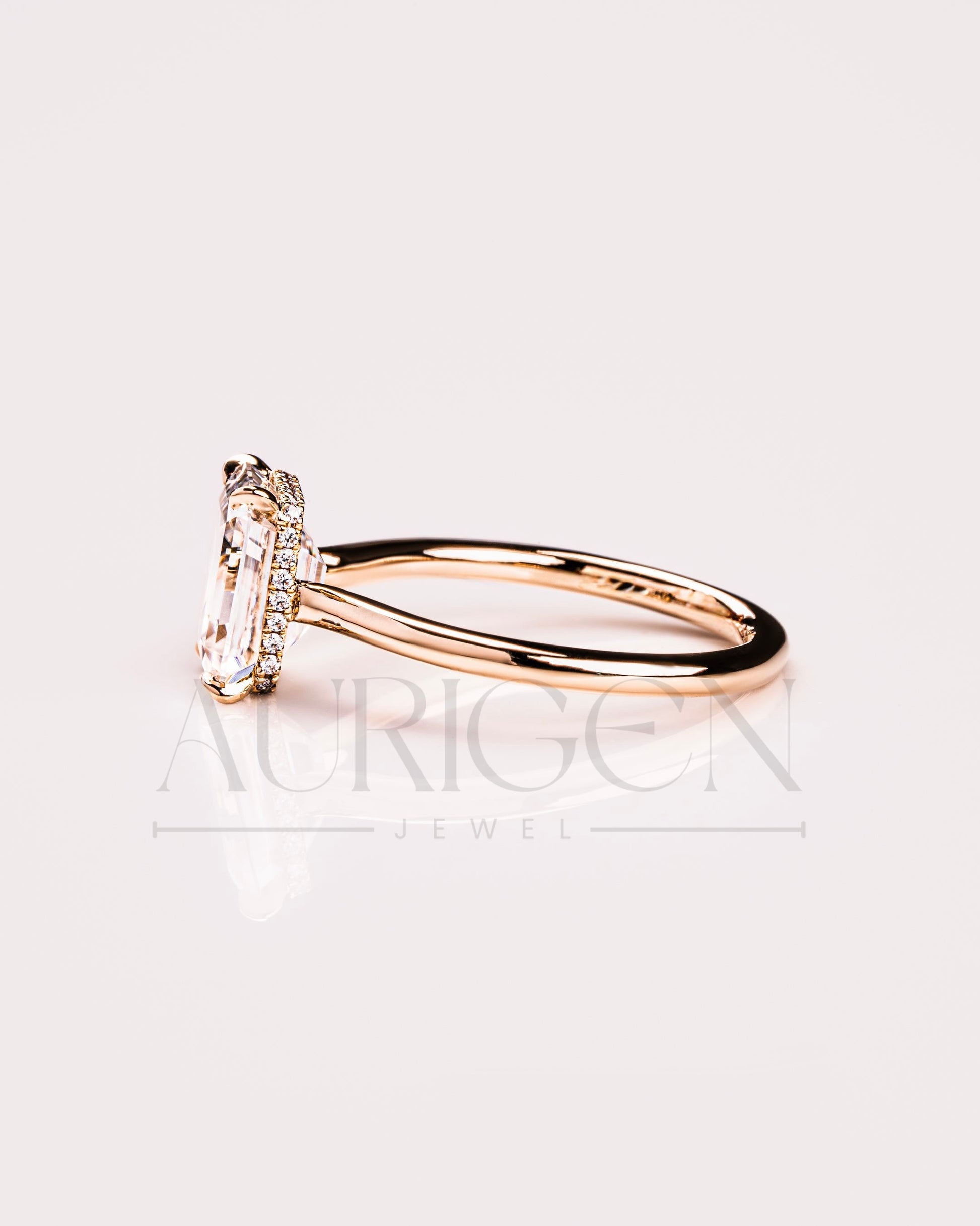 Emerald Cut Solitaire Engagement Ring Halo Moissanite and Leb Diamond 14K White Gold