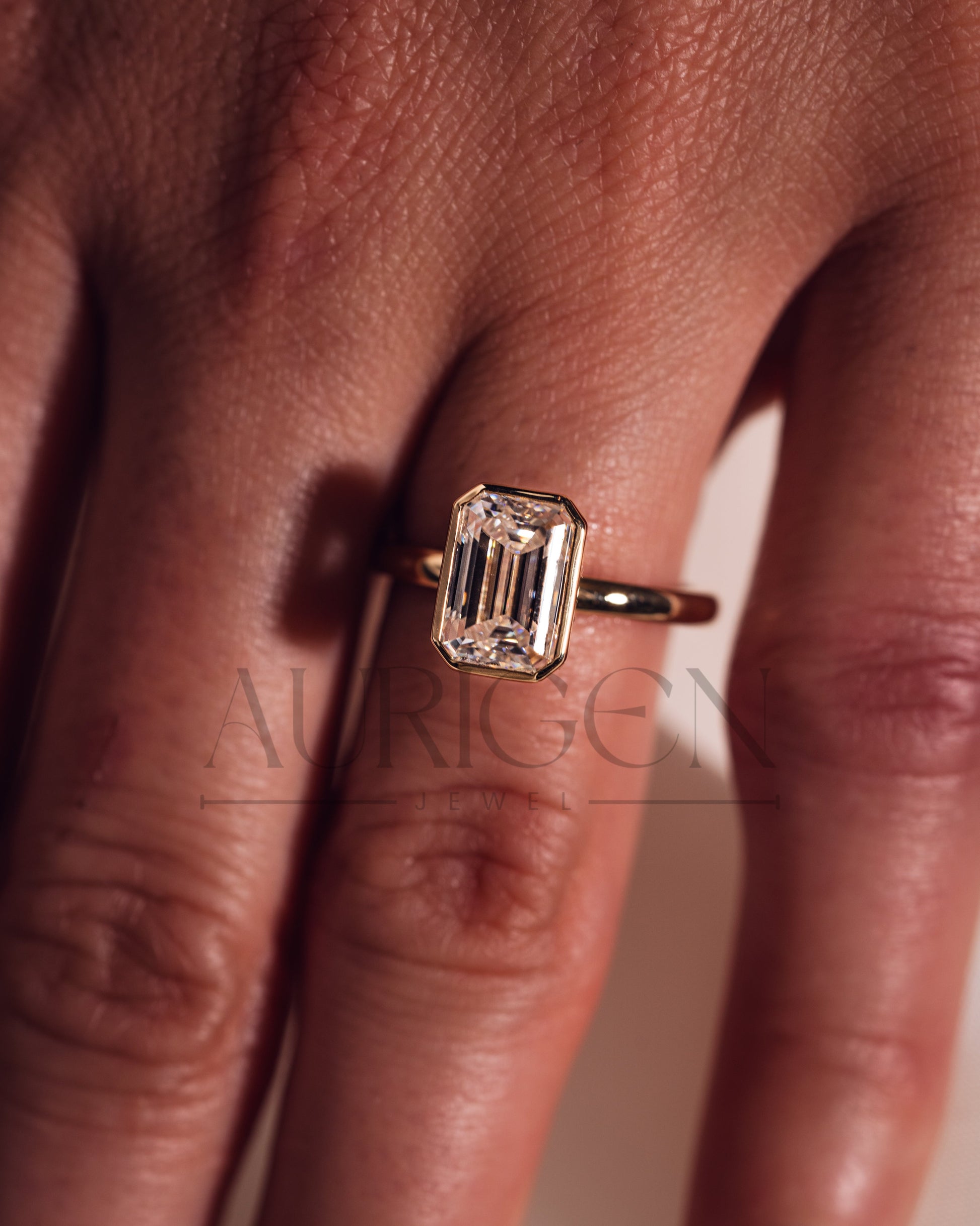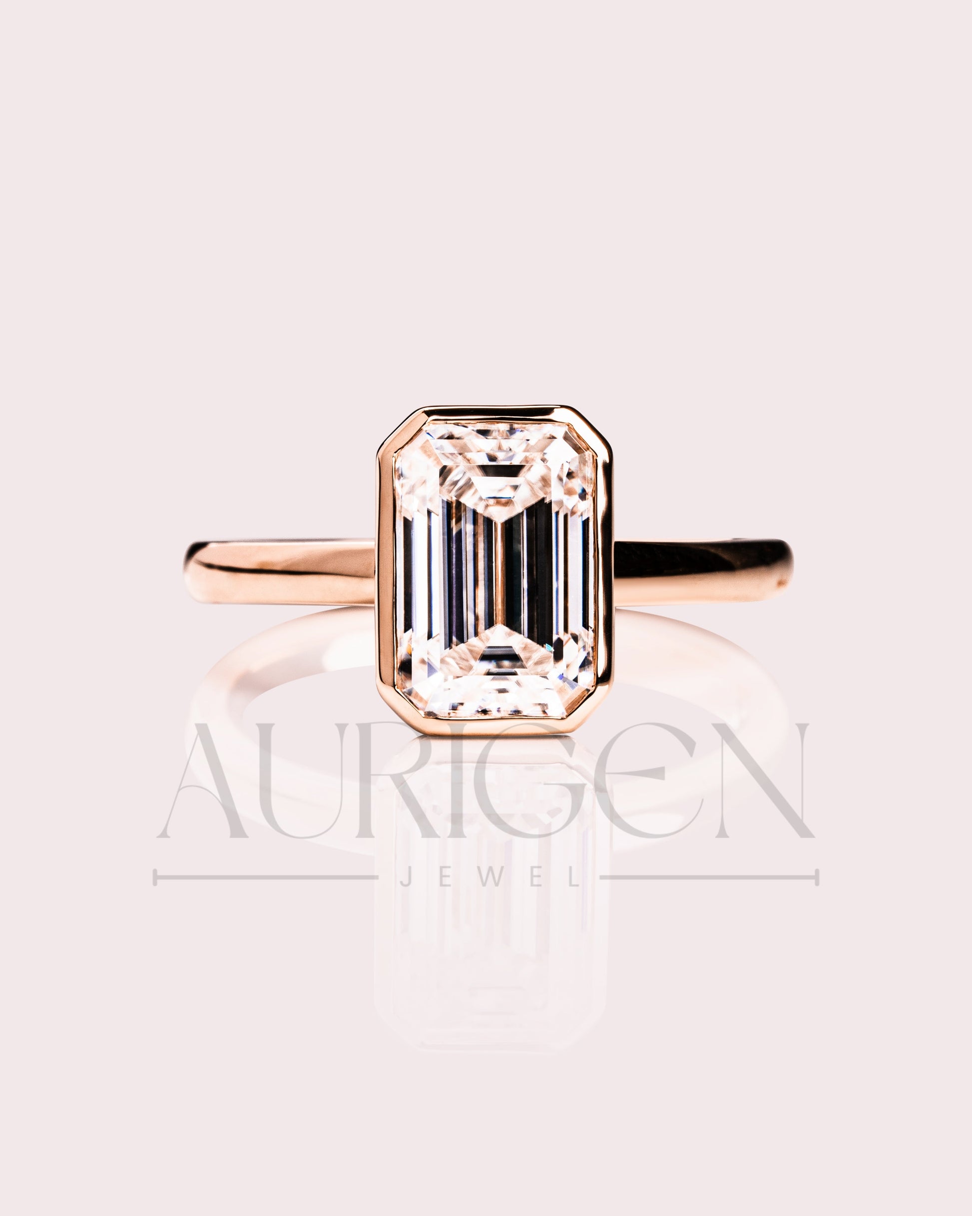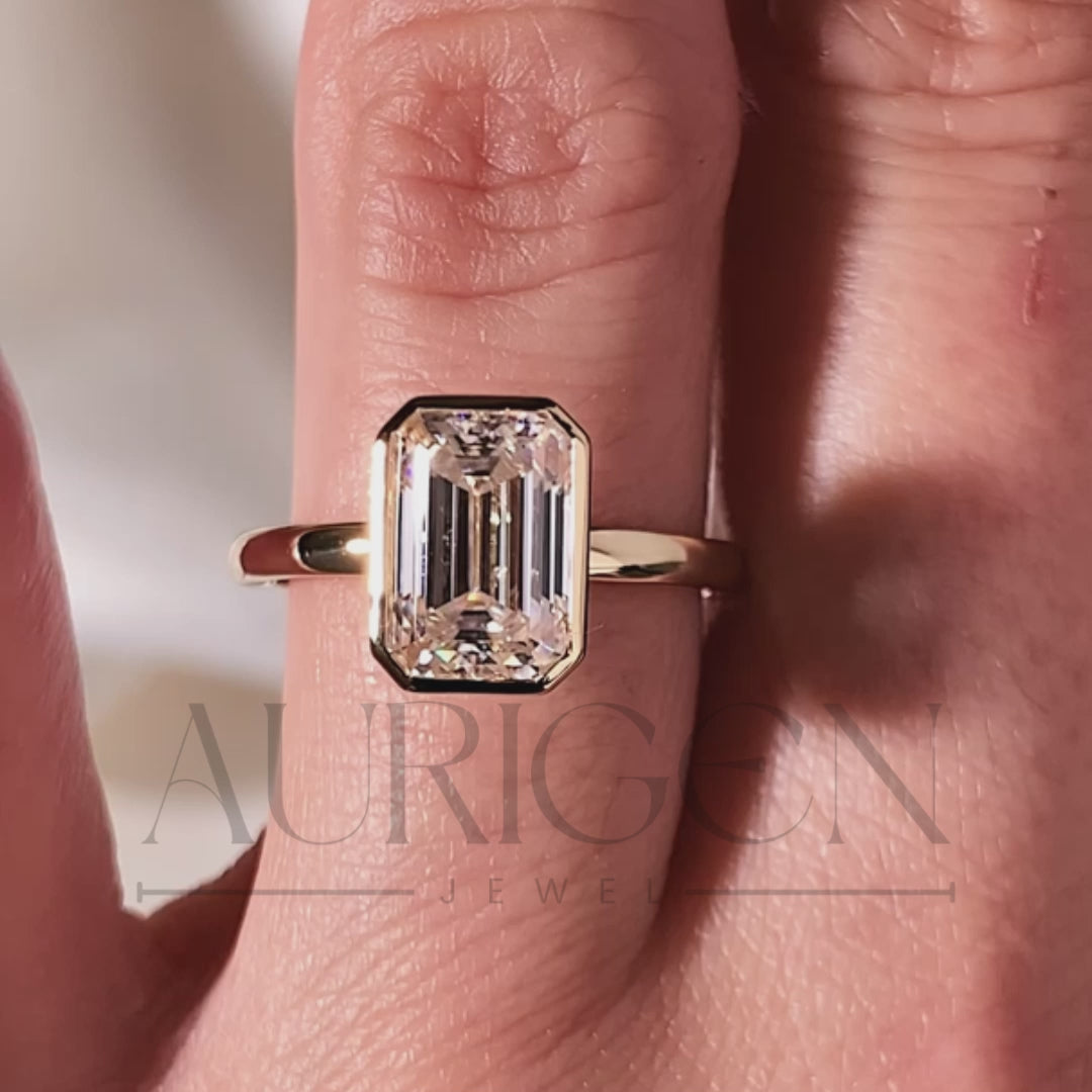 Modern Emerald Cut Moissanite and Lab Grown Diamond Bezel Set Ring