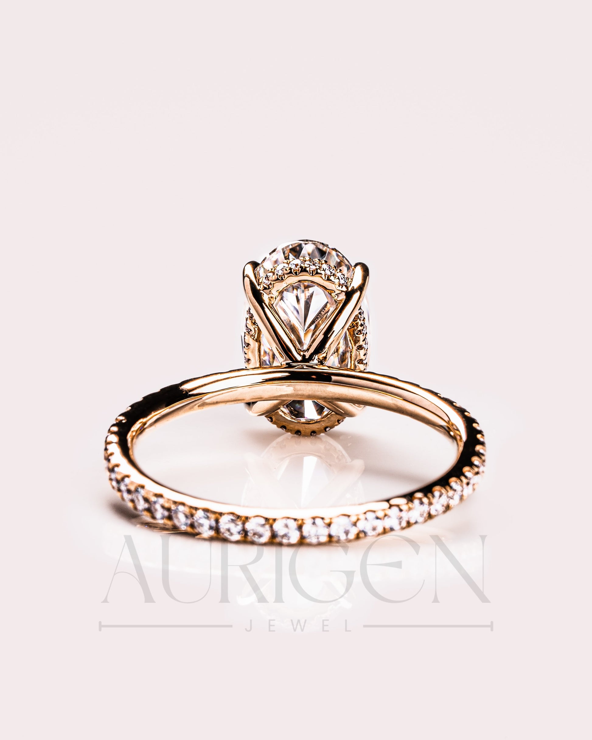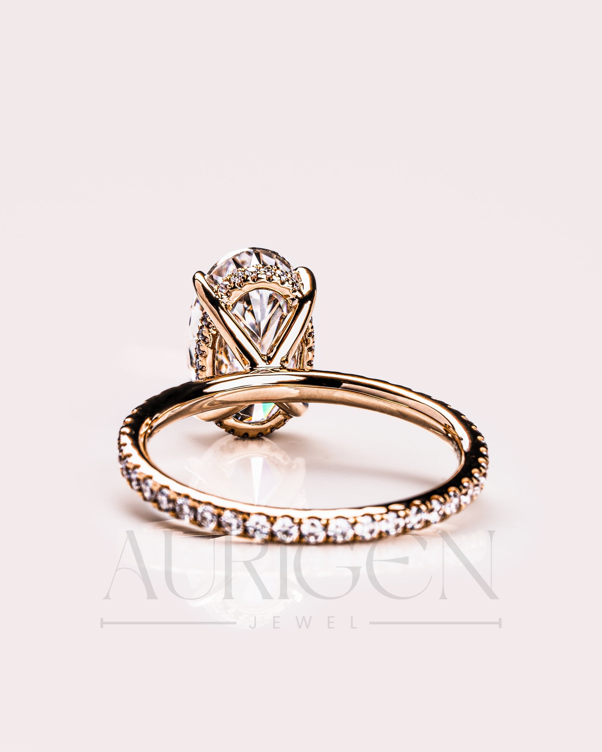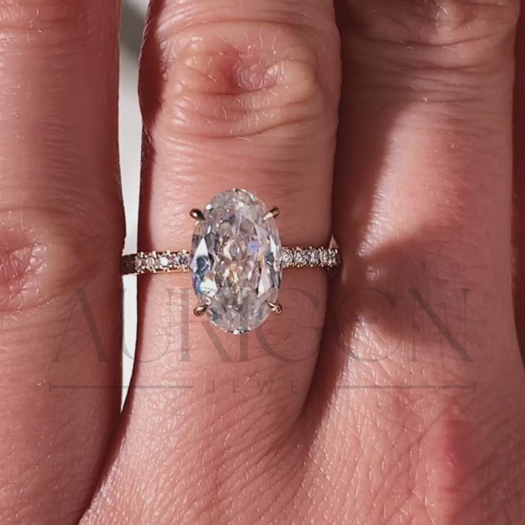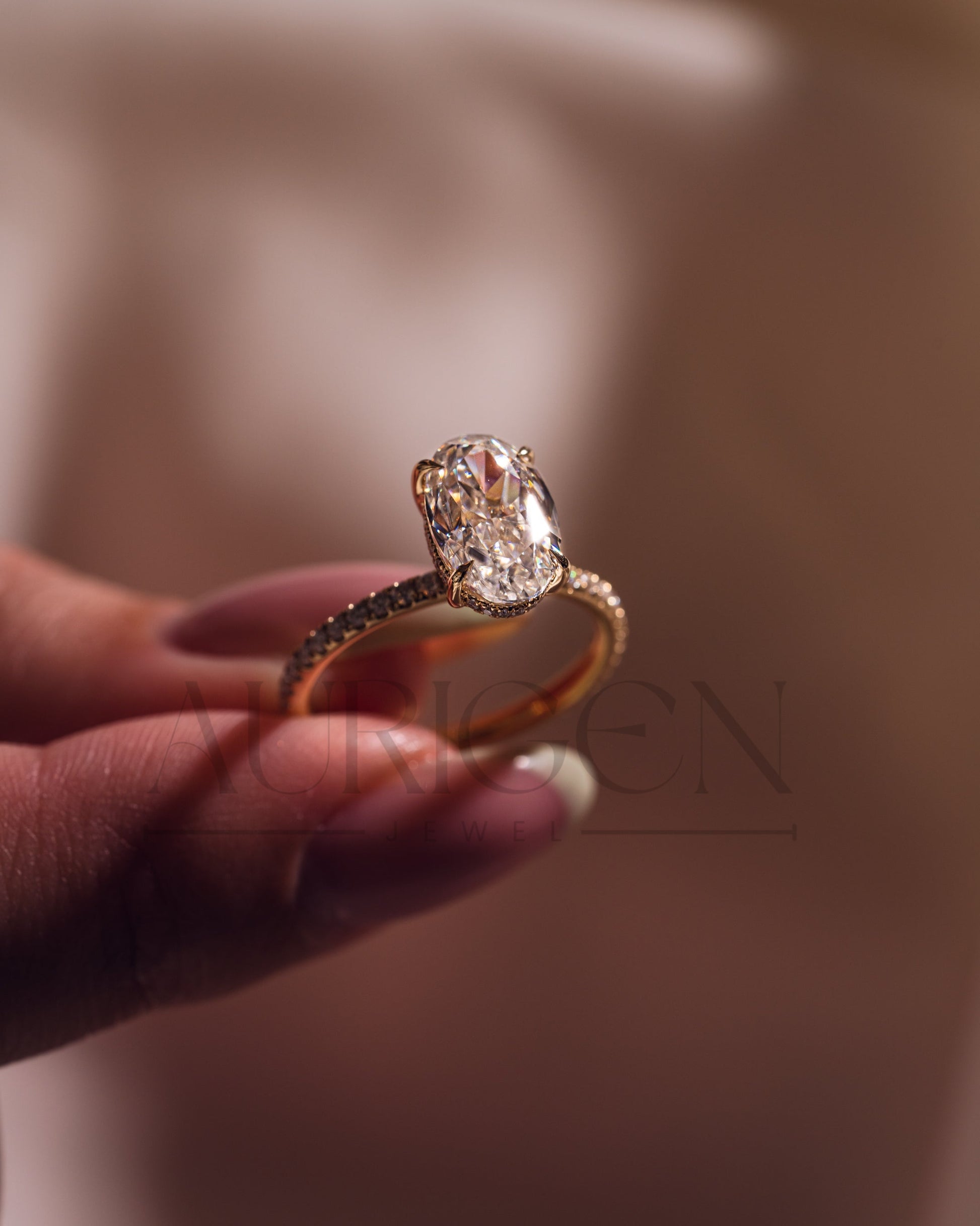 Oval Moissanite & Leb Diamond Ring Sparkling Full Pave Band & Hidden Halo Diamond Ring