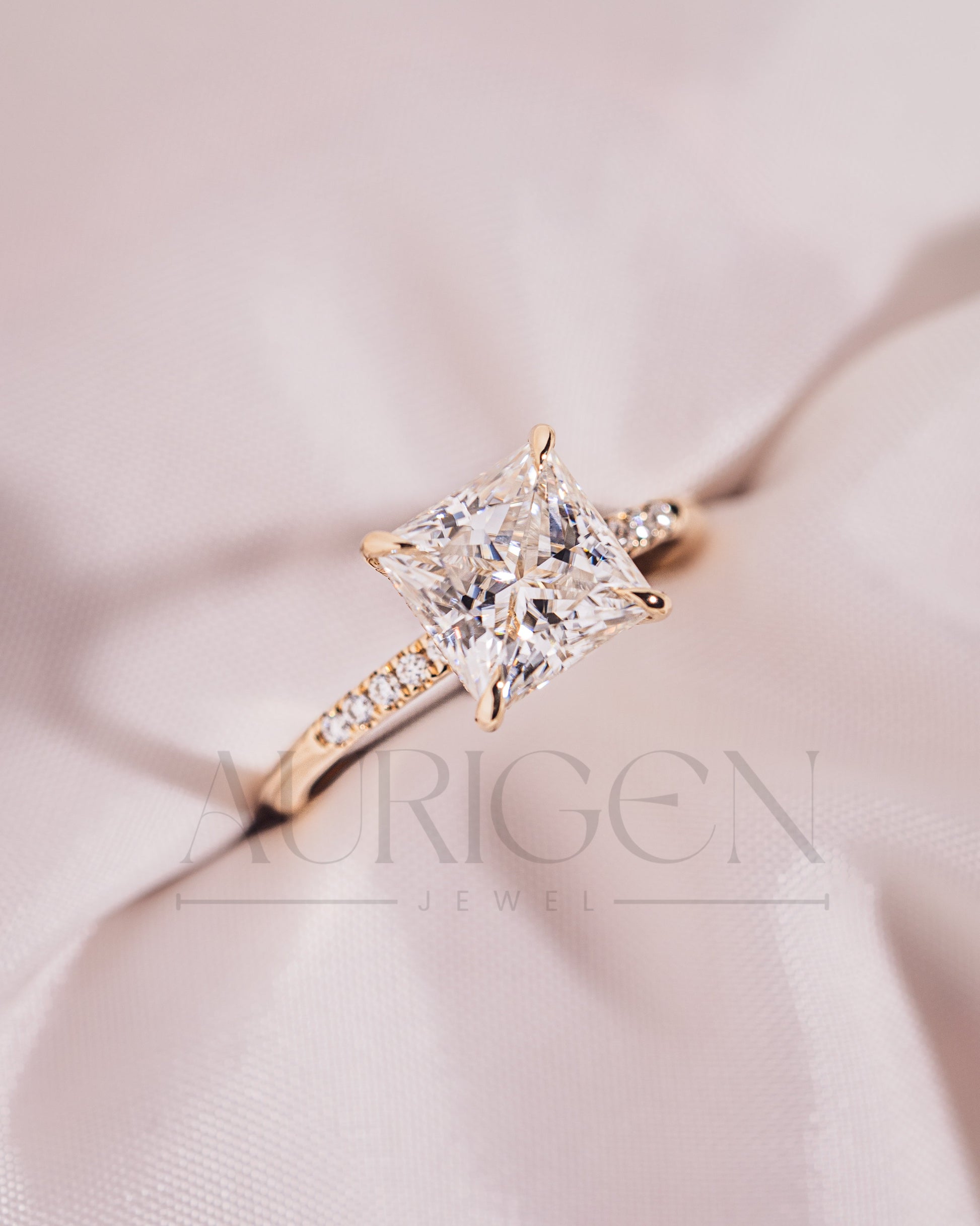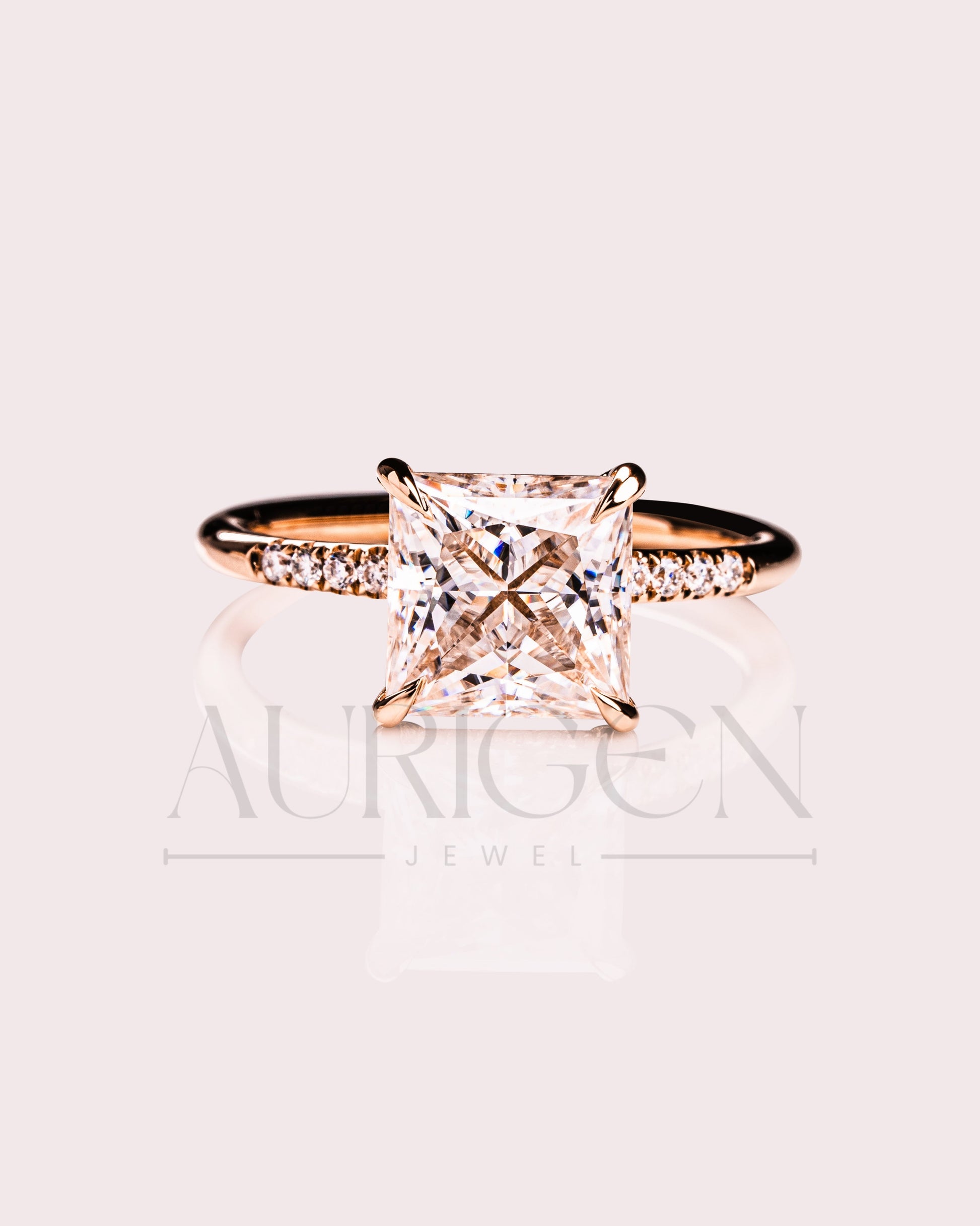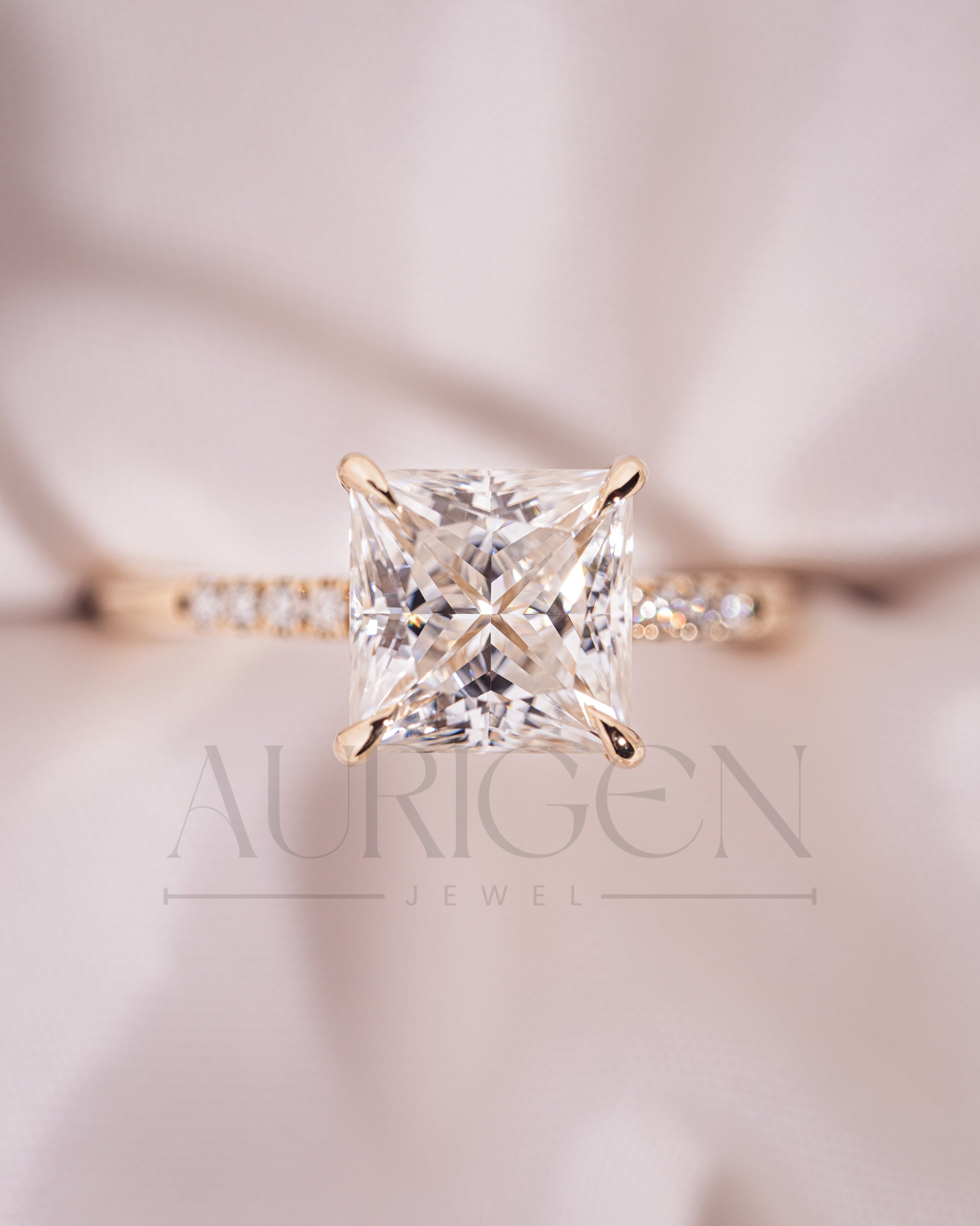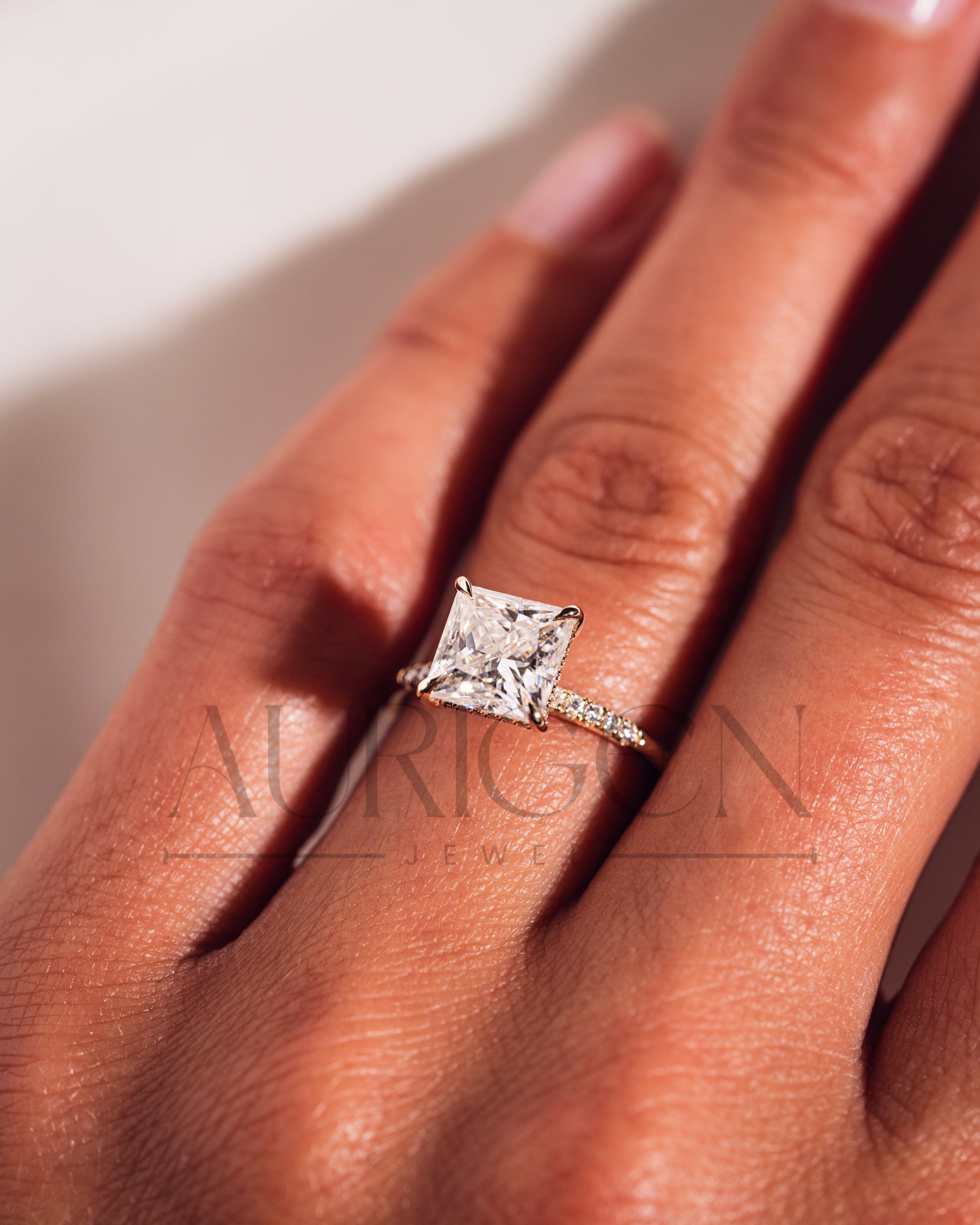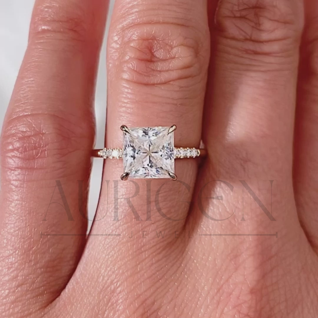 Princess Cut Moissanite & Leb Grown Engagement Ring with Hidden Halo and Side Diamond Ring
