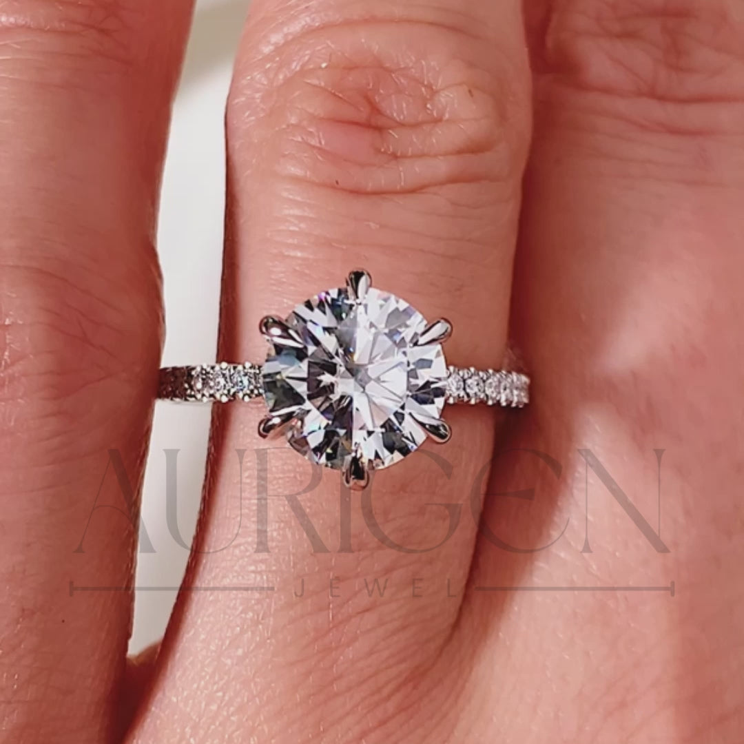 Round 6-Prong Moissanite & Leb Grown Engagement Ring with Pave Band in 14k White Gold