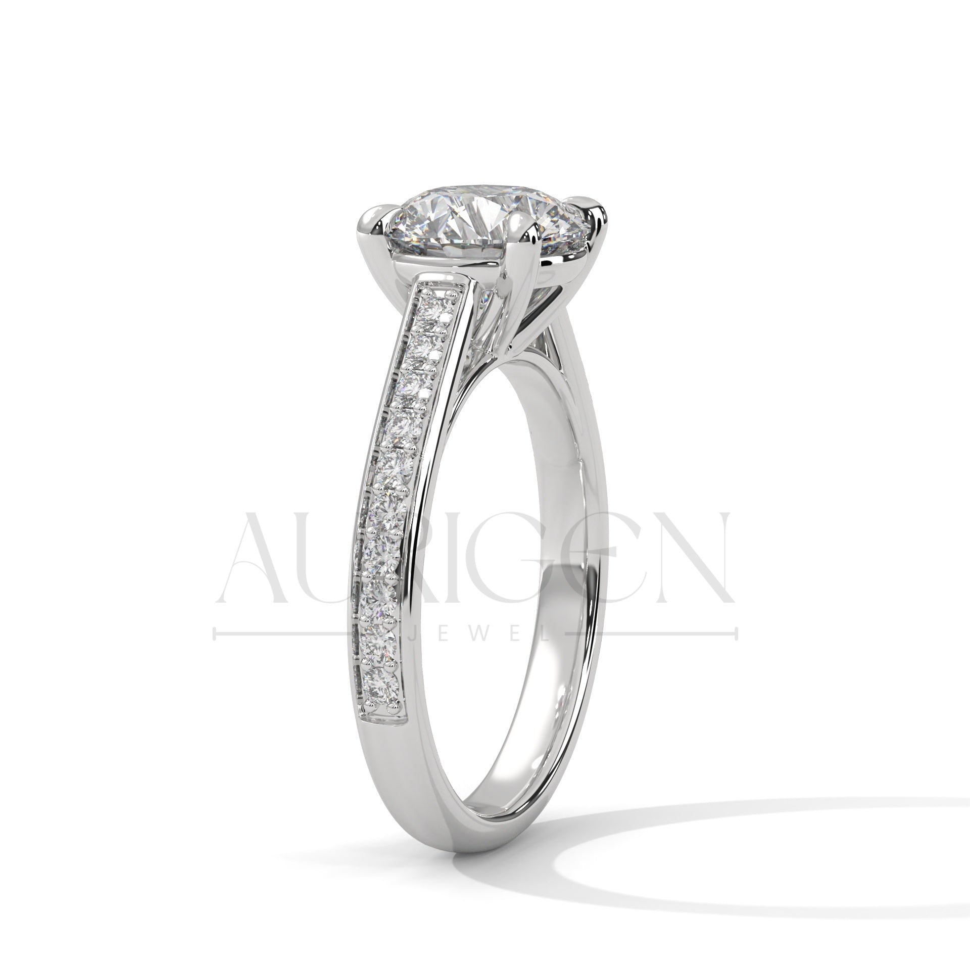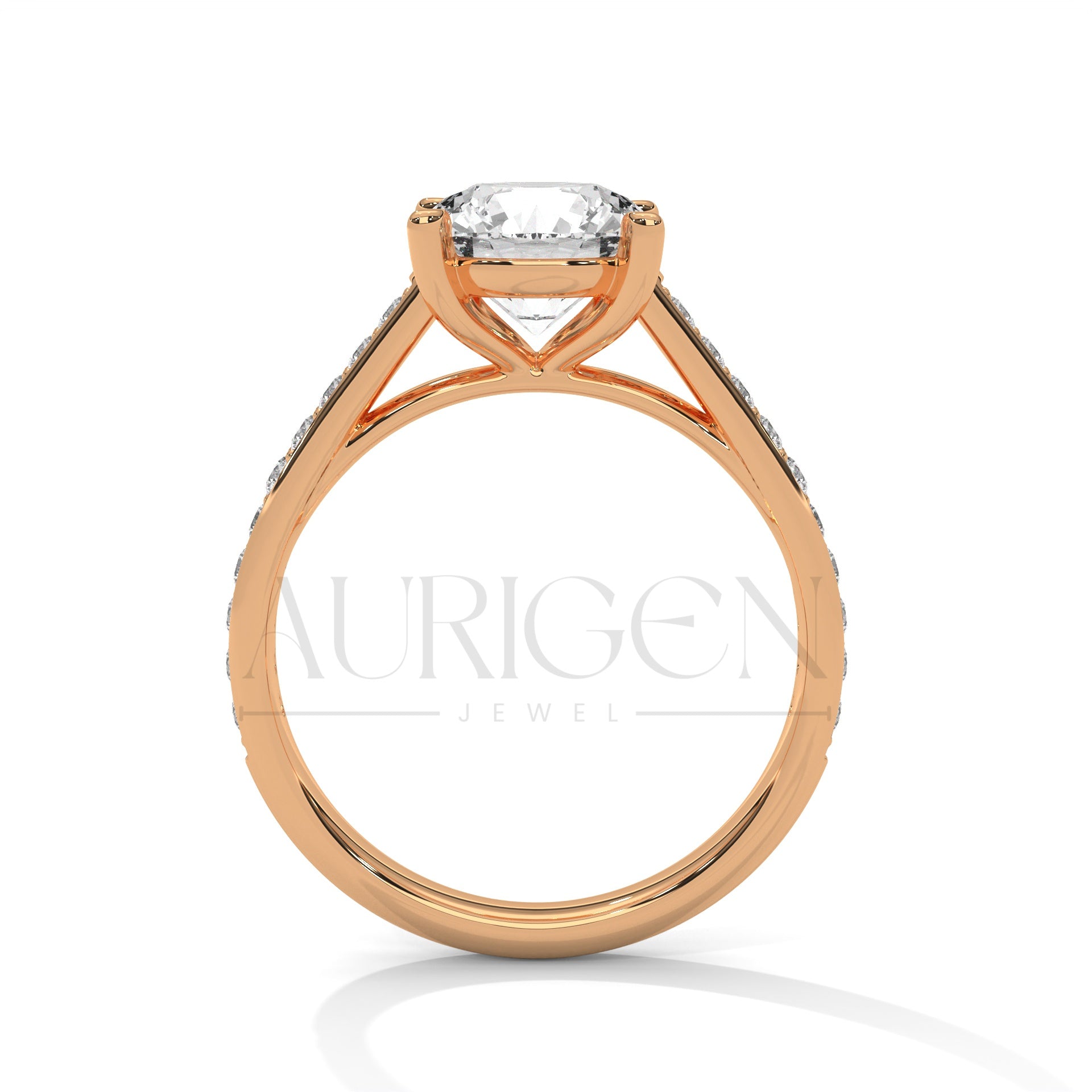 Round Cut Moissanite Diamond Ring with Pave Shank in 14K Solid Gold Engagement Ring