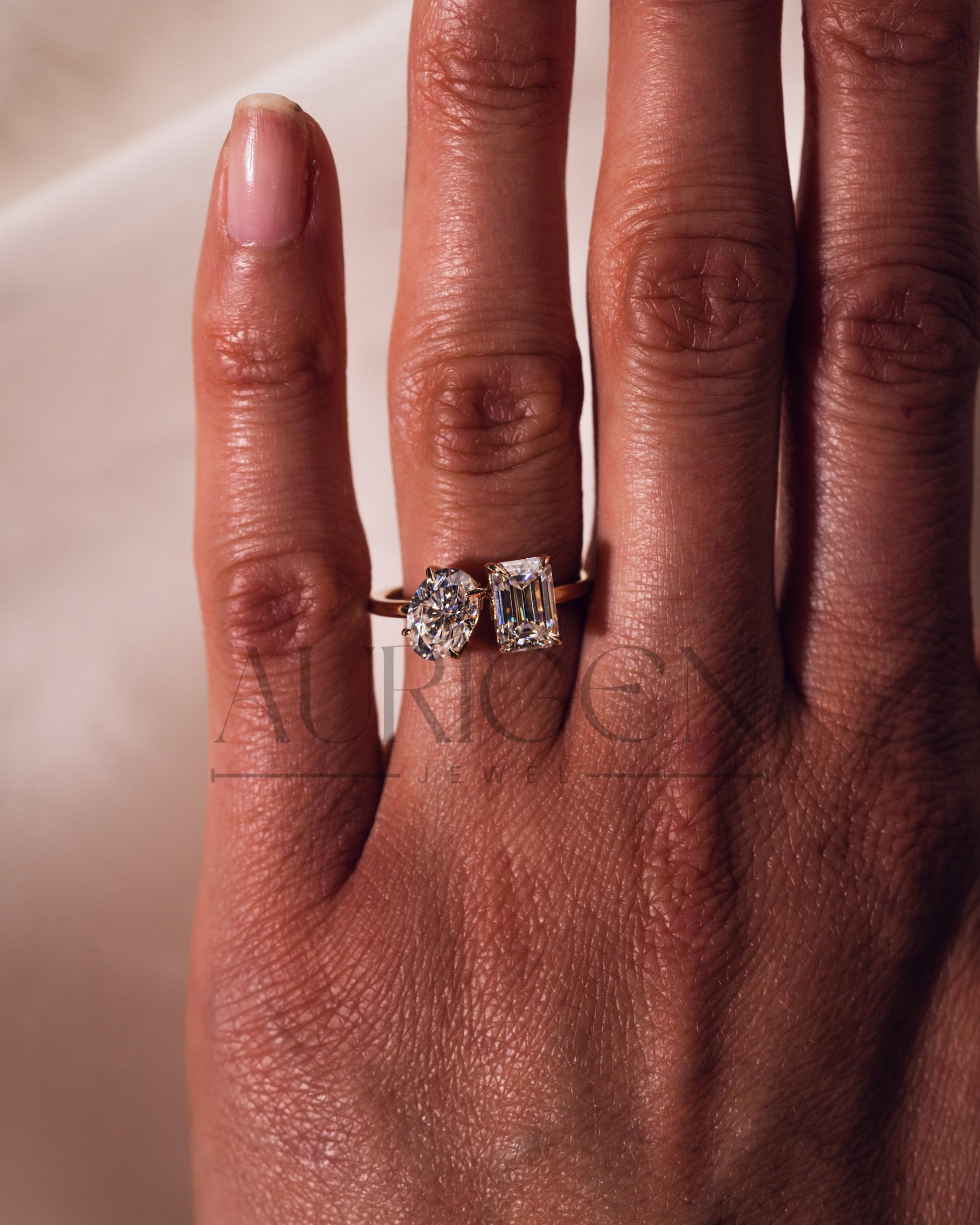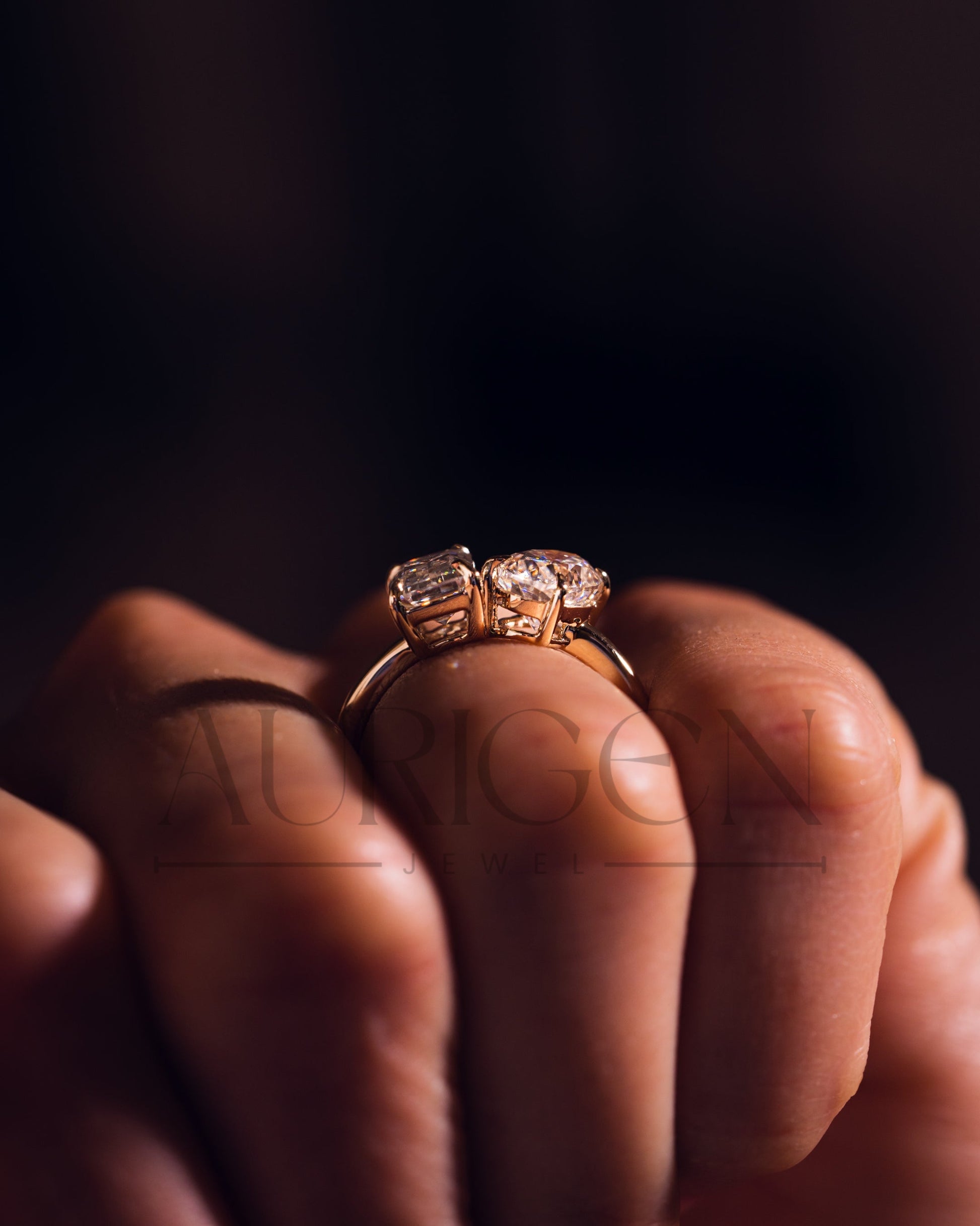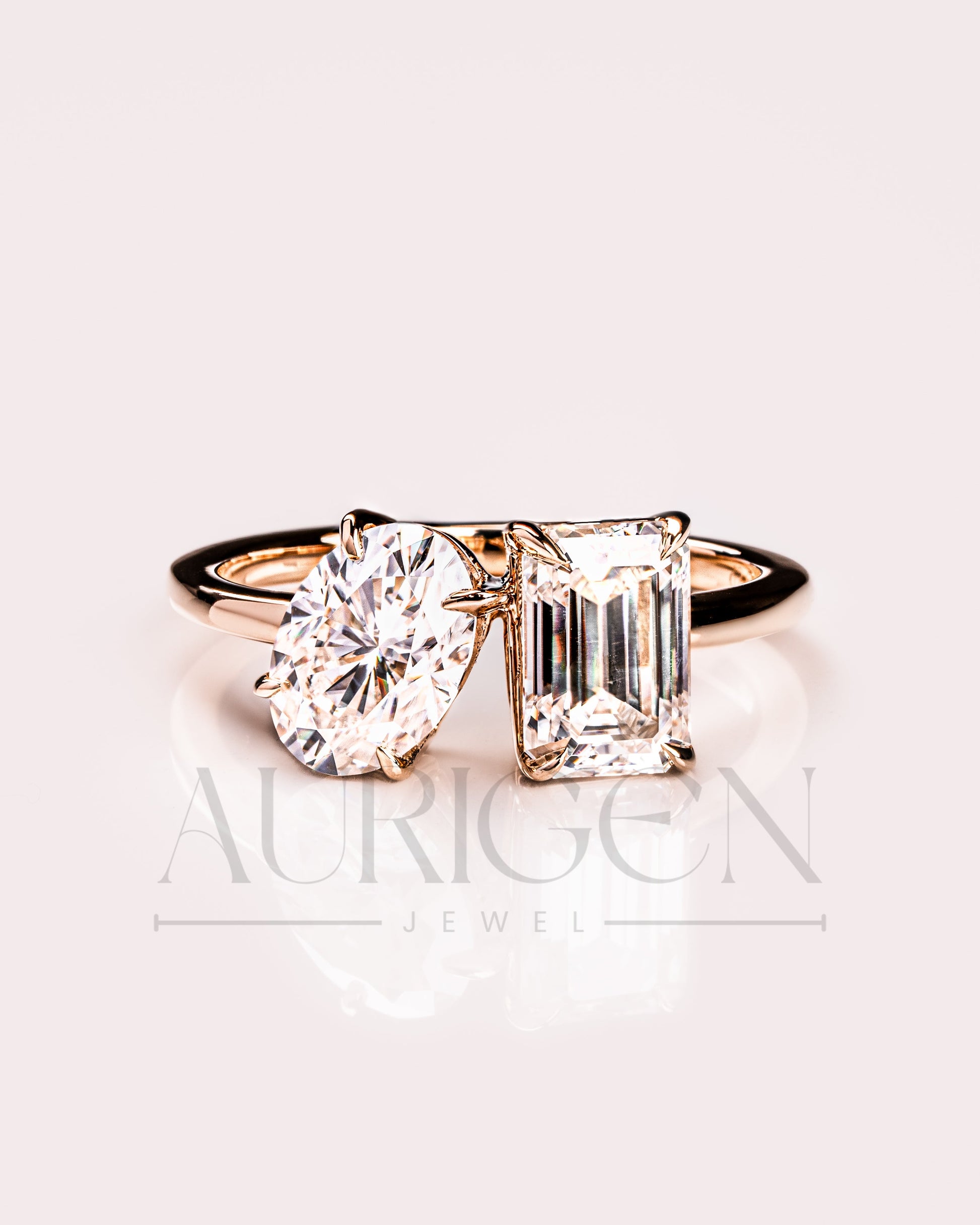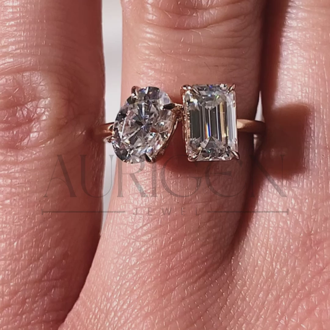 Two Stone Emerald and Oval Cut Moissanite and Lab Grown Diamond Ring