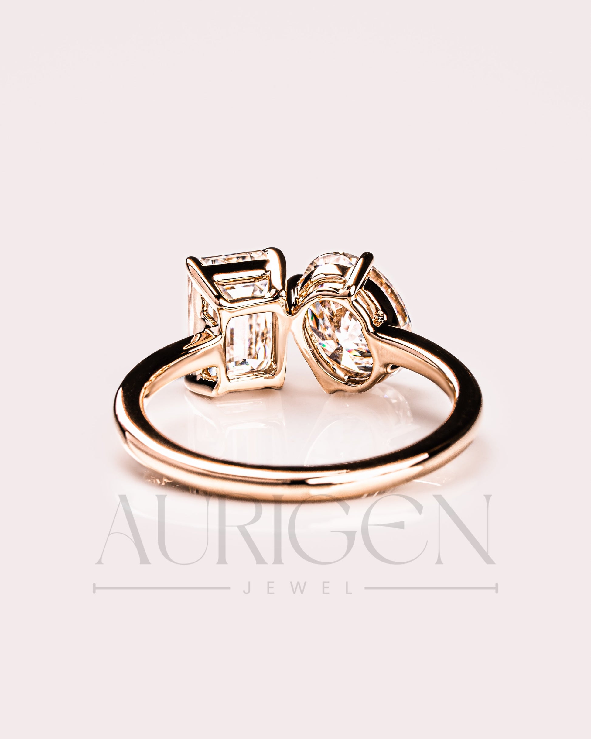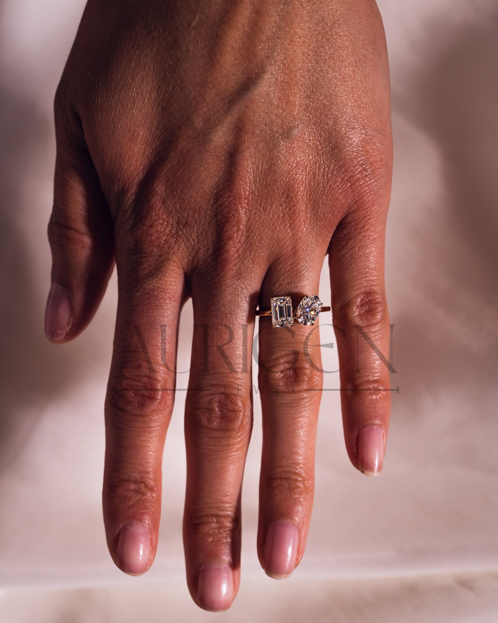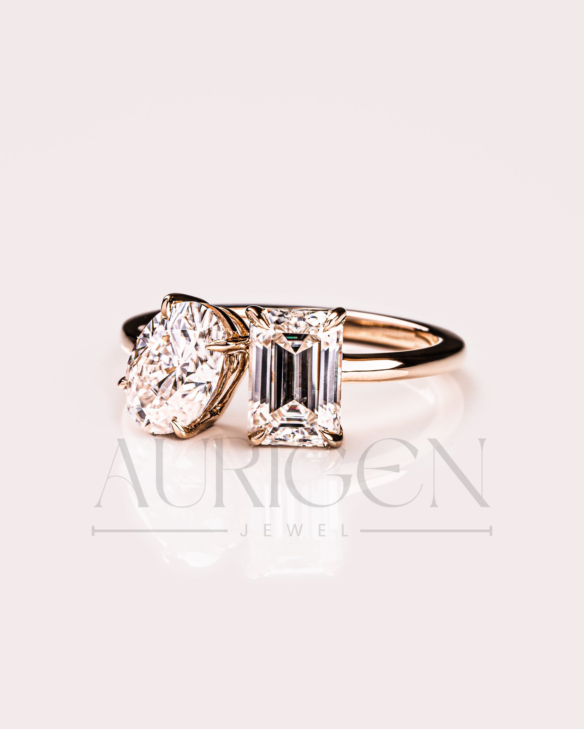 Two Stone Emerald and Oval Cut Moissanite and Lab Grown Diamond Ring