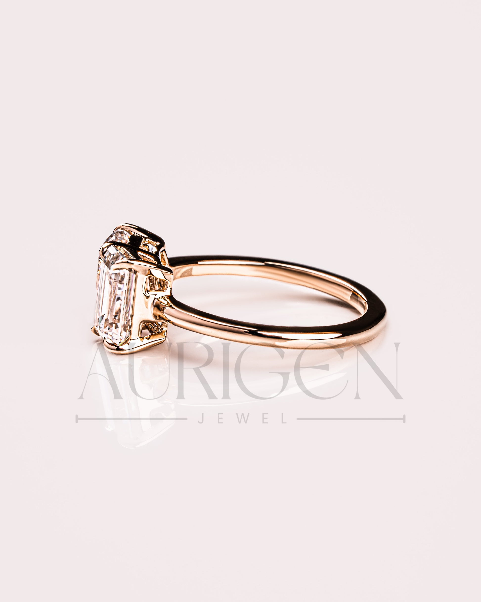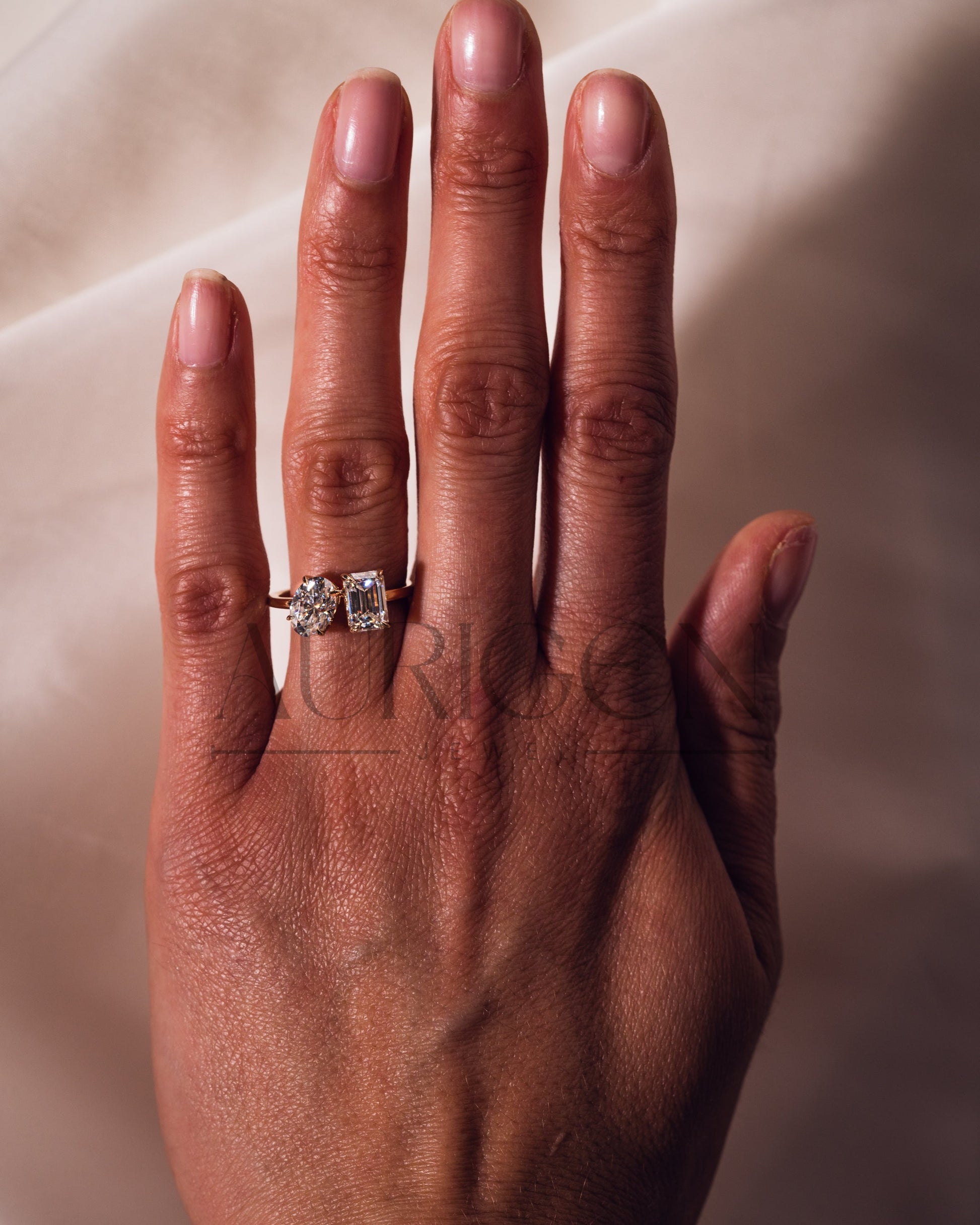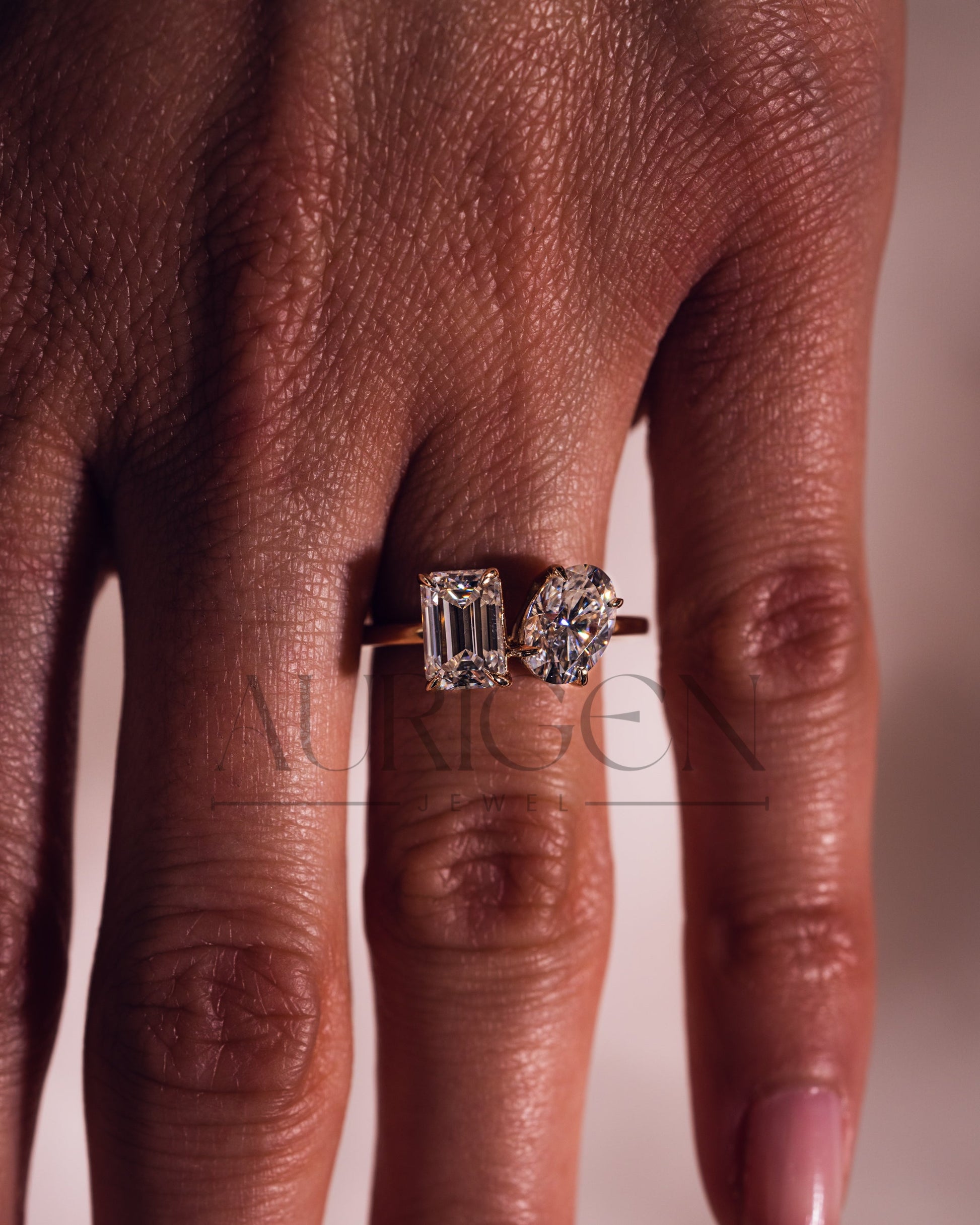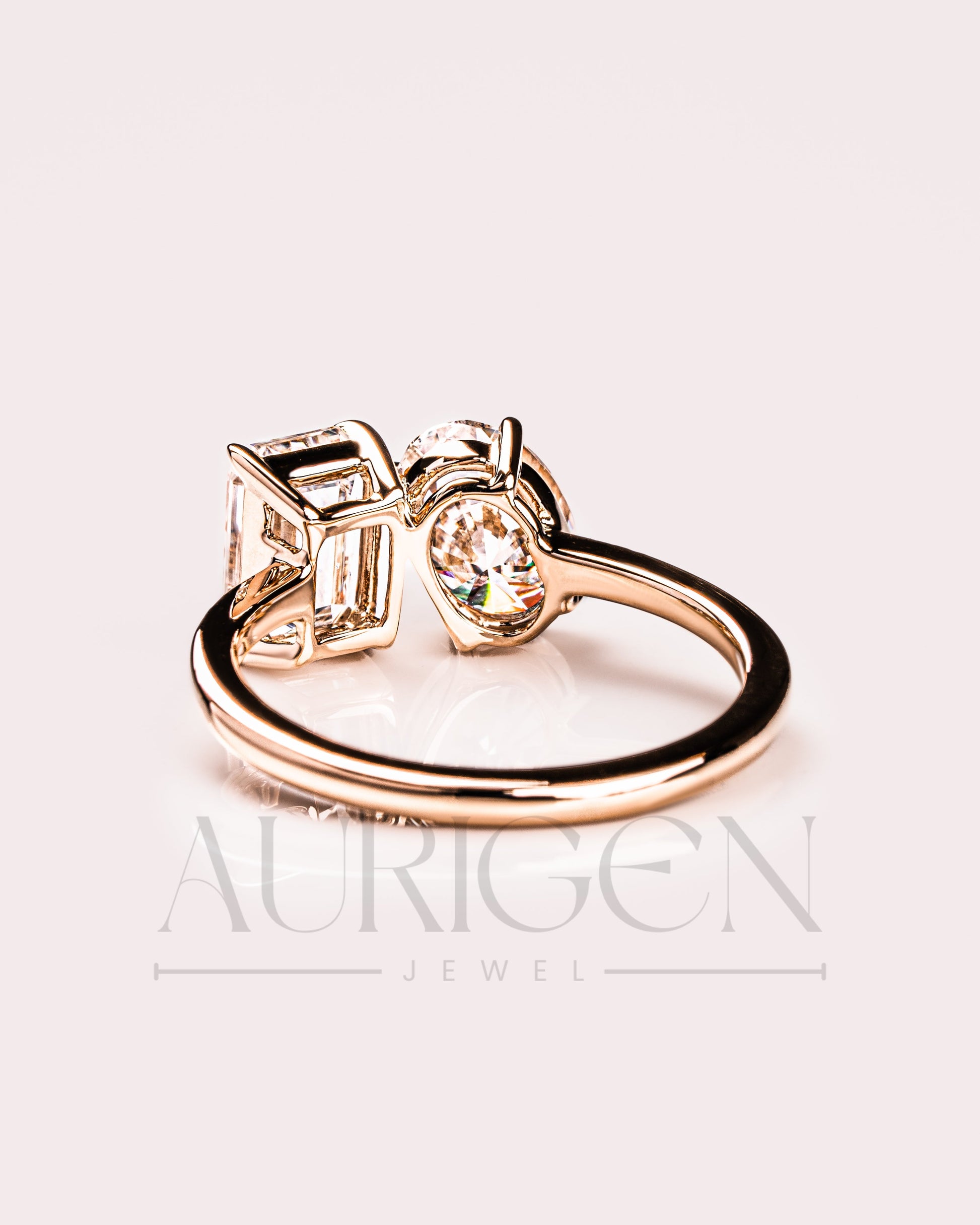 Two Stone Emerald and Oval Cut Moissanite and Lab Grown Diamond Ring
