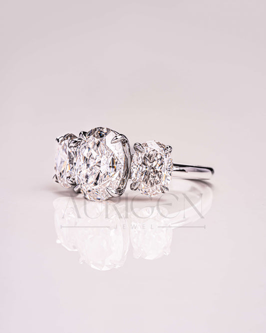 Three Stone Oval Cut Engagement Ring in Solid Gold – Ice Crushed Moissanite and Lab Diamond