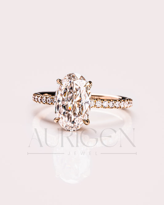 Brilliant Oval Cut Moissanite & Leb Grown Ring 4-Prong With Hidden Halo Diamond Ring