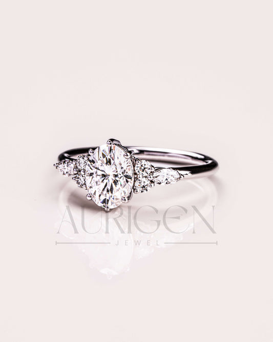Oval Cut Moissanite and Lab Grown Diamond 14K Solid Gold Ring – Six Prong & Side Stone