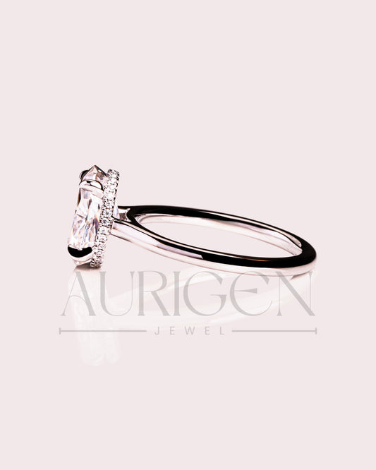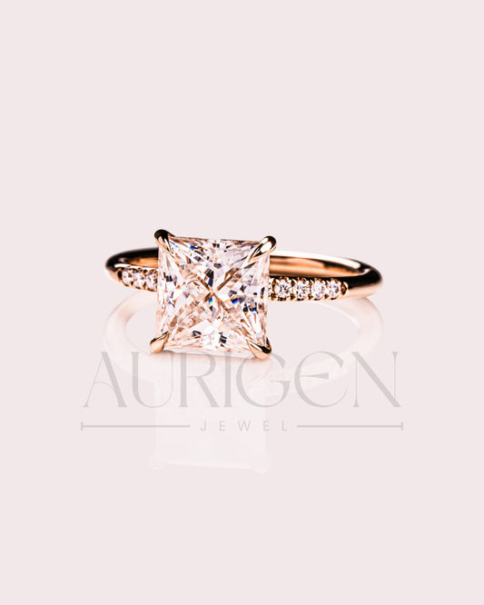 Princess Cut Moissanite & Leb Grown Engagement Ring with Hidden Halo and Side Diamond Ring