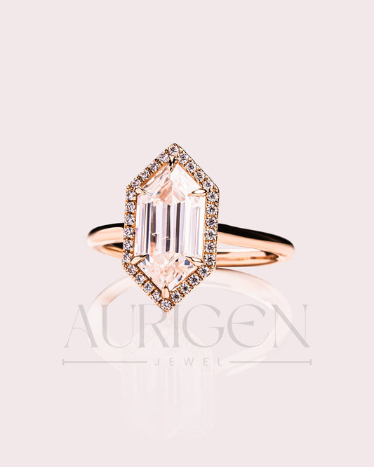 Elongated Hexagon Halo Moisanite and Leb Grown Diamond Engagement Ring 14K Rose Gold