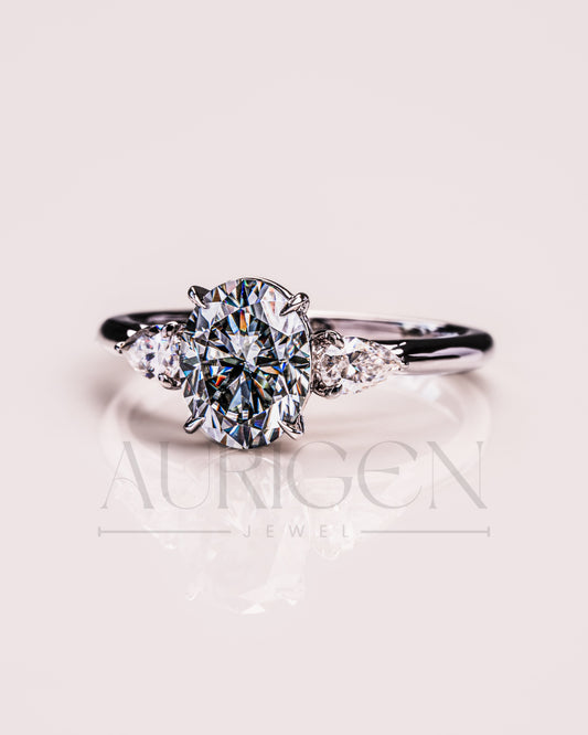 Oval & Pear Cut Moissanite and Leb Grown Three-Stone Ring in 14k White Gold