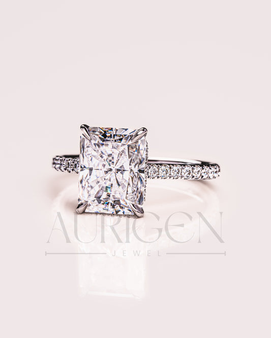 Radiant Cut Moissanite and Leb Grown Engagement Ring with Hidden Halo and Pave Setting Ring