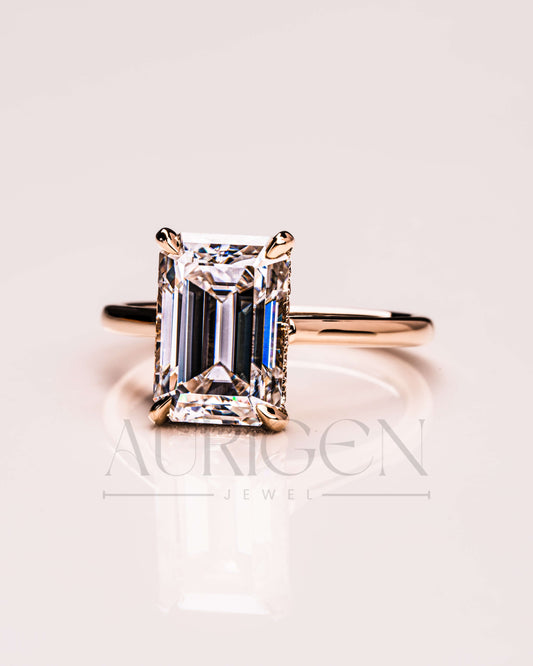 Emerald Cut Moissanite and Lab Grown Diamond Ring With Hidden Halo