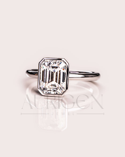 Bezel Setting Minimalist Emerald Cut Diamond Ring 14K White Gold Solitaire Ring