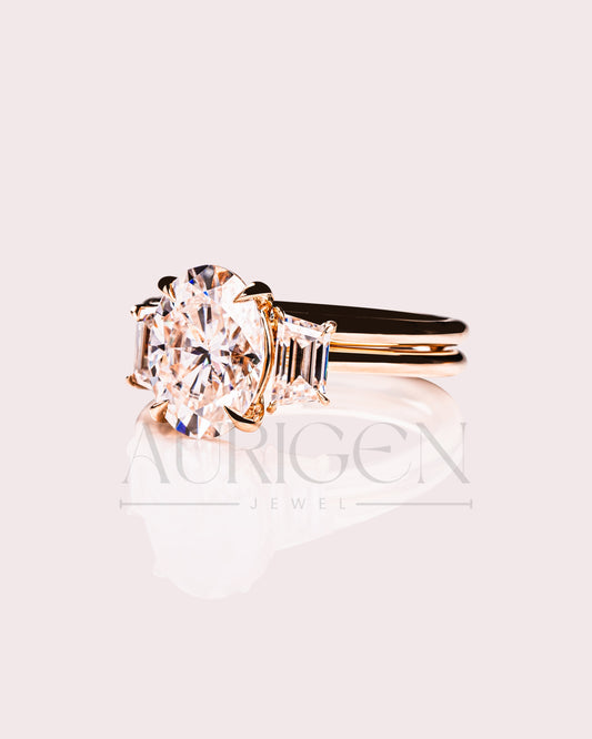 Oval & Trapezoid Moissanite & Leb Diamond Engagement Ring Set 14K Solid Gold