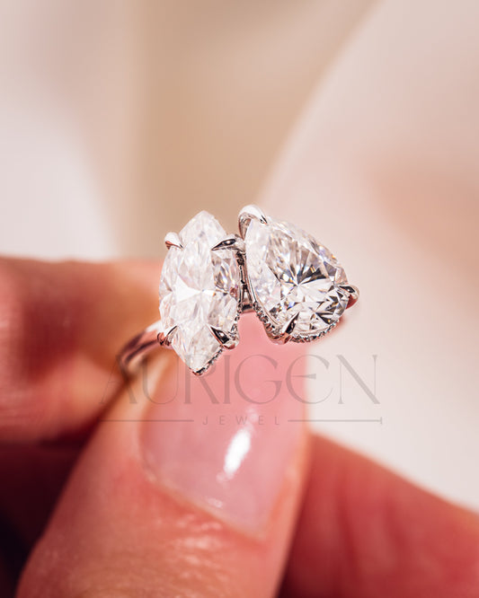 Marquise & Pear Moissanite and Leb Toi et Moi and Hidden Halo Ring 14K White Gold