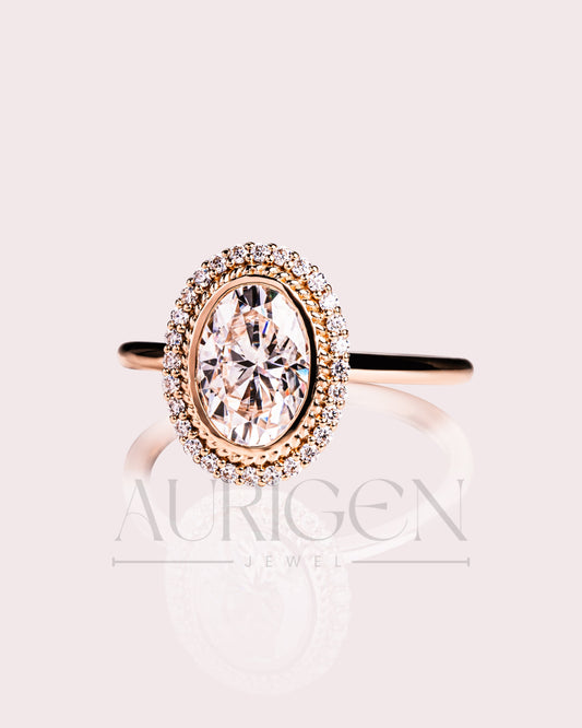 Moissanite and Lab Grown Diamond- Oval Cut Bezel Setting Ring With Halo