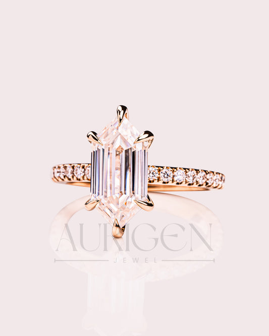Elongated Hexagon Moissanite and Leb Ring Hidden Halo with Pave Band 14K Rose Gold