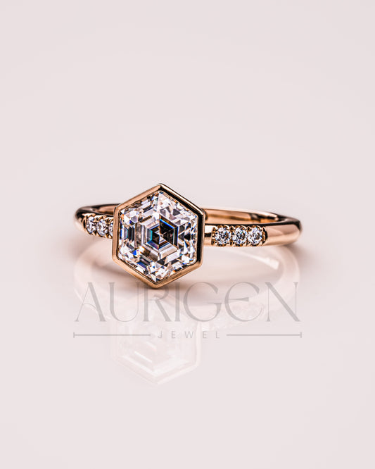 Bezel Setting Hexagon Cut Moissanite and Lab Grown Diamond Ring in 14K Rose Gold